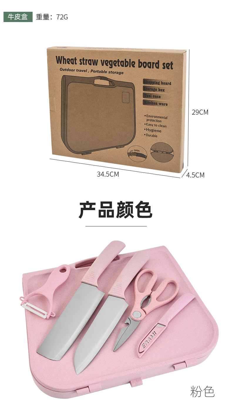 Lugar de fábrica al por mayor paja de trigo de acero inoxidable juego de seis piezas de cuchillo maleta con tabla de cortar juego de cuchillos de cocina caja de regalo