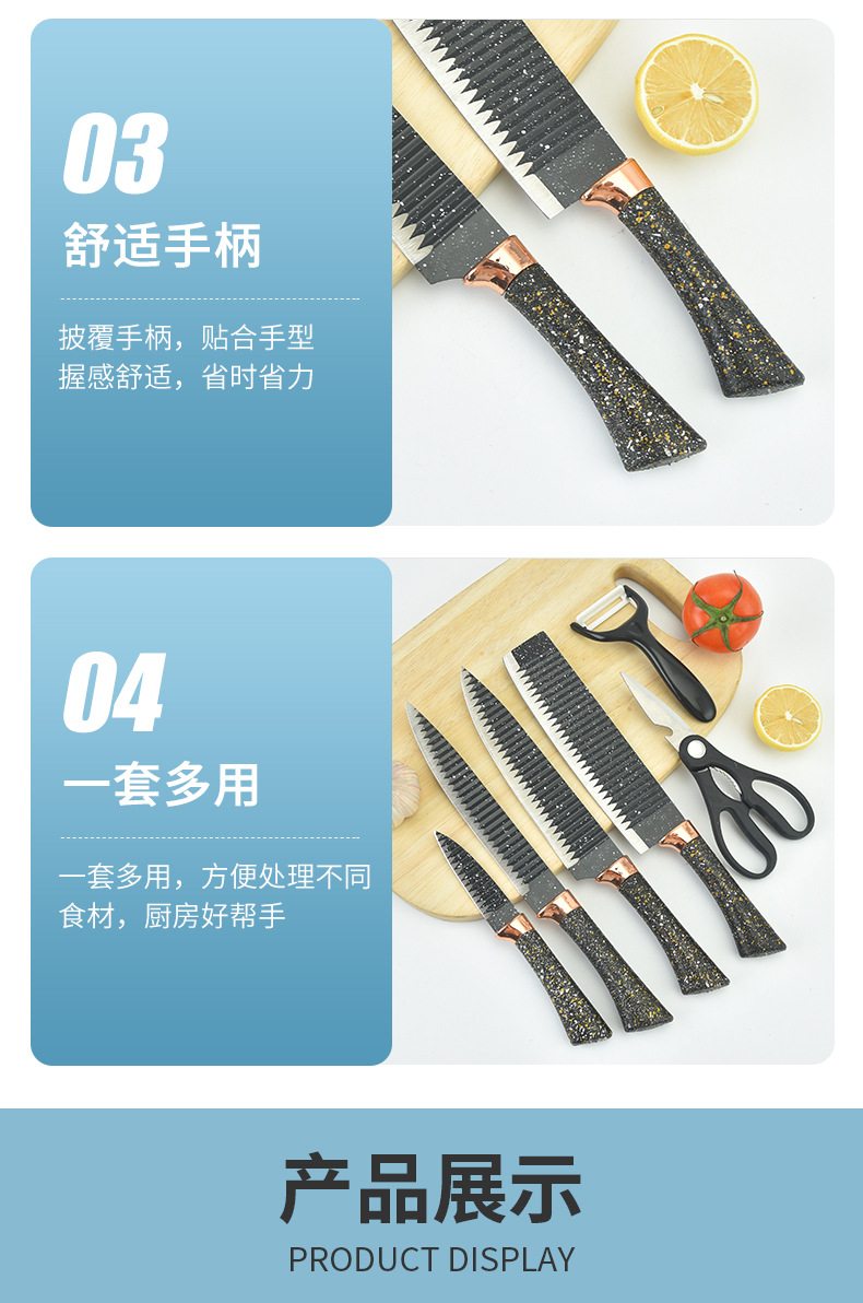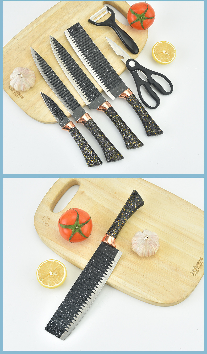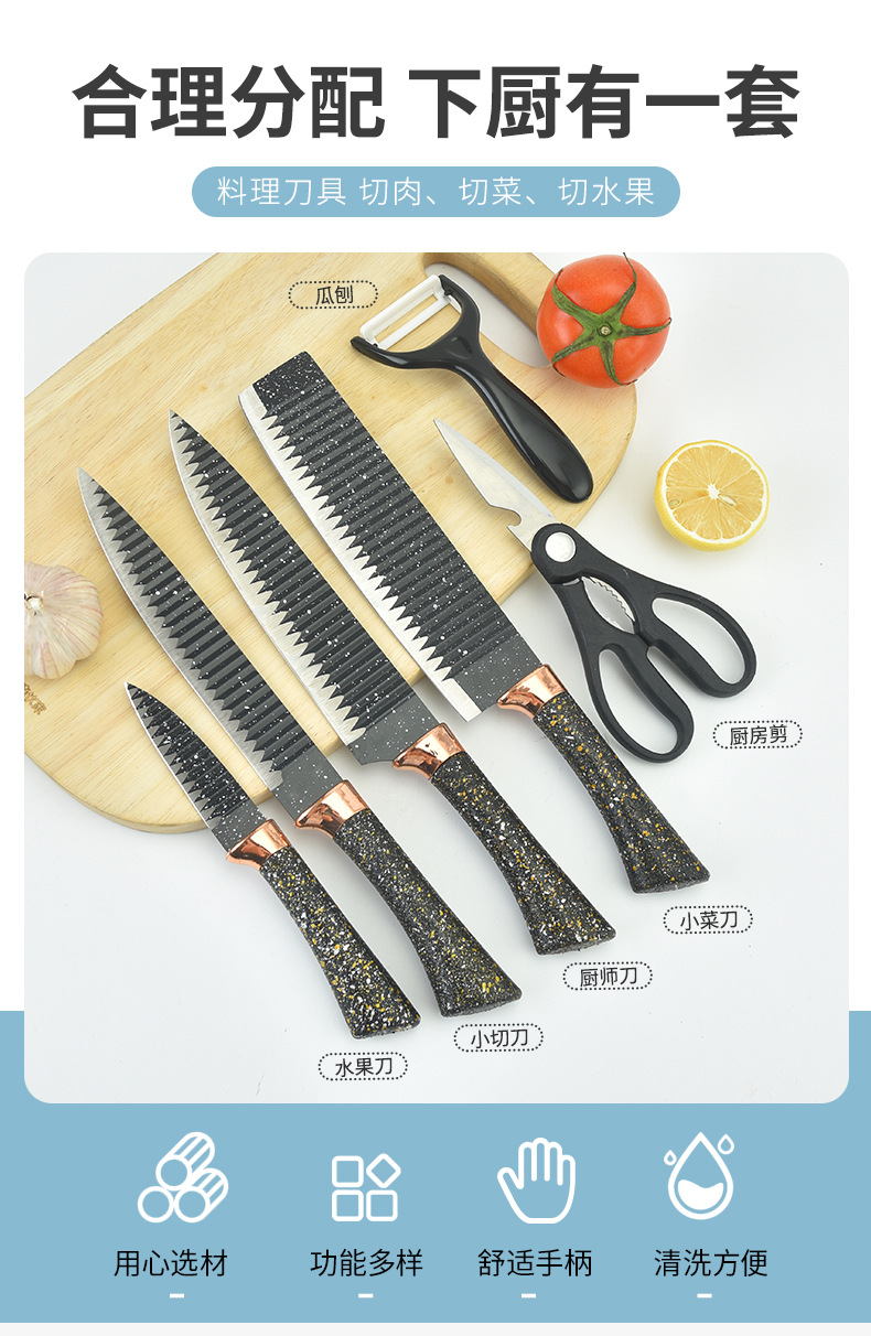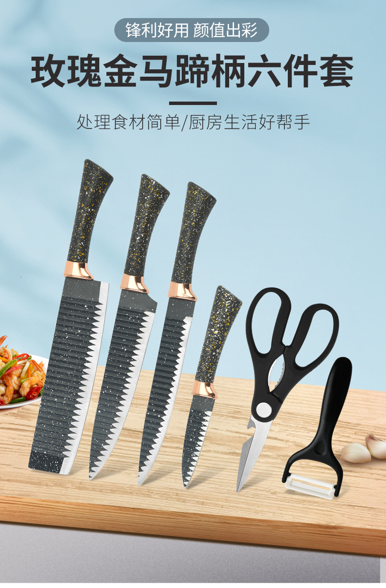 Transfronteriza de alta calidad caliente oro rosa agua ondulación cuchillo de cocina de seis piezas conjunto hogar cuchillo de cocina traje de comercio exterior cuchillo y tijeras