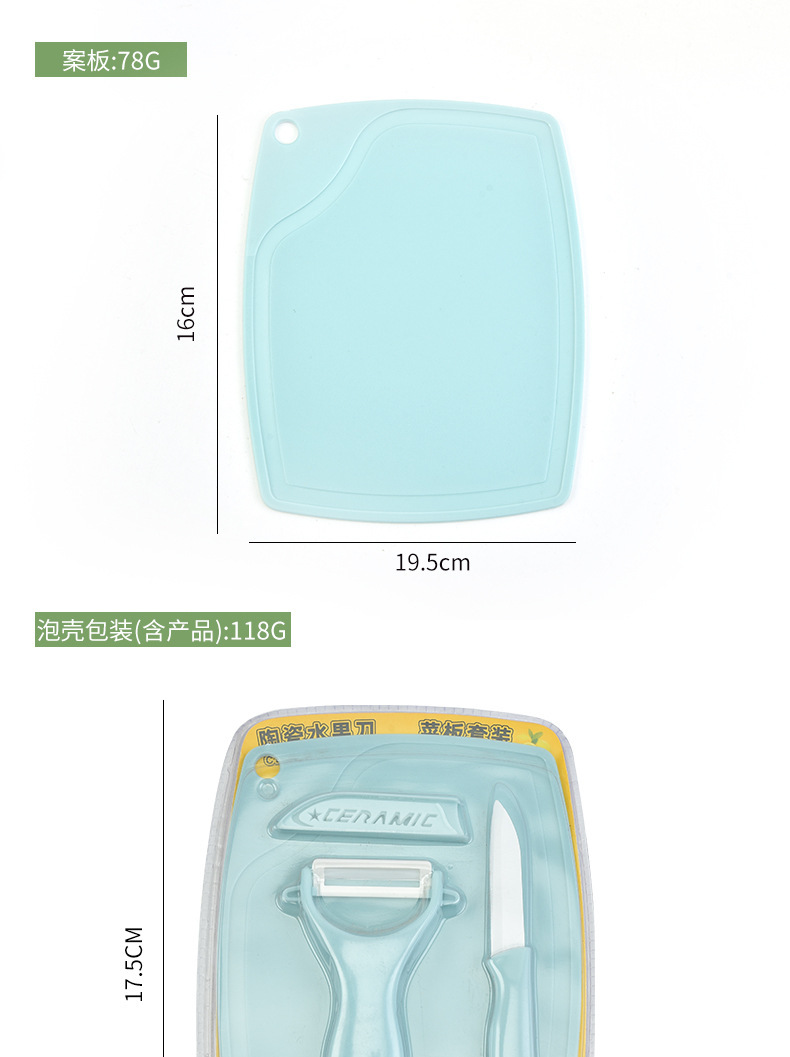 Suplemento de alimentos para bebés traje de fruta cuchillo de cerámica de tres piezas tabla de cortar melón Cepilladora cuchillo combinación de doble cara tarjeta de color de embalaje