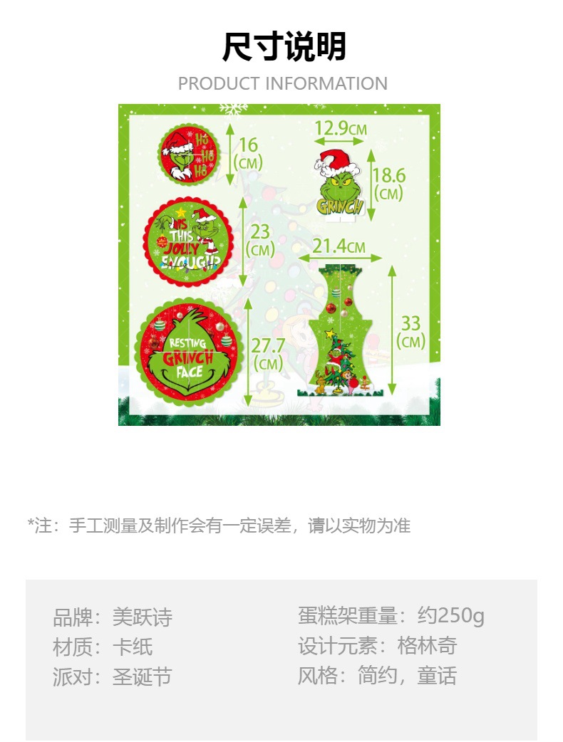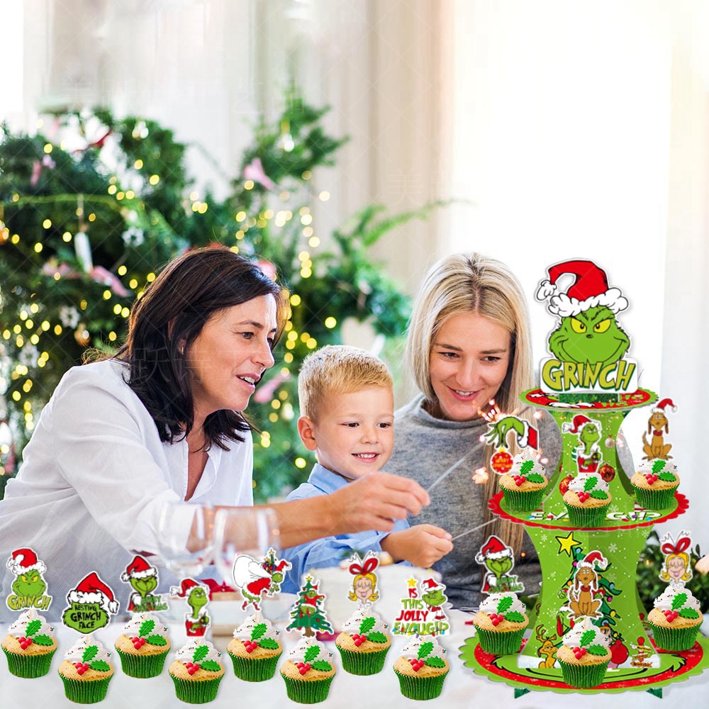Decoración de fiesta de Navidad de Europa y América Grinch multi-capa titular de la torta de piel verde monstruo de inserción de tarjeta de pastel postre decoración de la Mesa