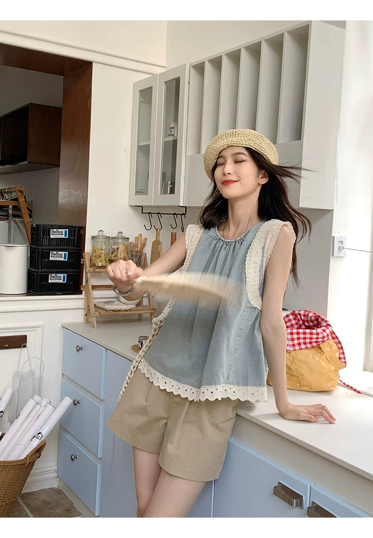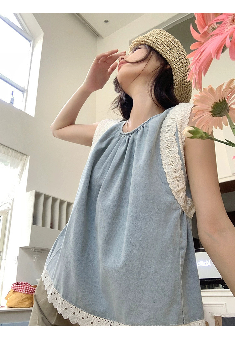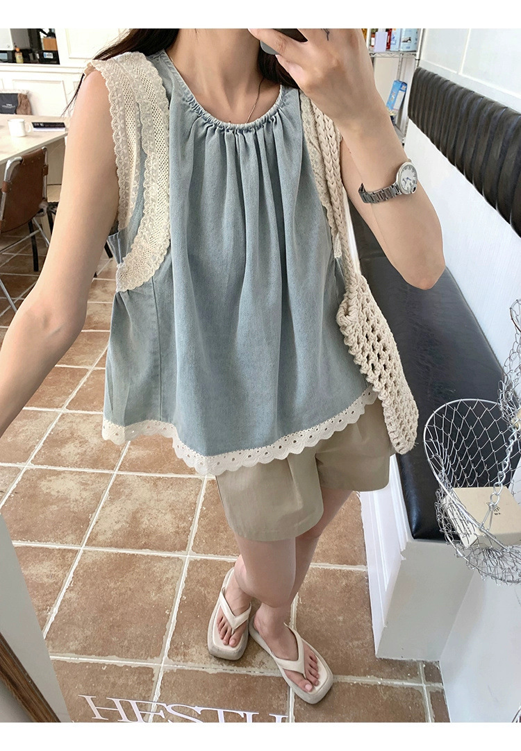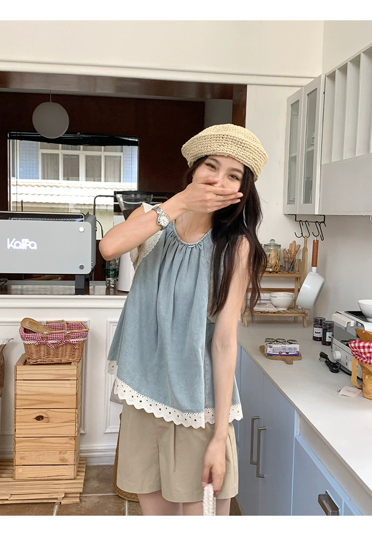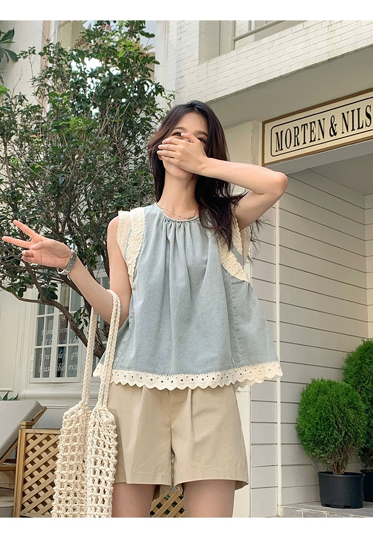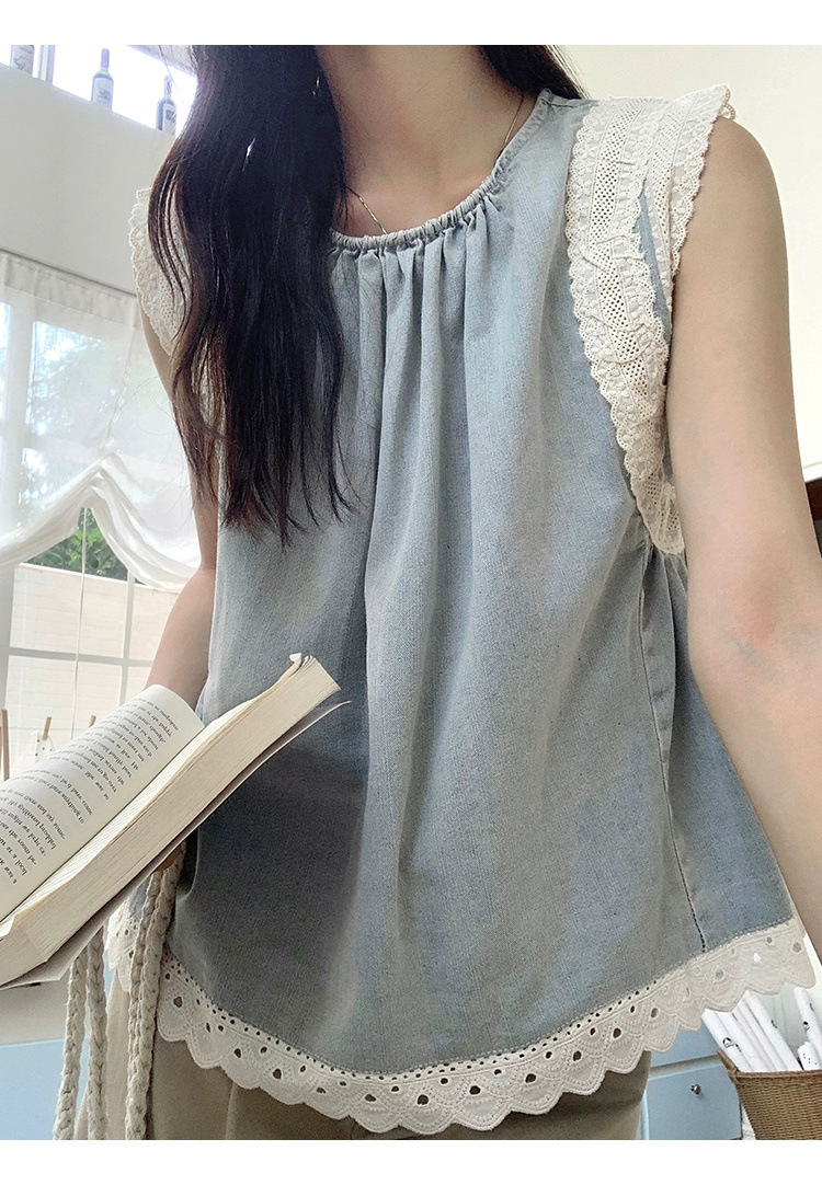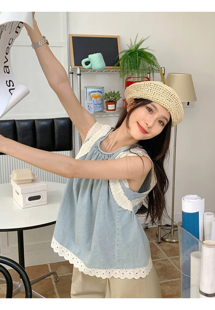 Top de mezclilla con costuras de encaje retro de verano de moda