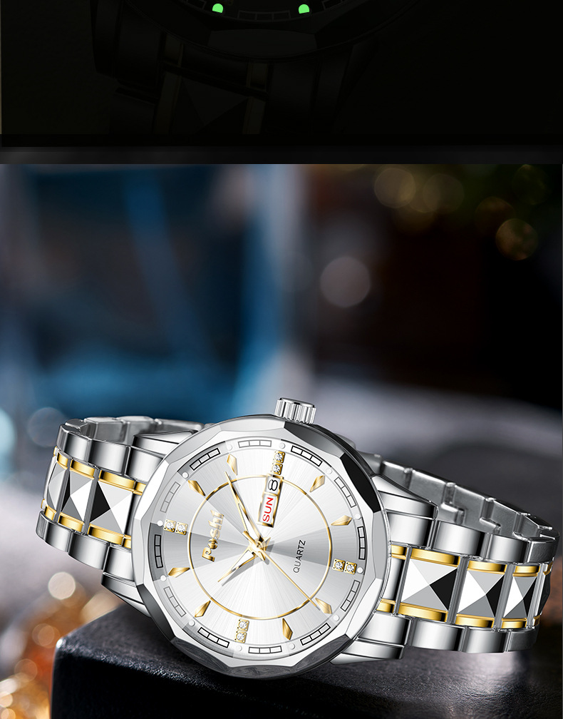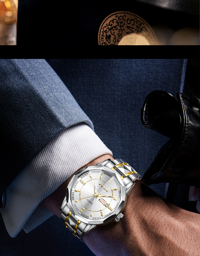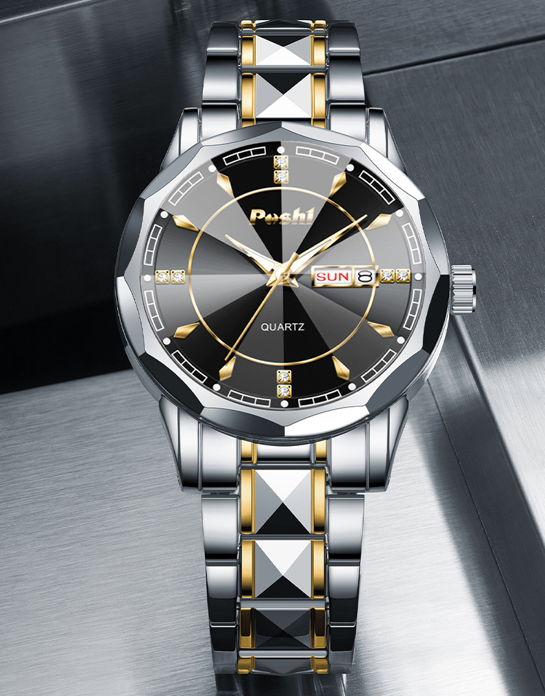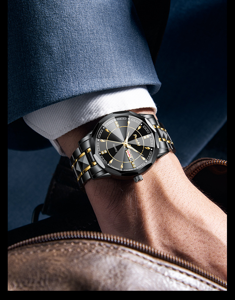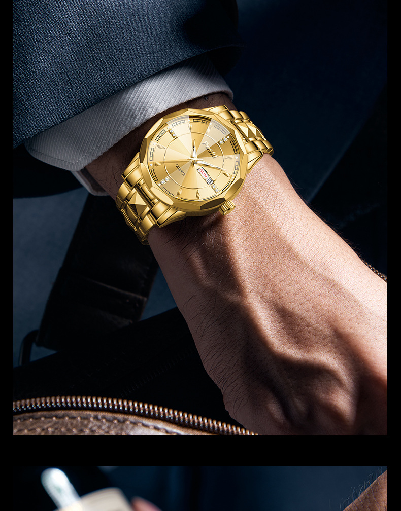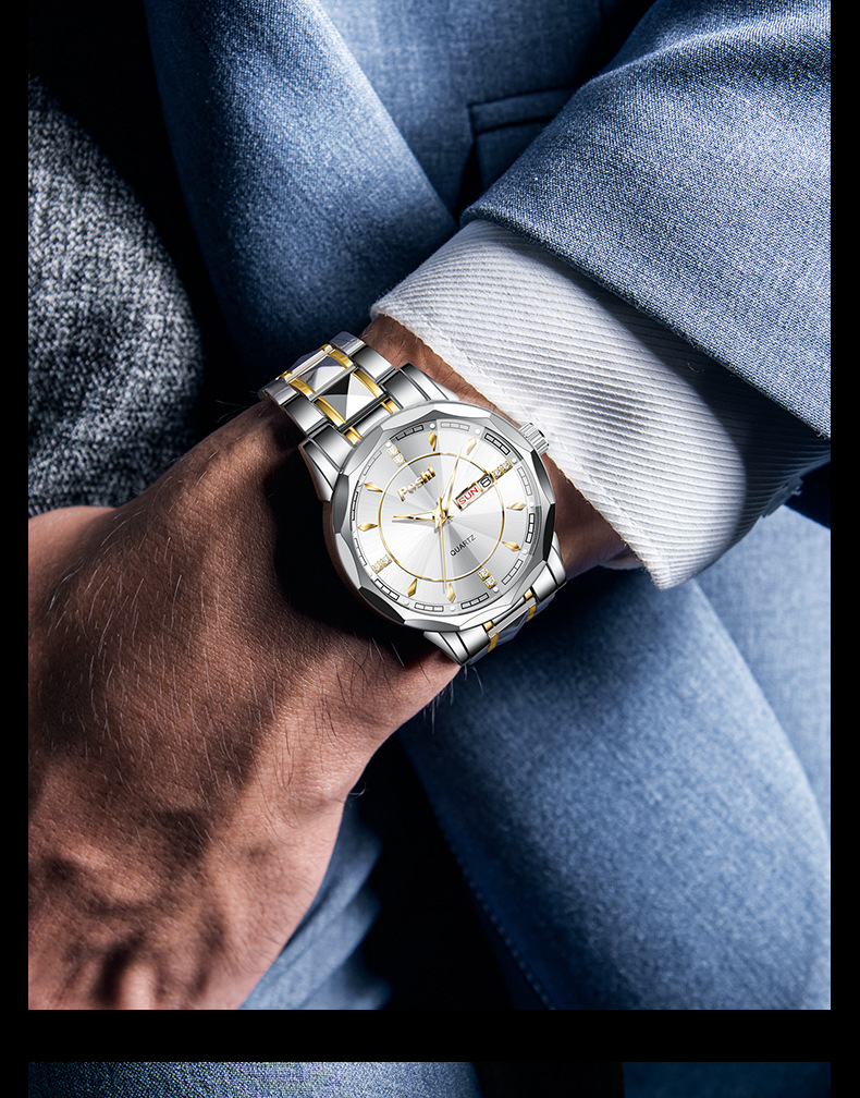 2025 nuevo reloj para hombre, reloj de calendario doble luminoso impermeable, reloj de cuarzo para hombre, cristal puntiagudo en forma de diamante