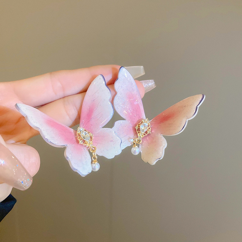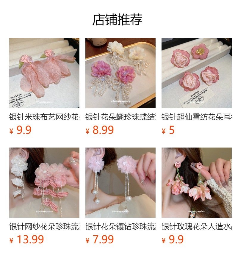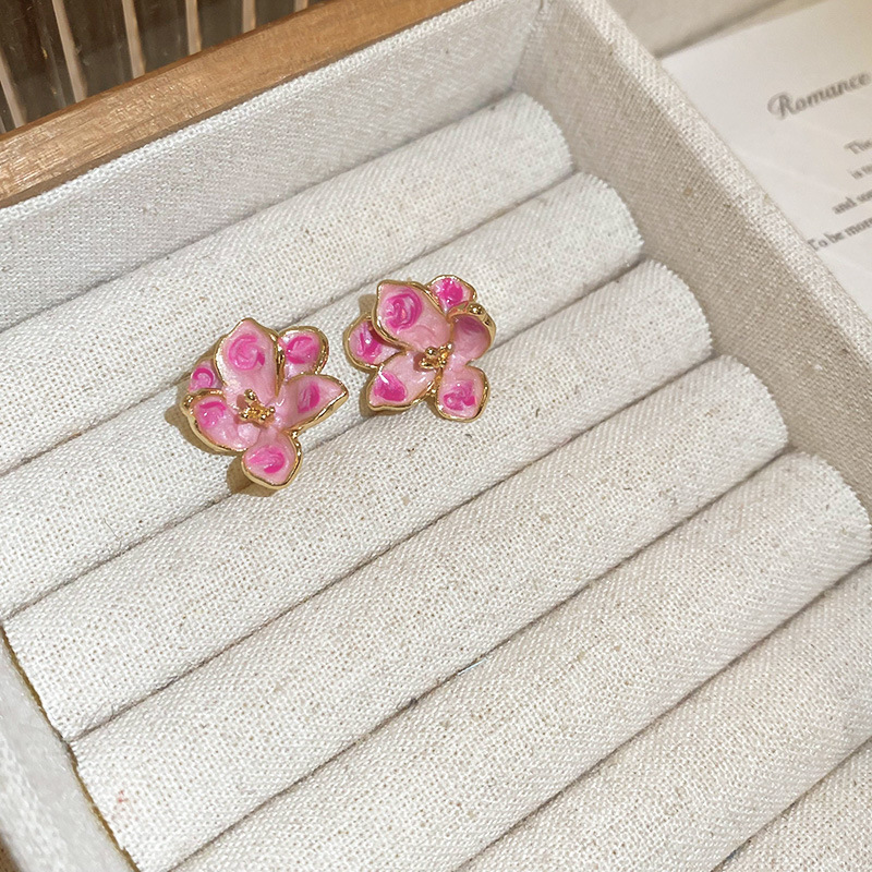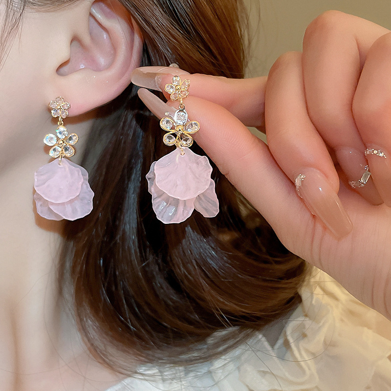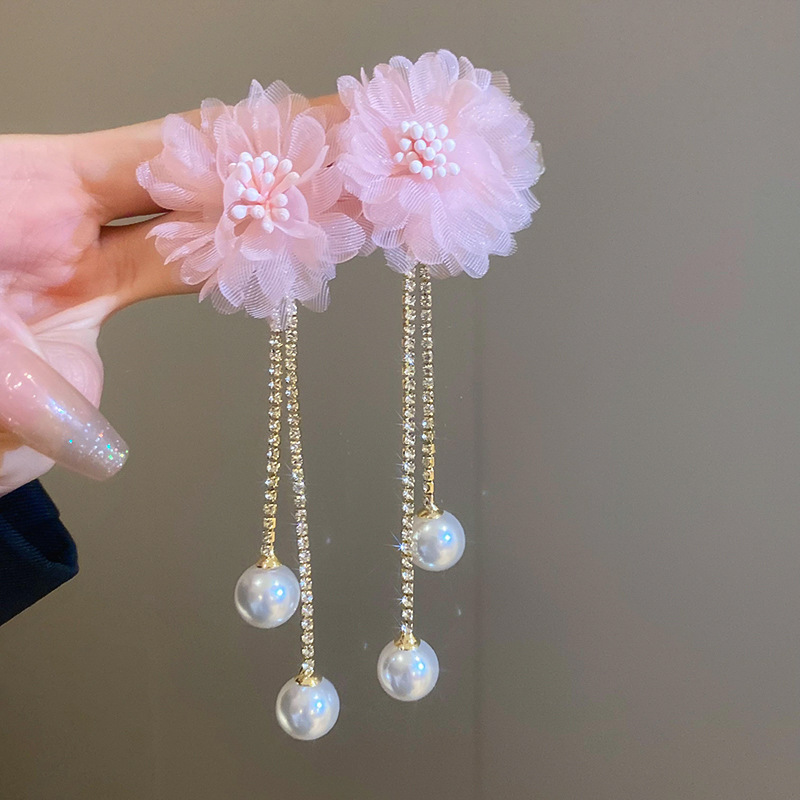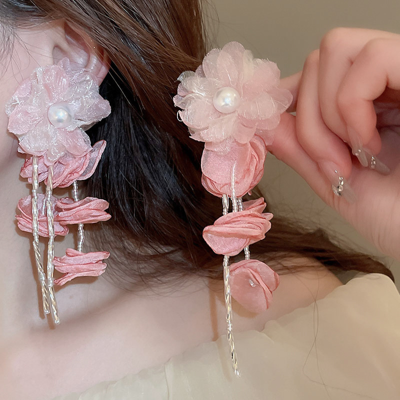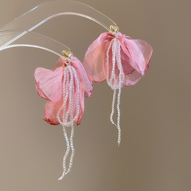 Pendientes de borla de cristal de hilo de malla de pétalo de aguja de plata Pendientes de estilo de vacaciones de playa dulce rosa Pendientes de moda de temperamento Mujer