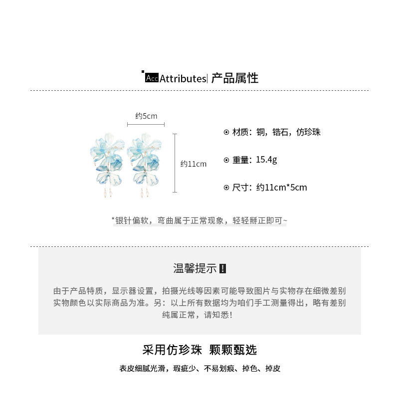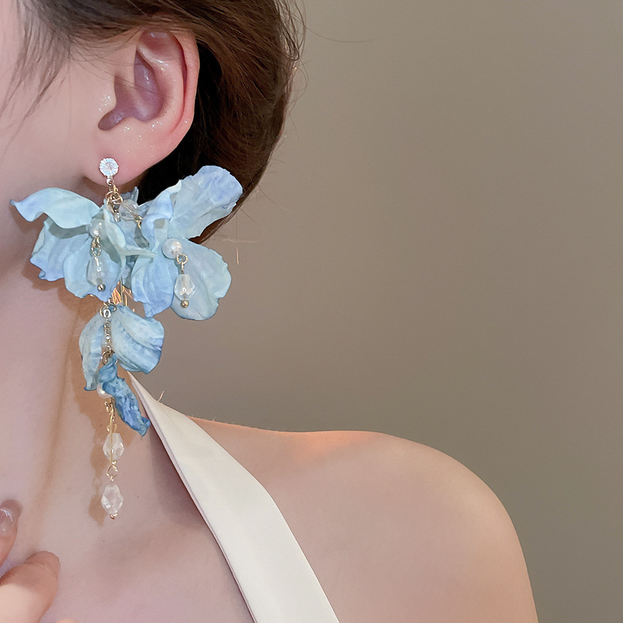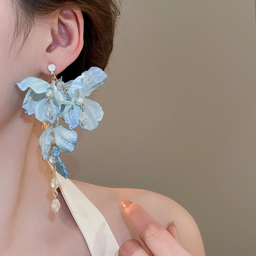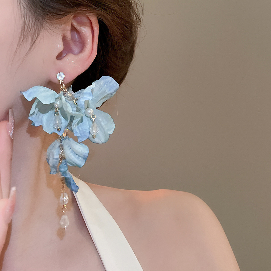 Aguja de plata, tela de circón, flores, borlas, pendientes de perlas, pendientes de estilo de vacaciones junto al mar, pendientes de todo fósforo, sentido de clase alta de nicho