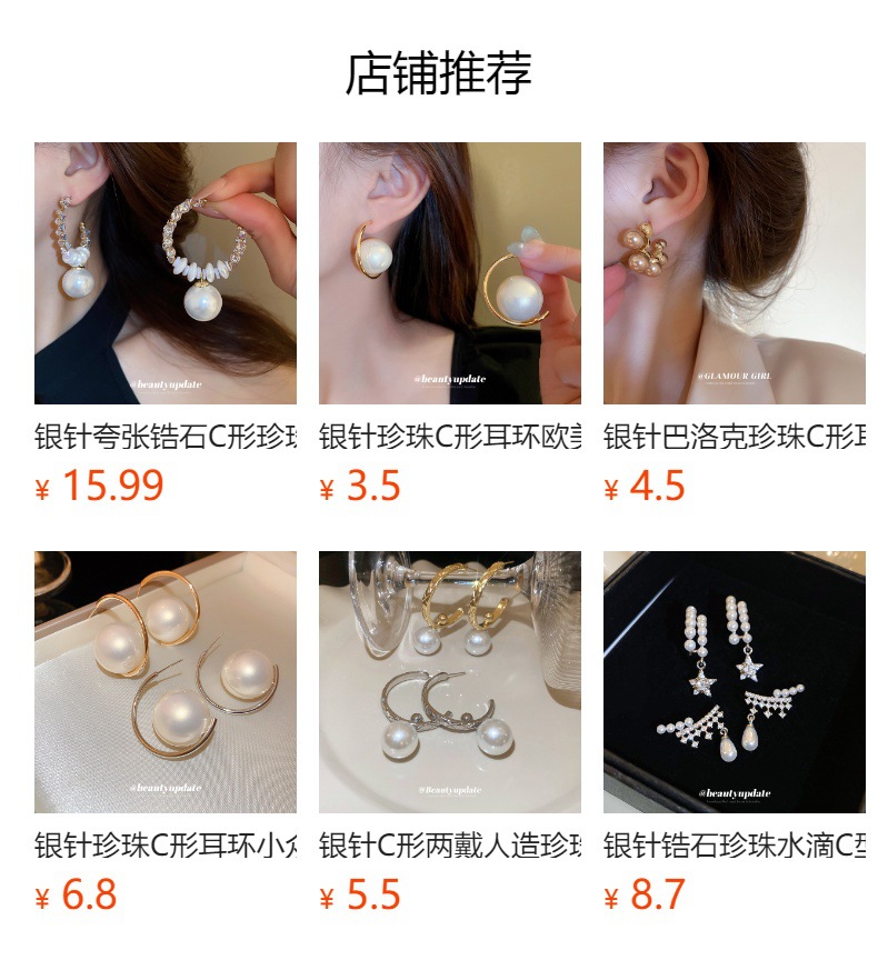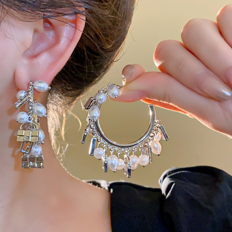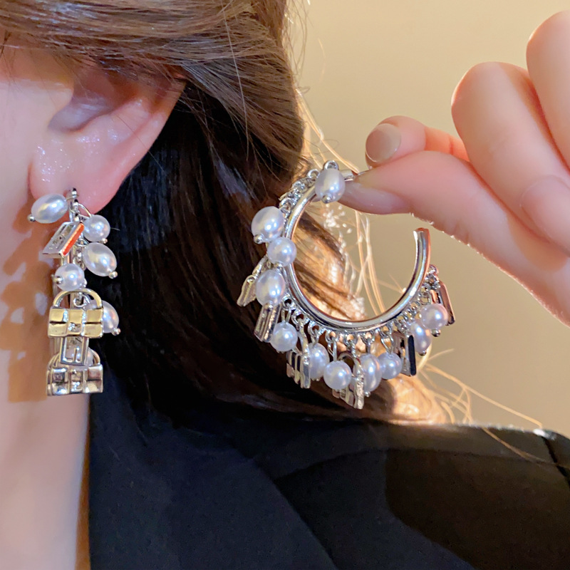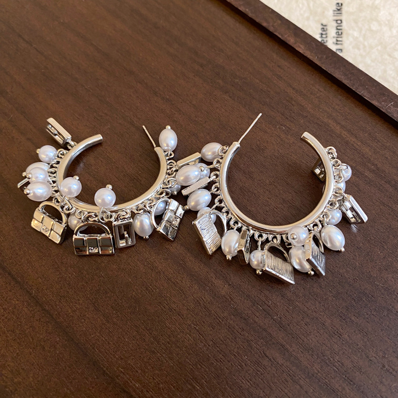 Aguja de plata Bolso en forma de C exagerado europeo y americano Pendientes de perlas Pendientes de moda retro Lujo ligero Pendientes de todo fósforo de alta gama Mujeres
