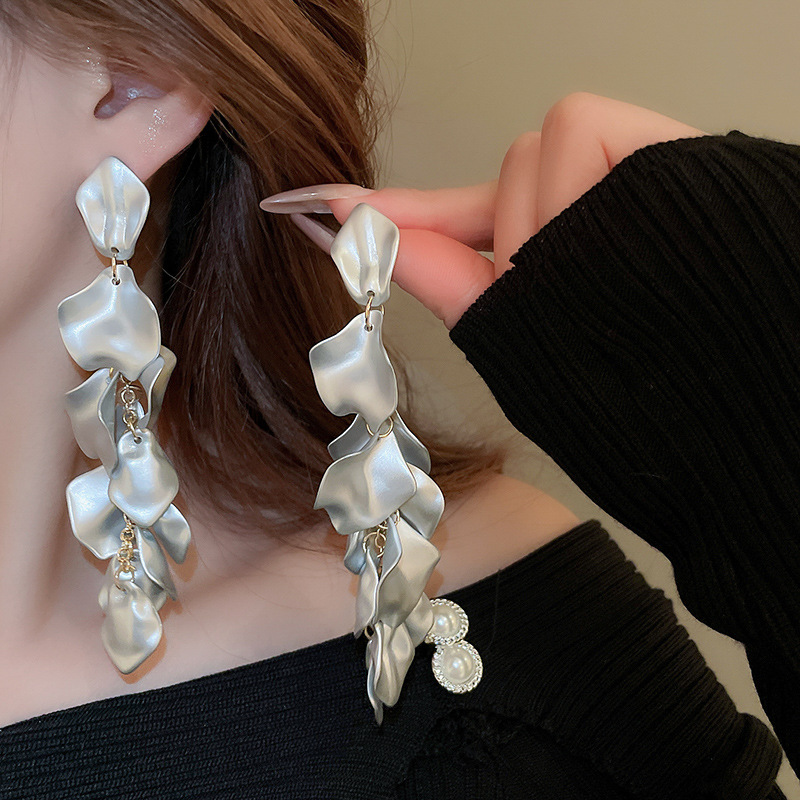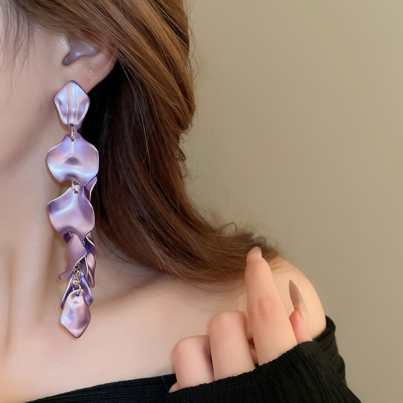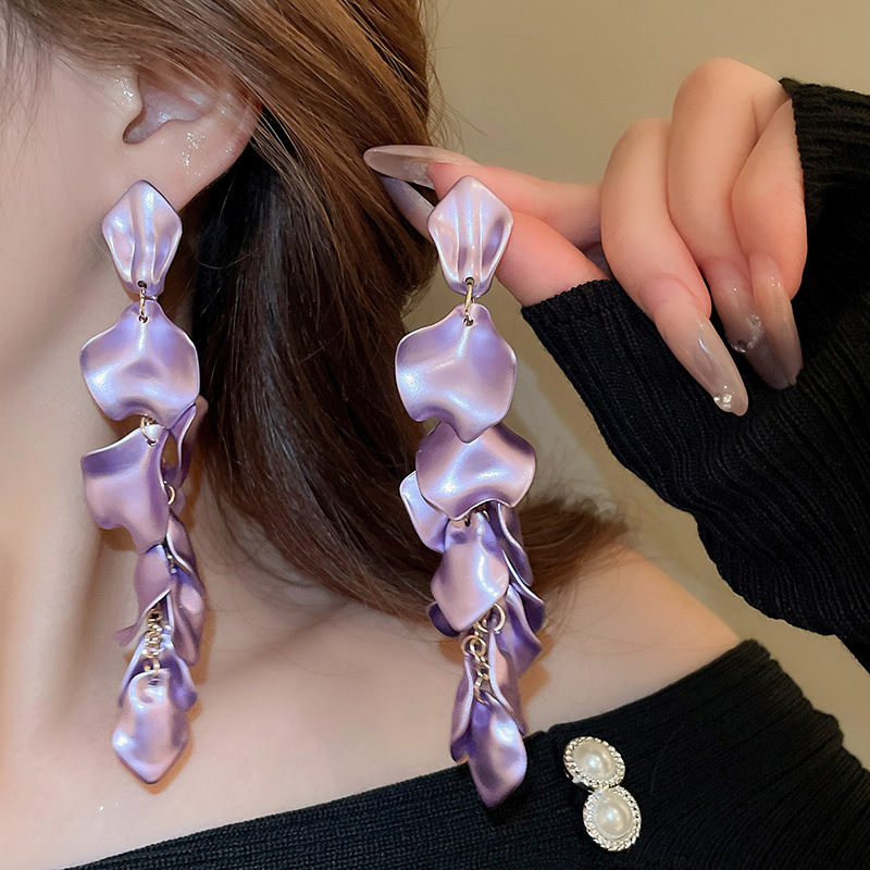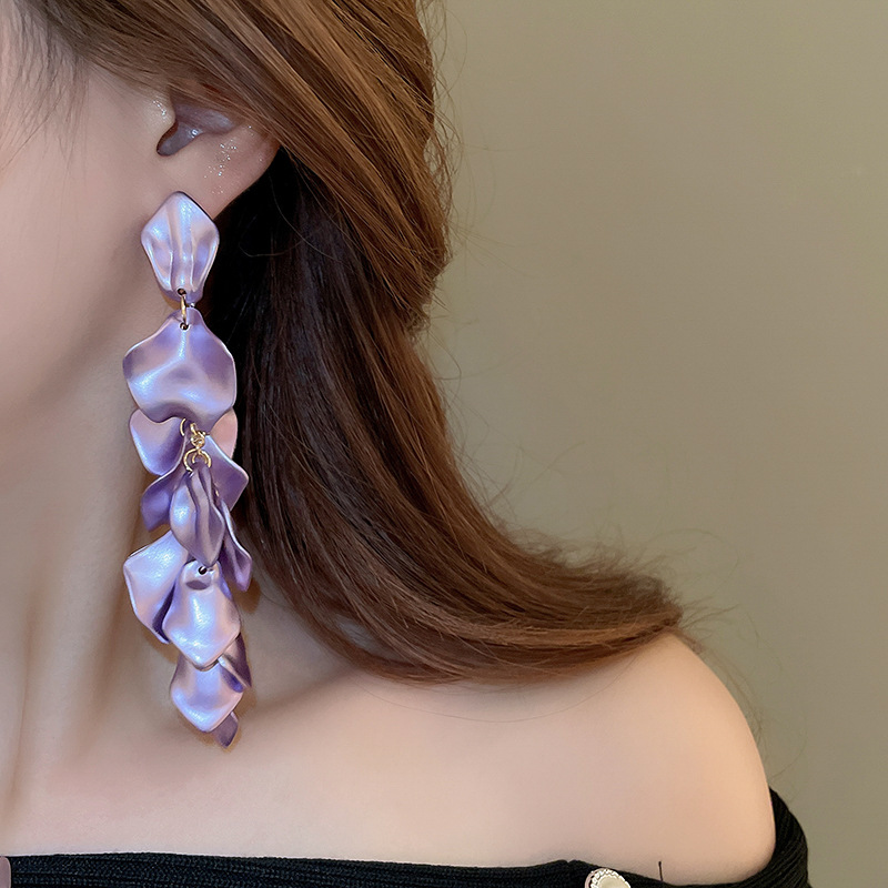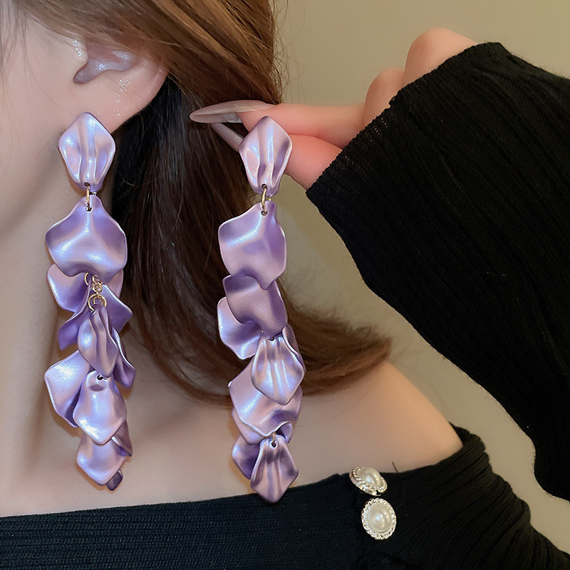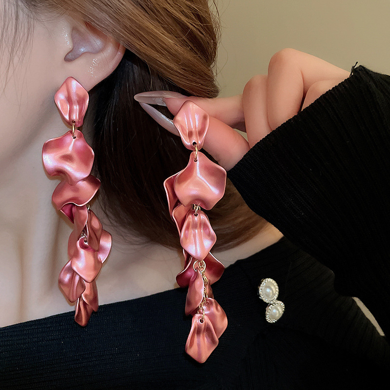 Pendientes de borla de pétalos plisados largos de dopamina con aguja de plata