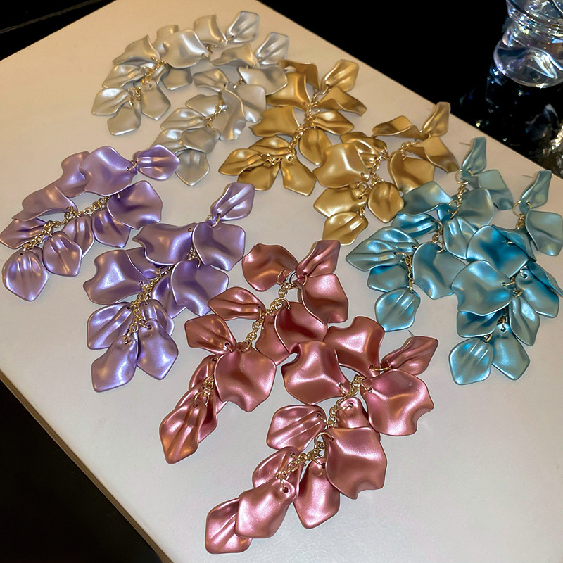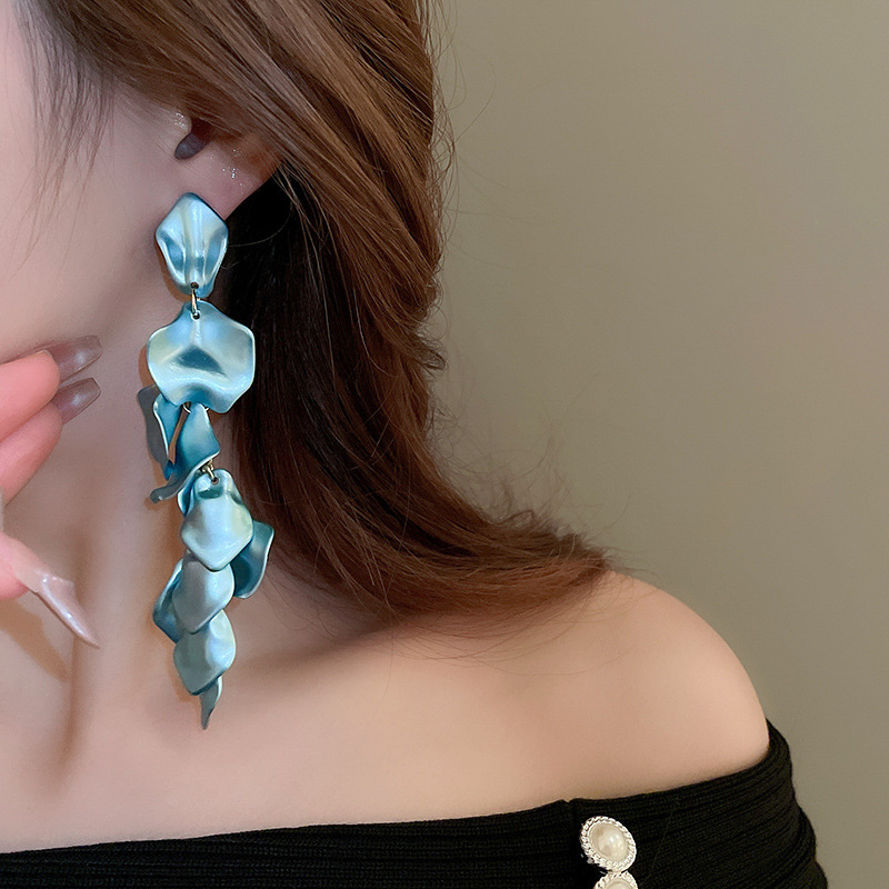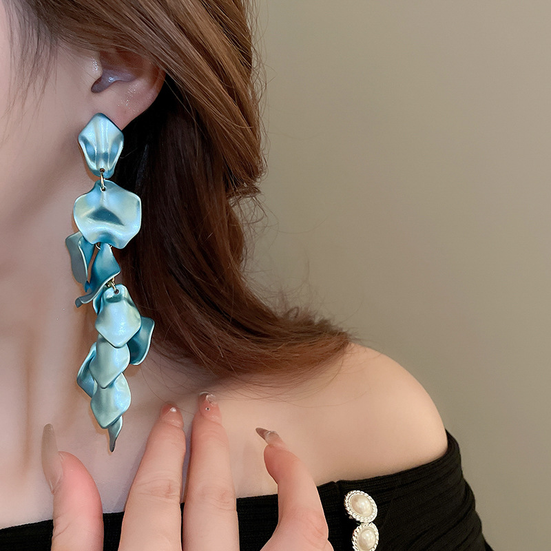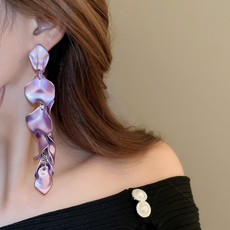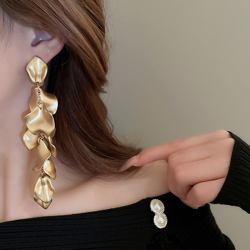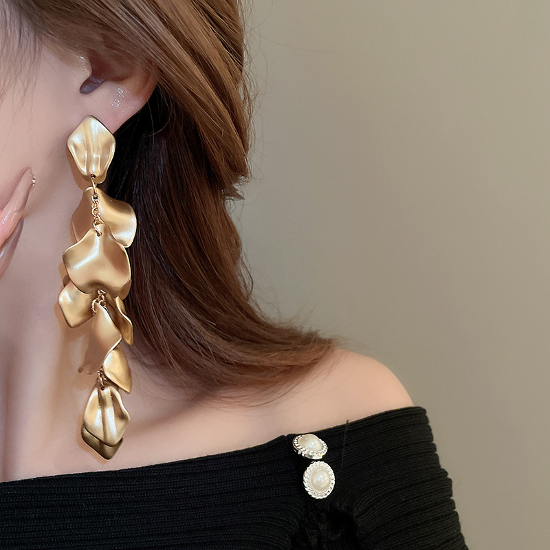 Pendientes de borla de pétalos plisados largos de dopamina con aguja de plata