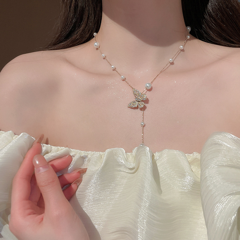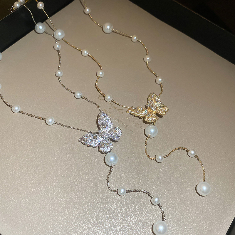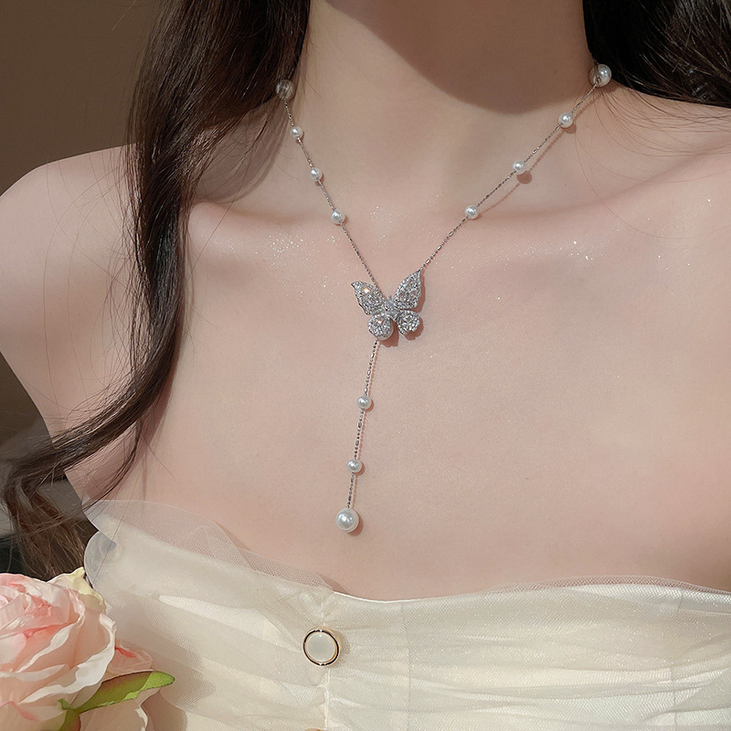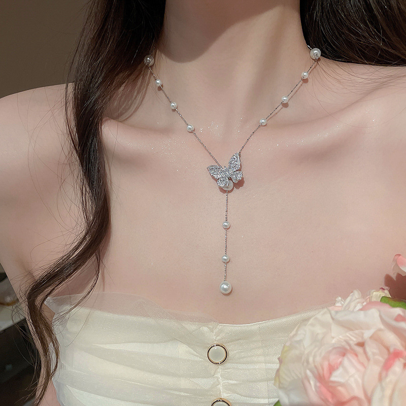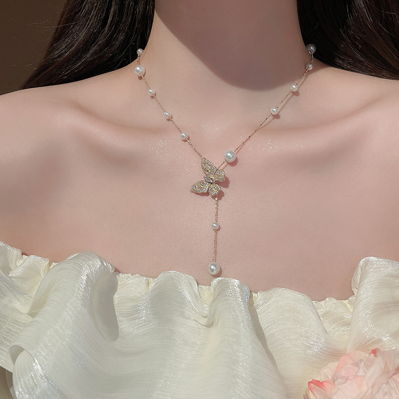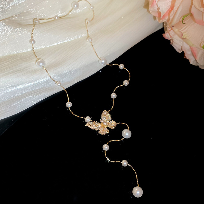 Galvanizado en oro real, circón, mariposa, perla, collar con borla, red, cadena de clavícula de viento rojo, súper hada, dulce, alta sensación, collar femenino