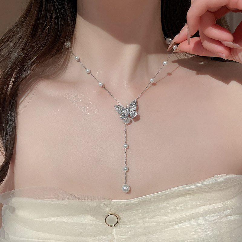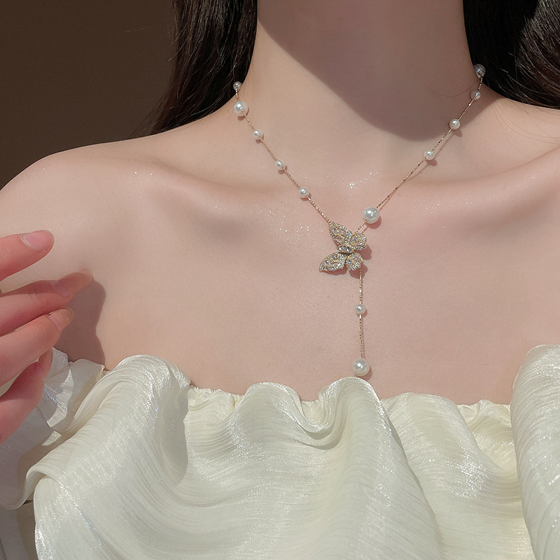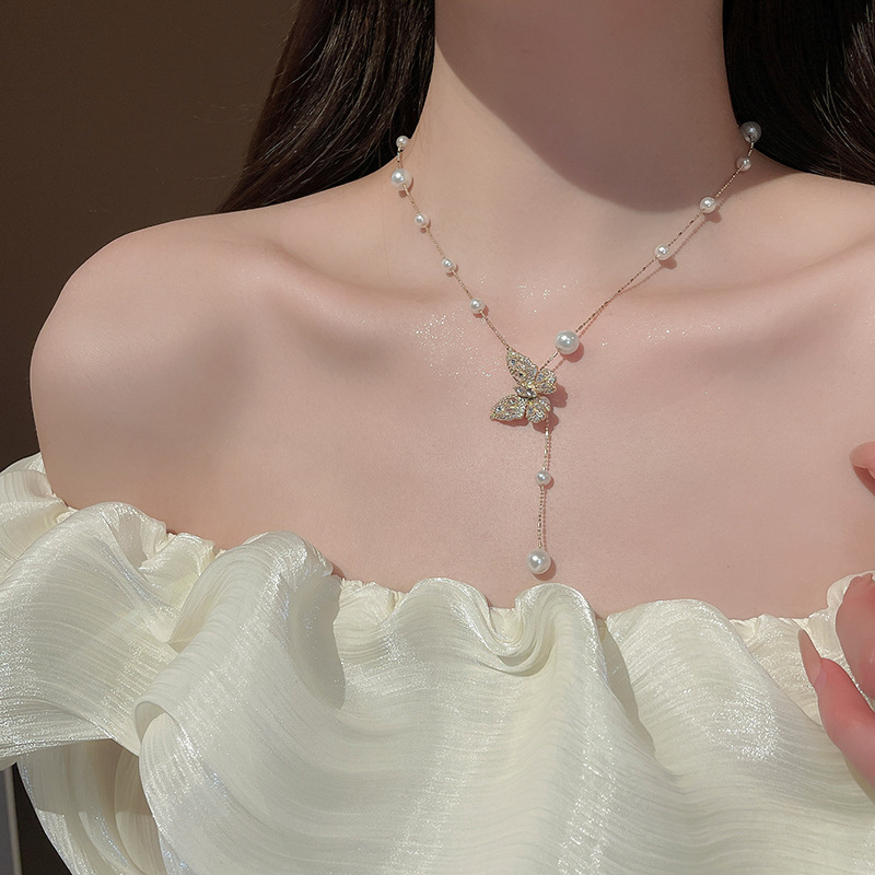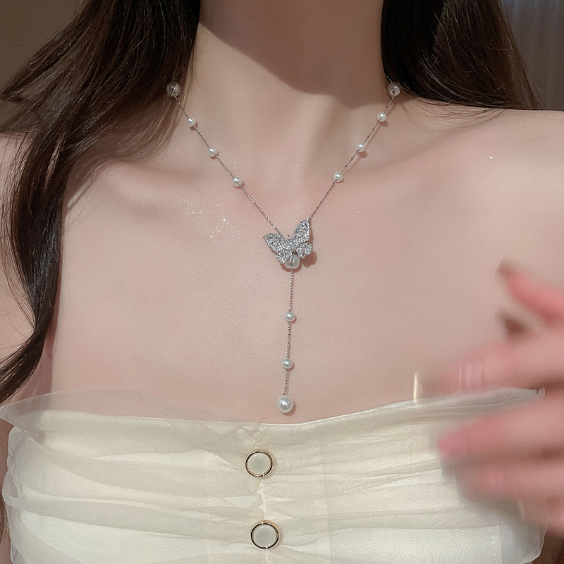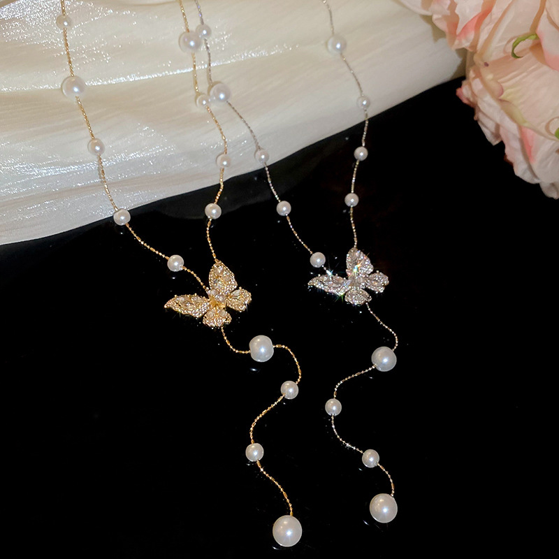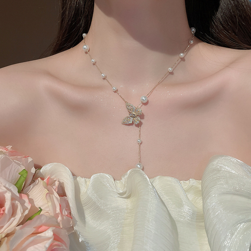 Galvanizado en oro real, circón, mariposa, perla, collar con borla, red, cadena de clavícula de viento rojo, súper hada, dulce, alta sensación, collar femenino