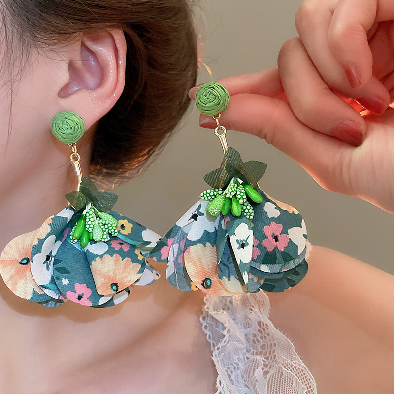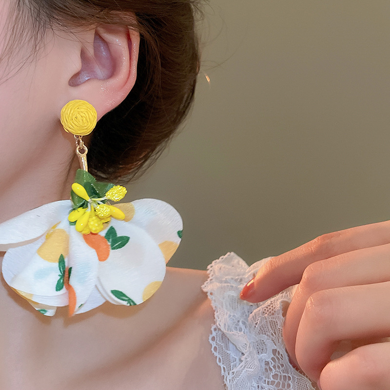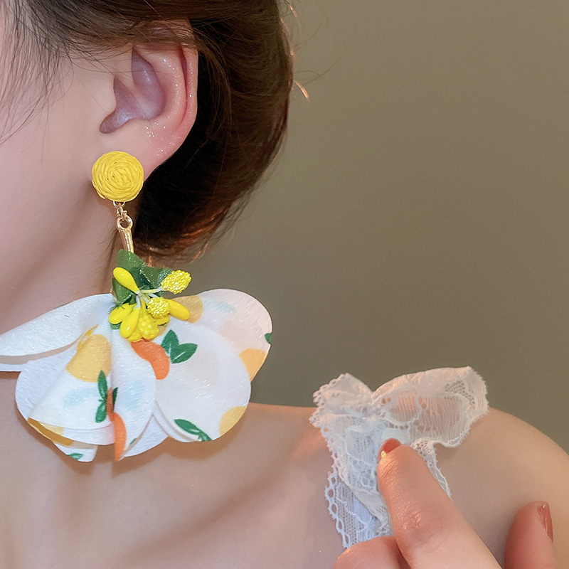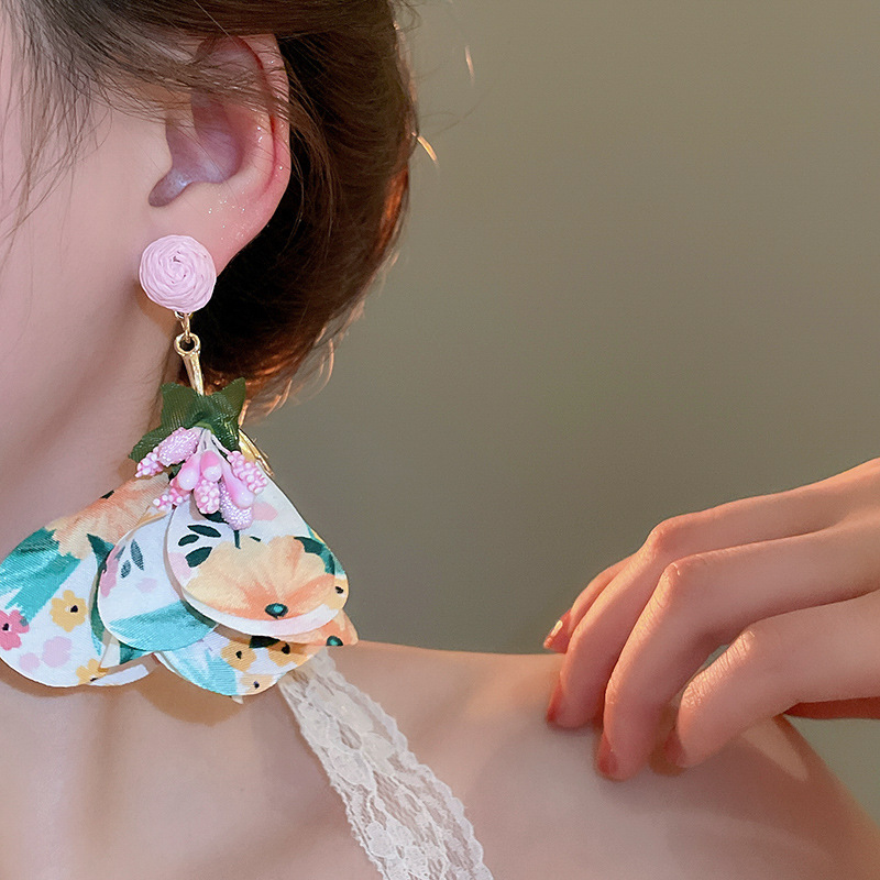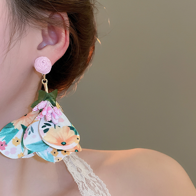 Pendientes de borla de flores de tela de rafio Pendientes de temperamento de estilo de vacaciones junto al mar Pendientes de lujo ligero de nicho para mujer