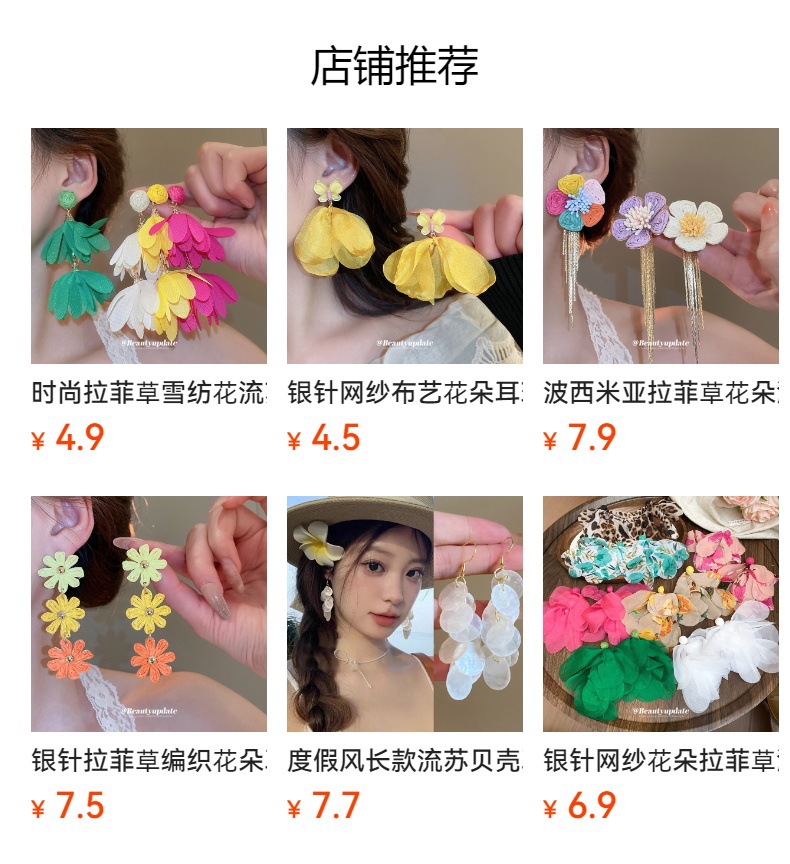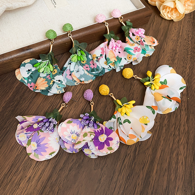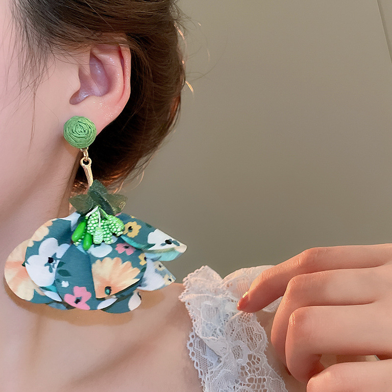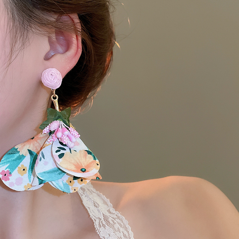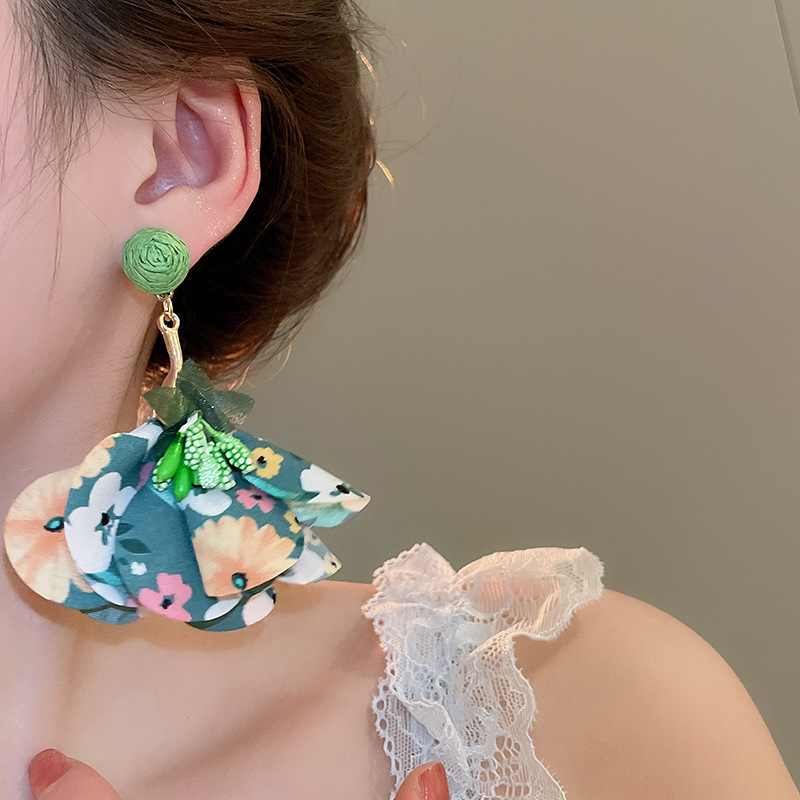 Pendientes de borla de flores de tela de rafio Pendientes de temperamento de estilo de vacaciones junto al mar Pendientes de lujo ligero de nicho para mujer