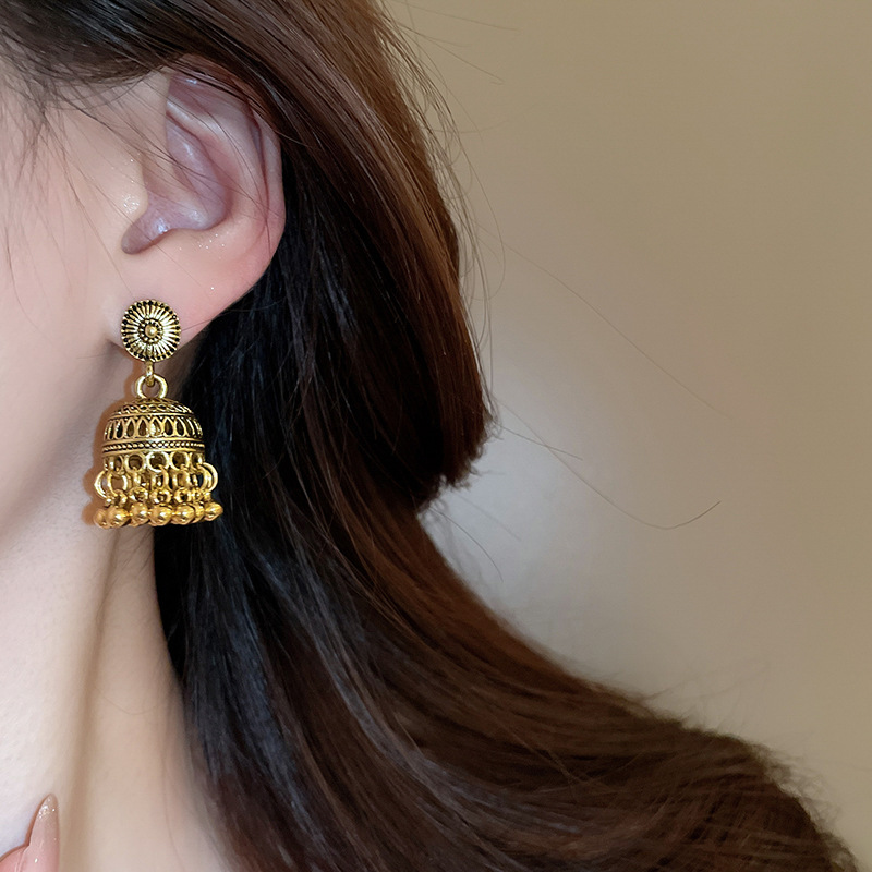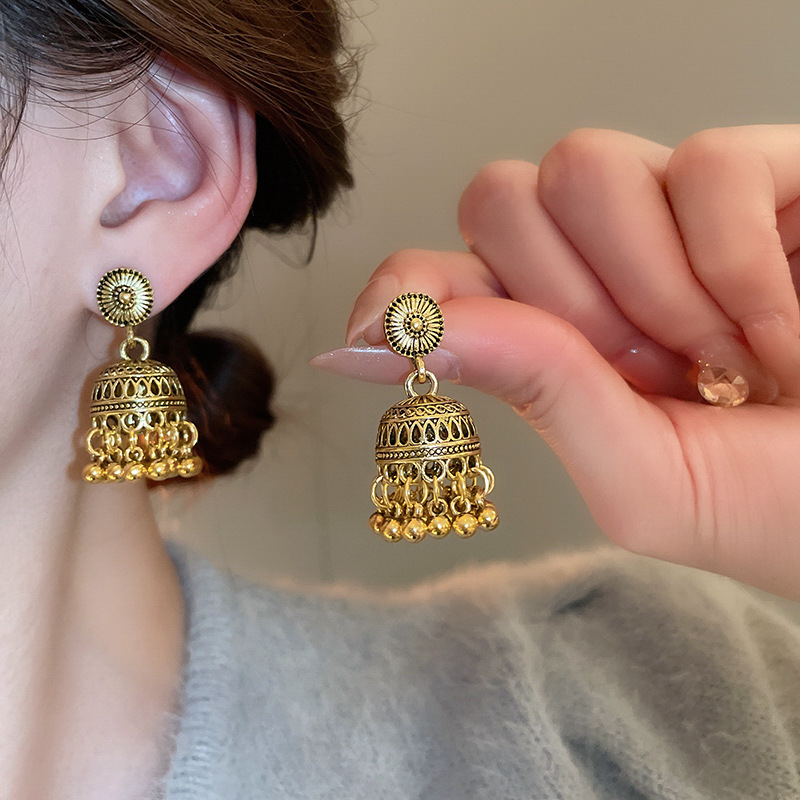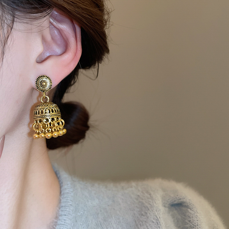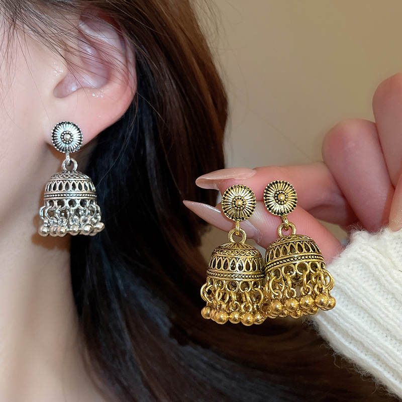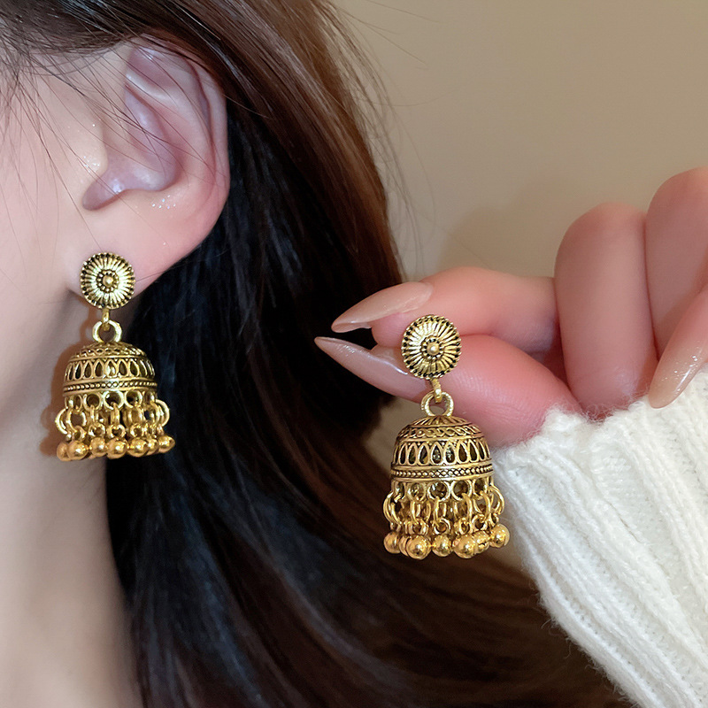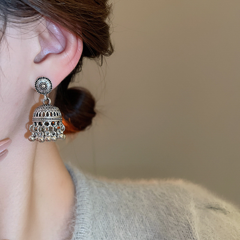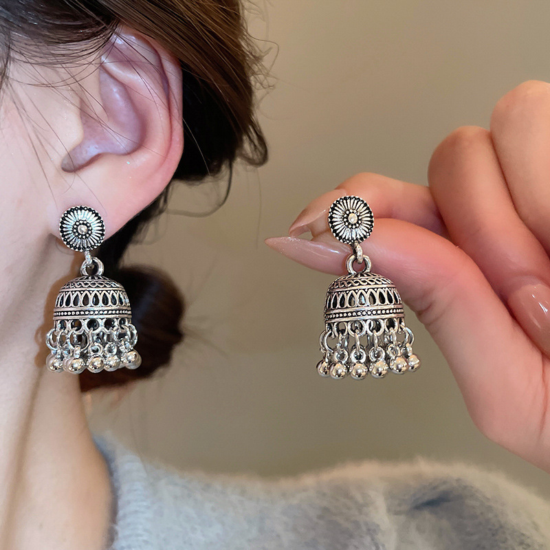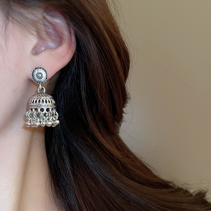 Aguja de plata, campana vintage, pendientes de borlas talladas, pendientes de temperamento de moda, pendientes de mujer, lujo ligero, sentido de alta gama