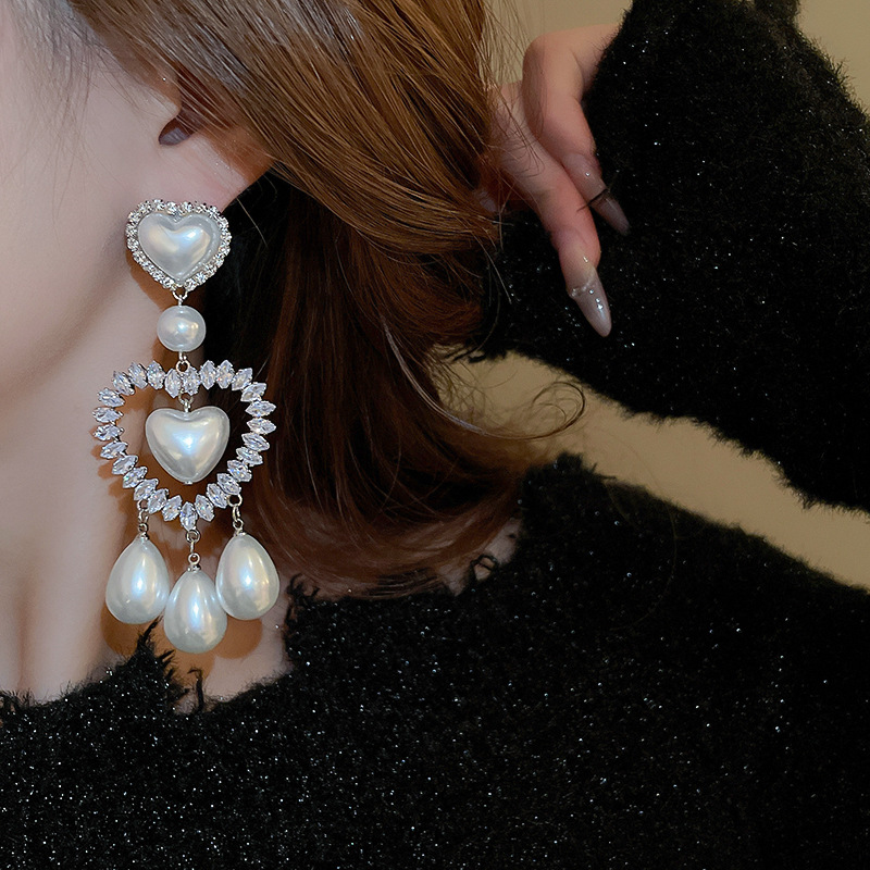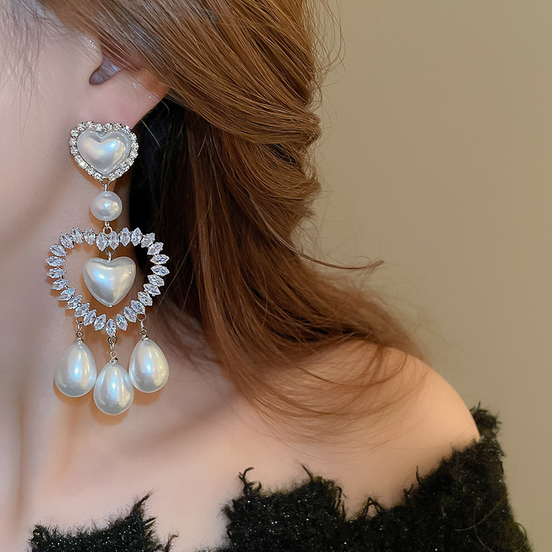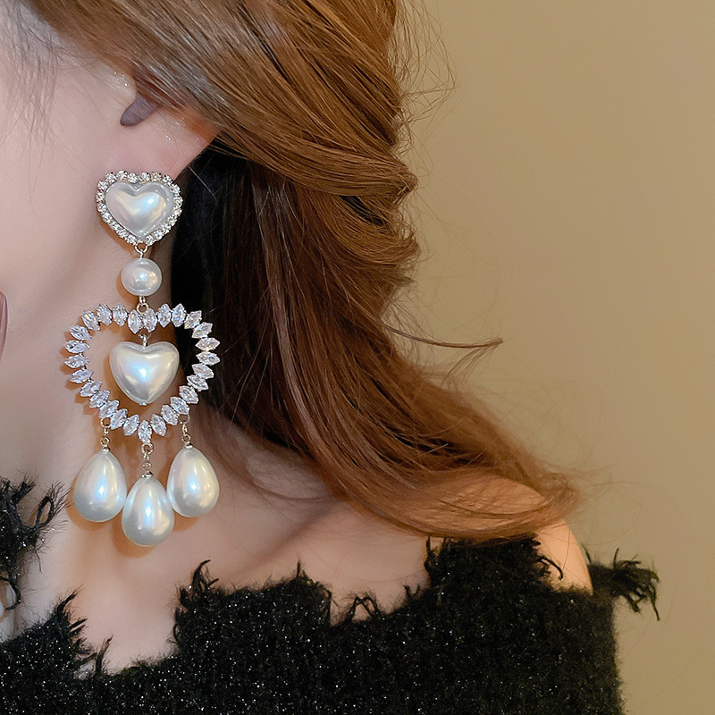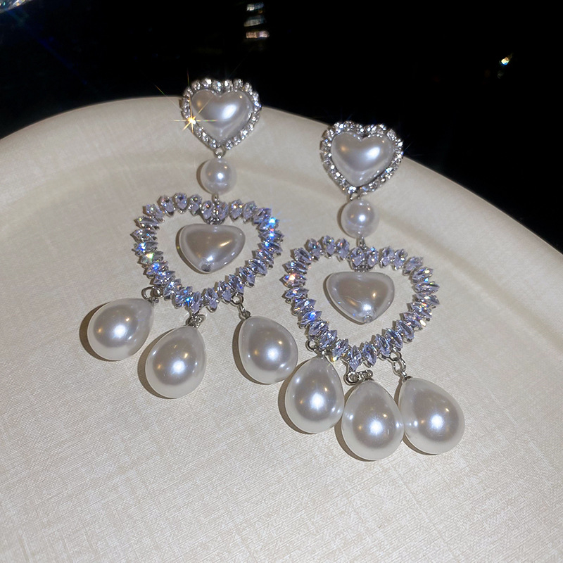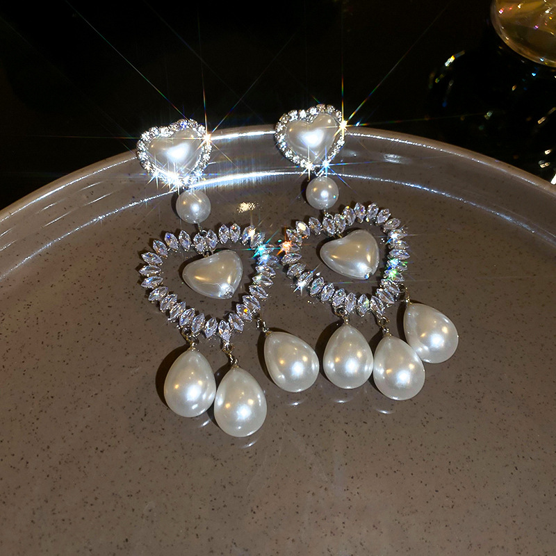 Pendientes de gota de agua de amor de diamantes llenos de perlas artificiales de aguja de plata Pendientes exquisitos y hermosos Pendientes dulces de estilo princesa