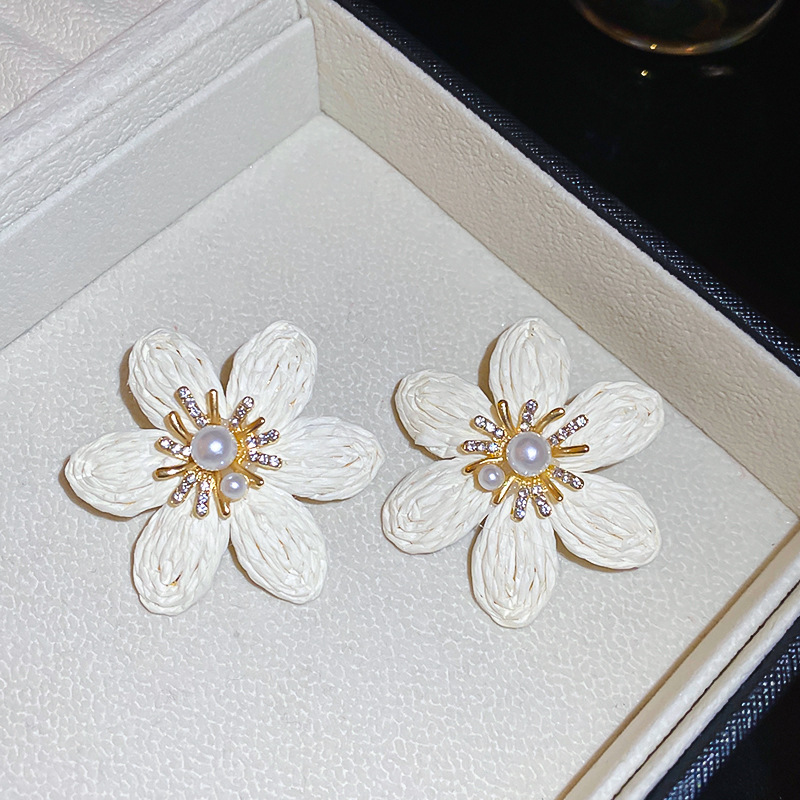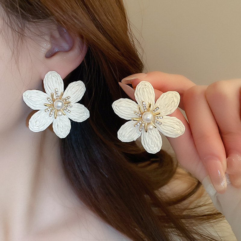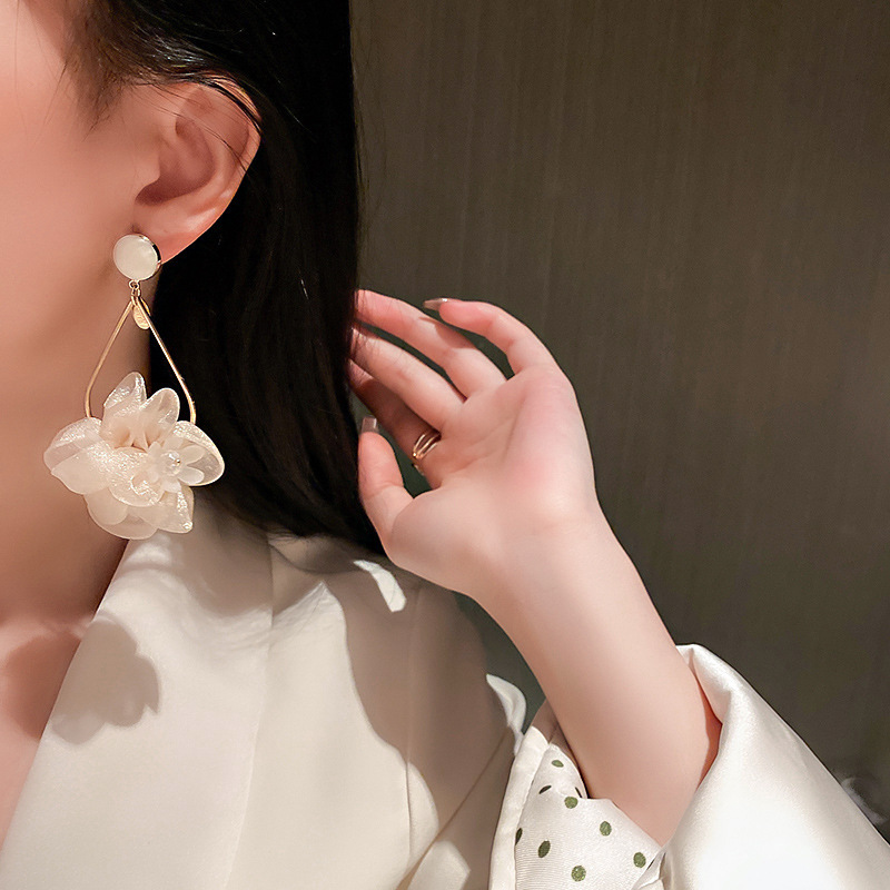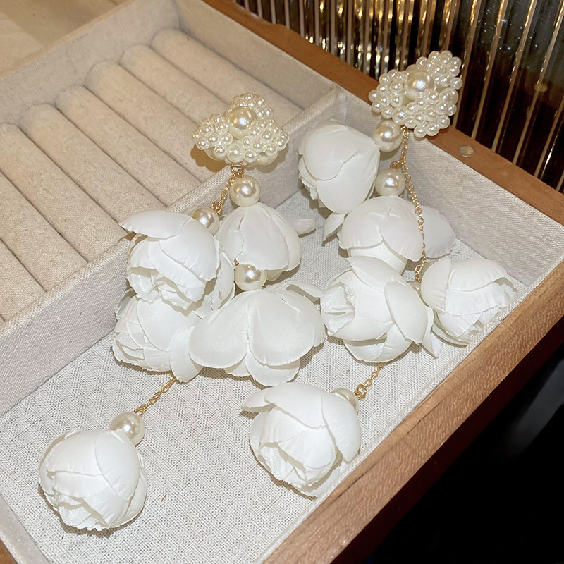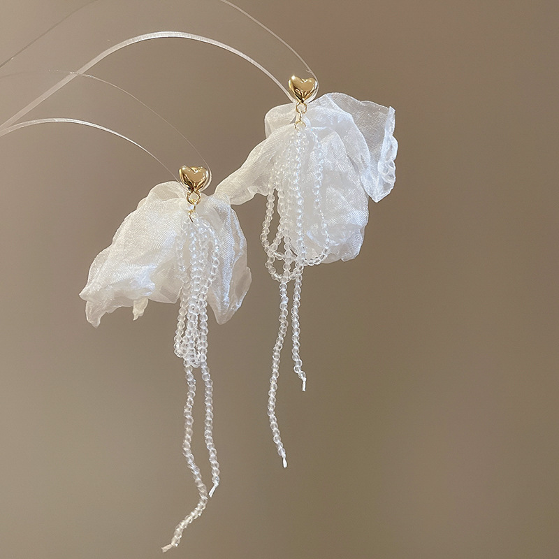 Pendientes de borla de flores de hilo de malla de perlas de aguja de plata Pendientes frescos y dulces de primavera y verano Pendientes de moda de deseo puro de súper hada al por mayor