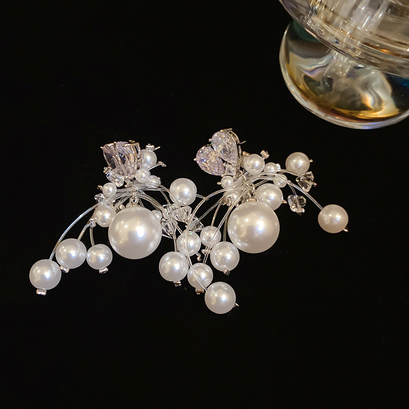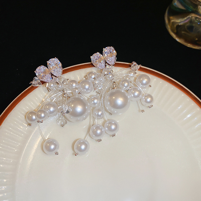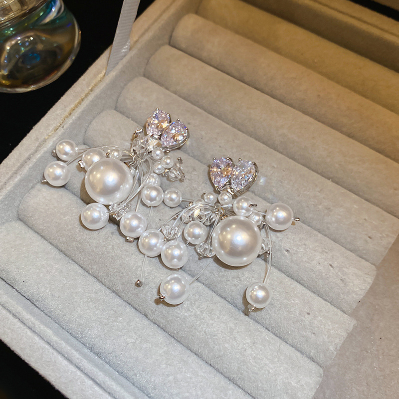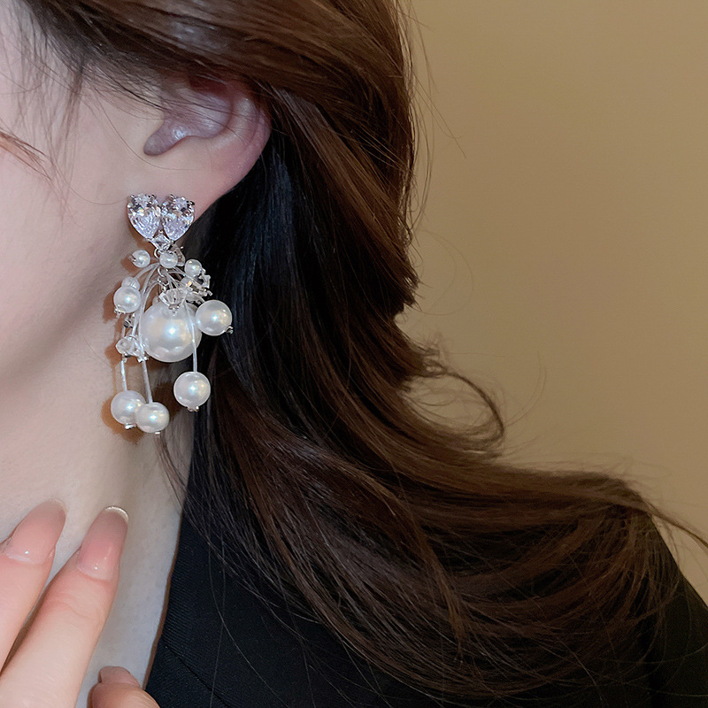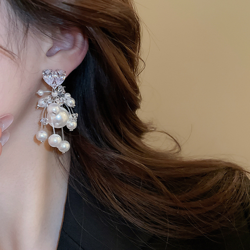 Aguja de plata circón amor perla borla aretes francés ligero lujo temperamento todo fósforo aretes moda alta sentido mujeres