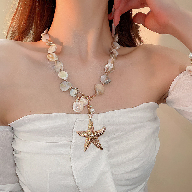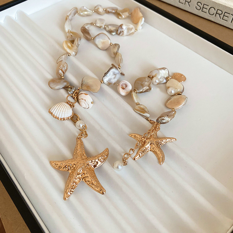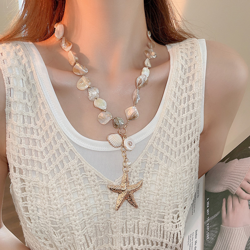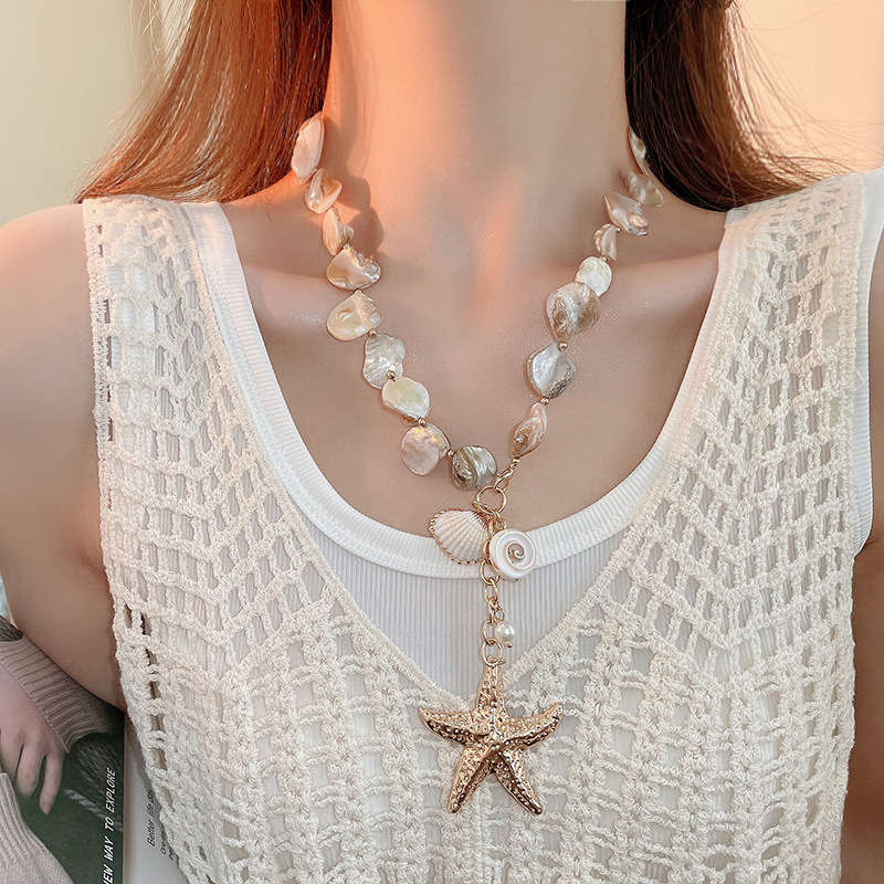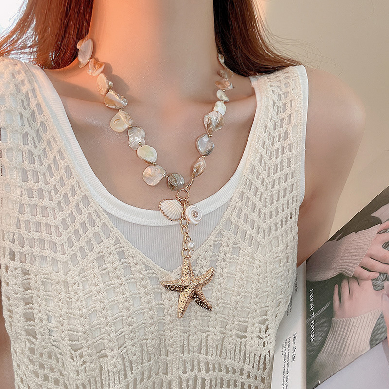 Collar de perlas de estrella de mar con cuentas de estilo de vacaciones junto al mar, nueva cadena de clavícula transfronteriza, joyería de lujo ligera de alta gama de nicho para mujer