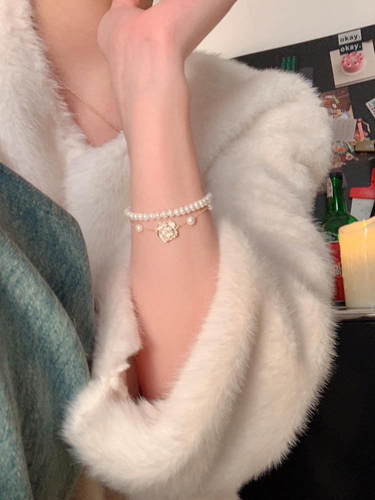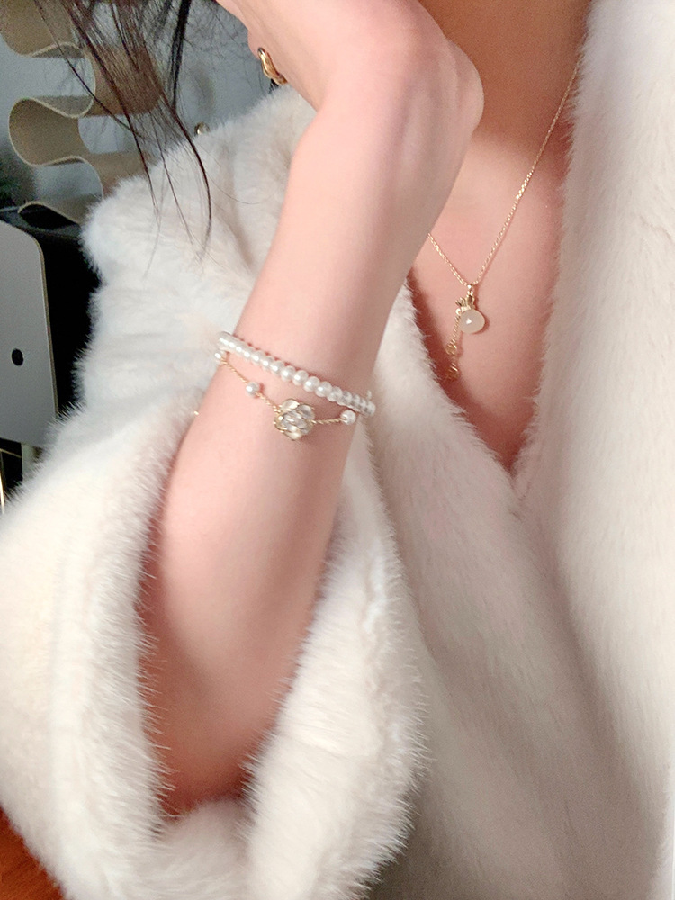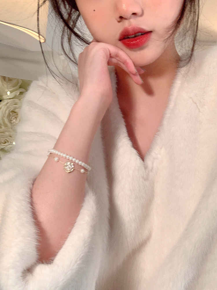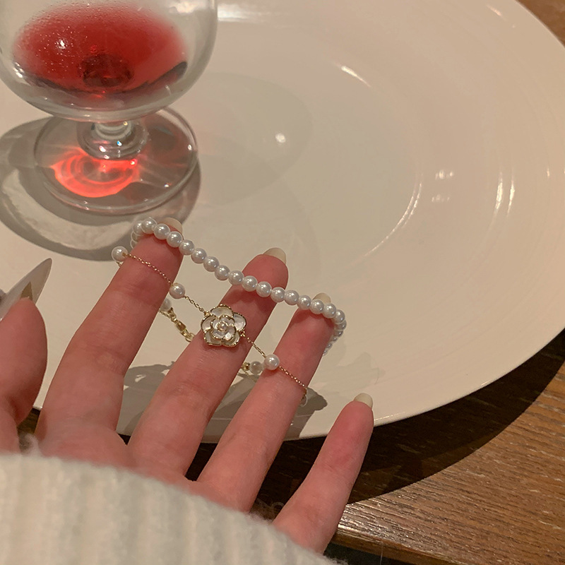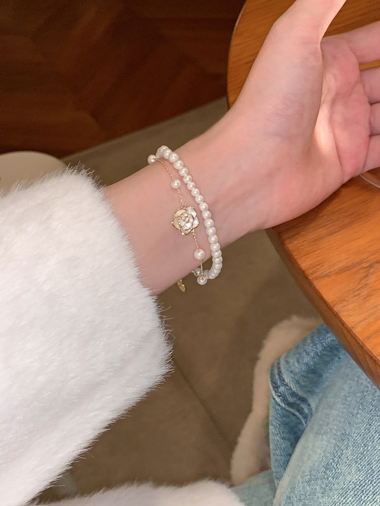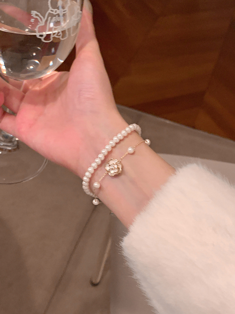Pulsera de camelia de perlas de doble capa Pulsera ligera de lujo de alta gama, temperamento elegante y versátil, joyería de nicho de moda al por mayor