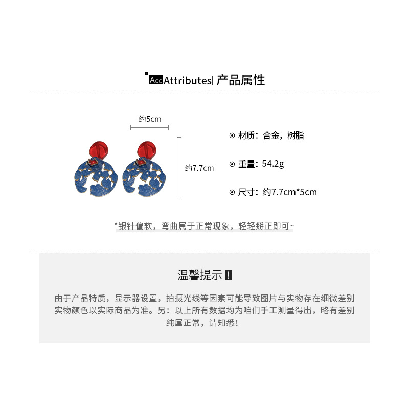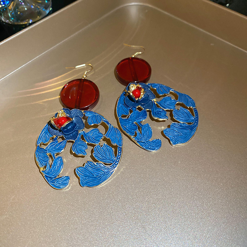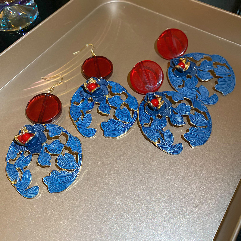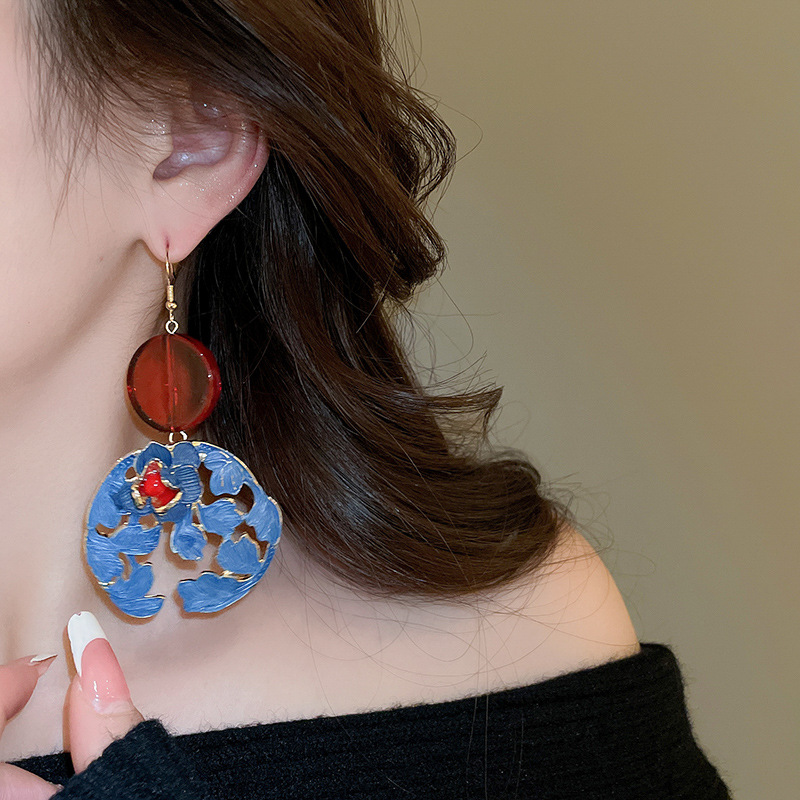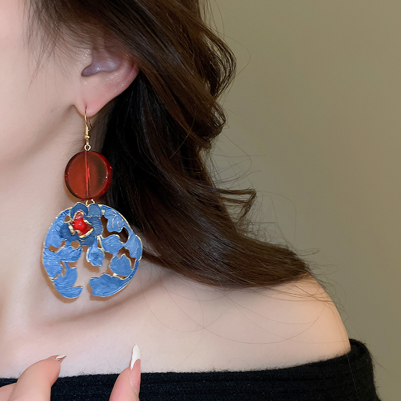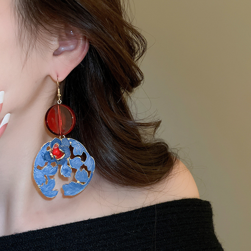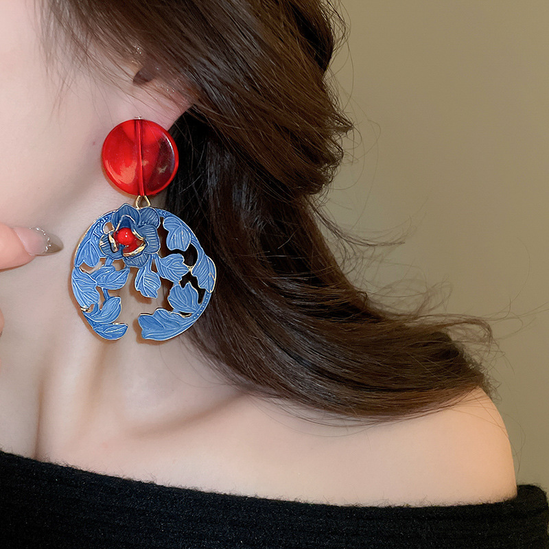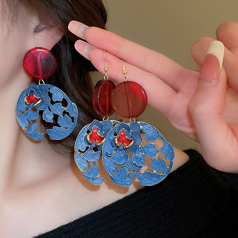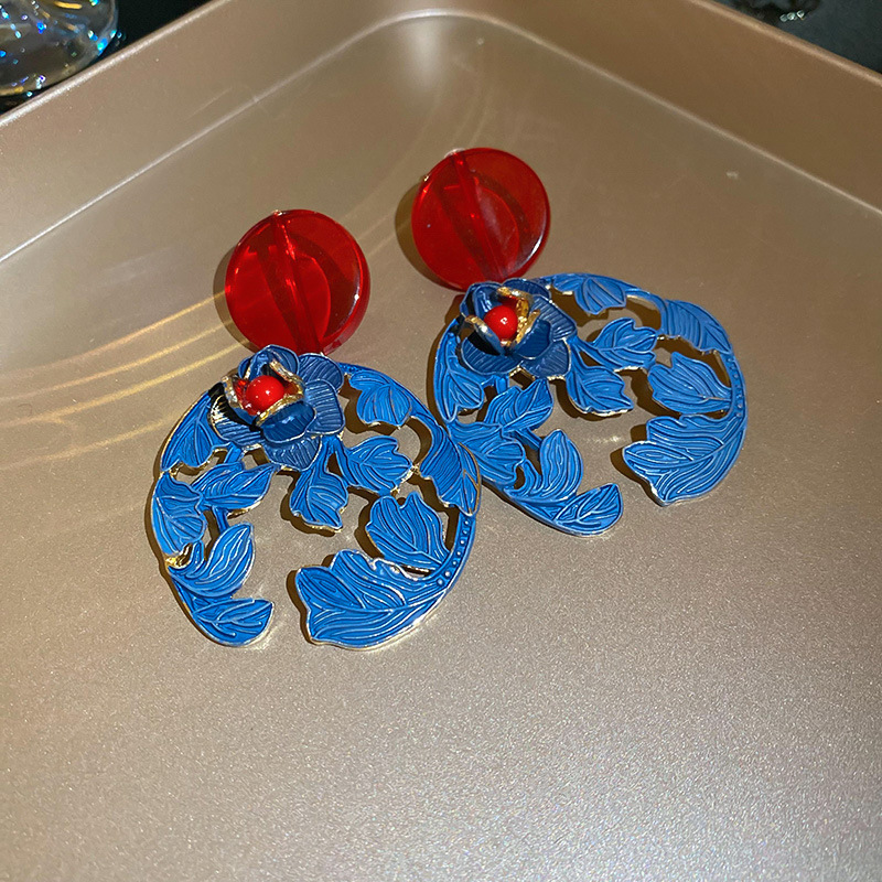 Pendientes de flores pintadas en aerosol rojo y azul con aguja de plata Pendientes de temperamento de nicho estilo de Hong Kong Pendientes retro elegantes de alta gama mujeres