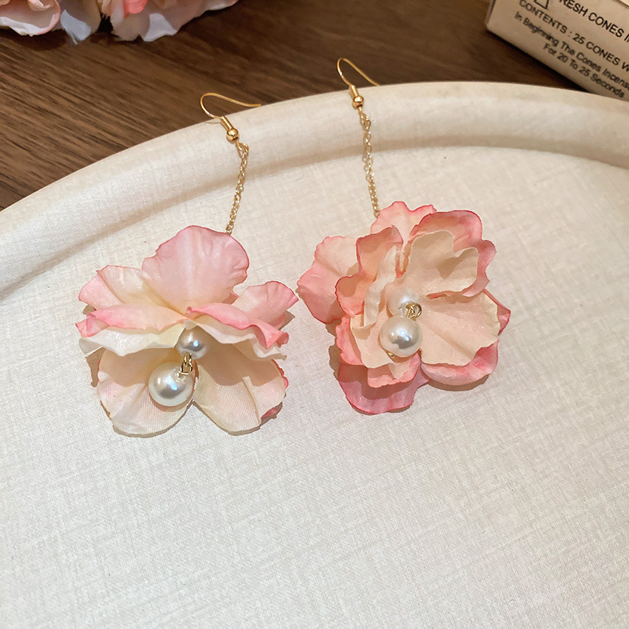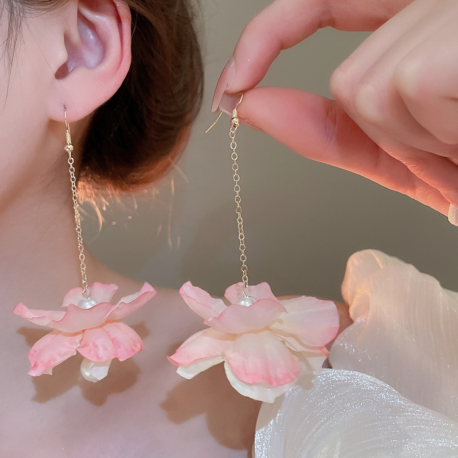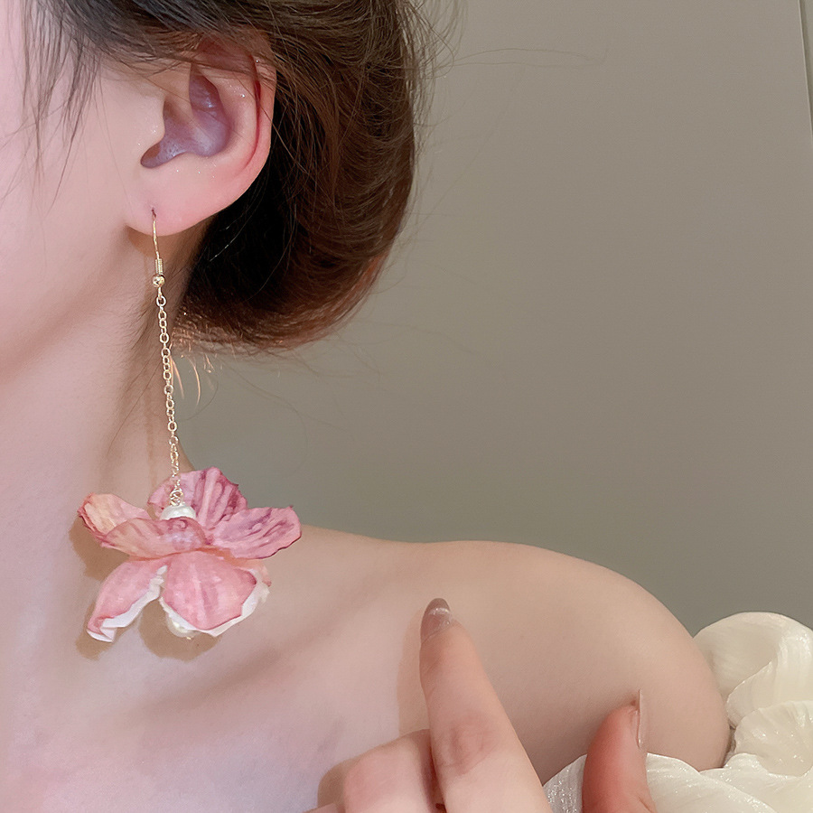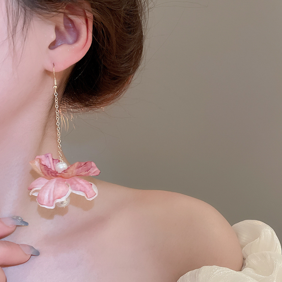 Pendientes de borla de perlas de flores de tela, lujo ligero, estilo de vacaciones junto al mar, diseño único, pendiente de gancho para la oreja, mujer