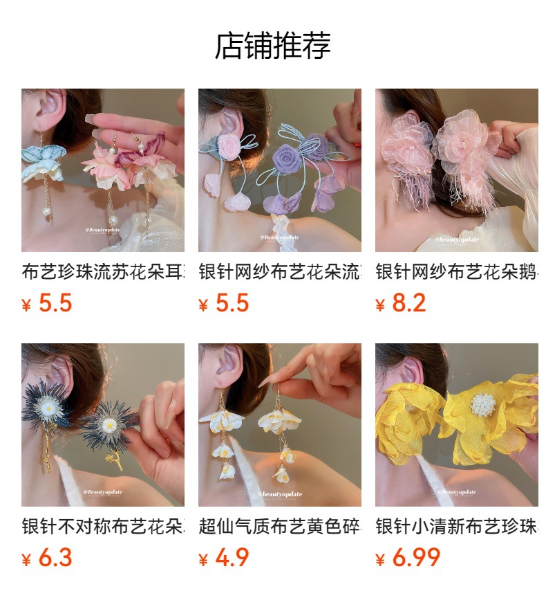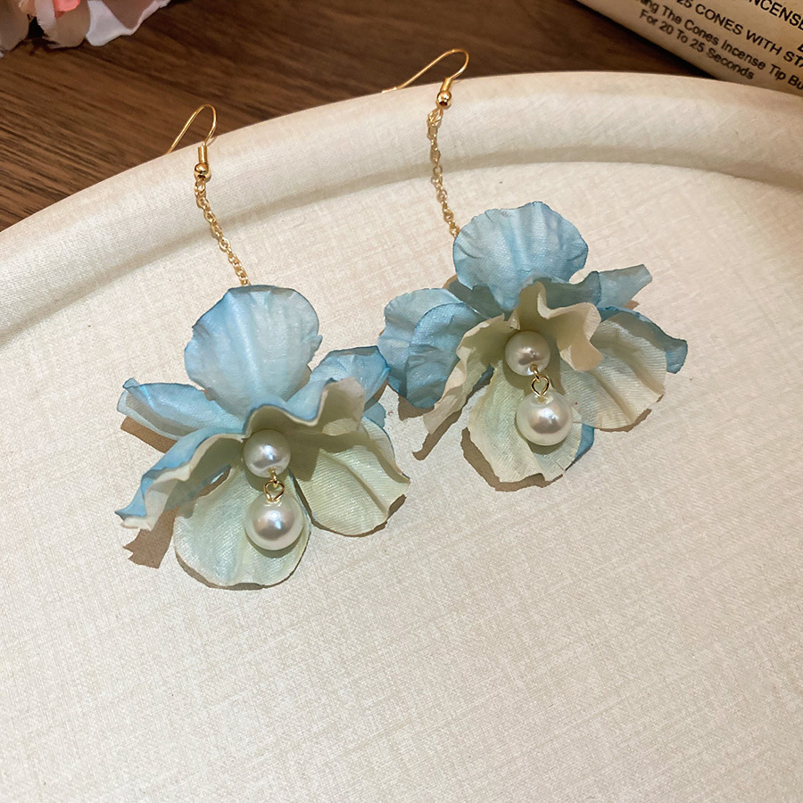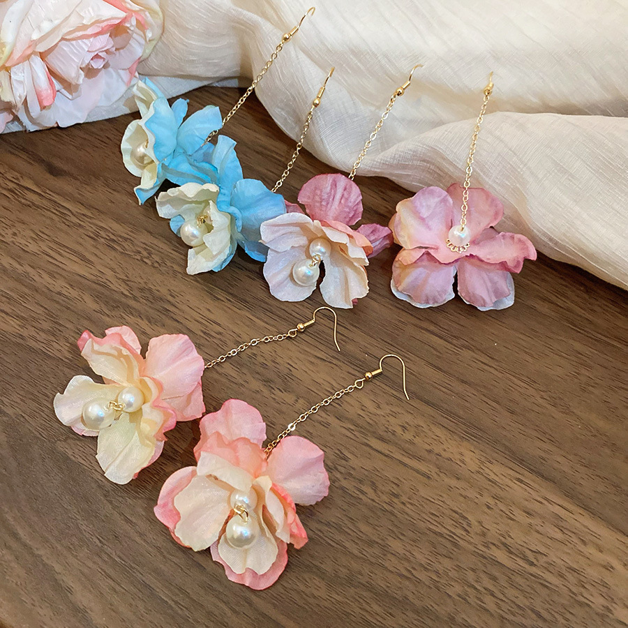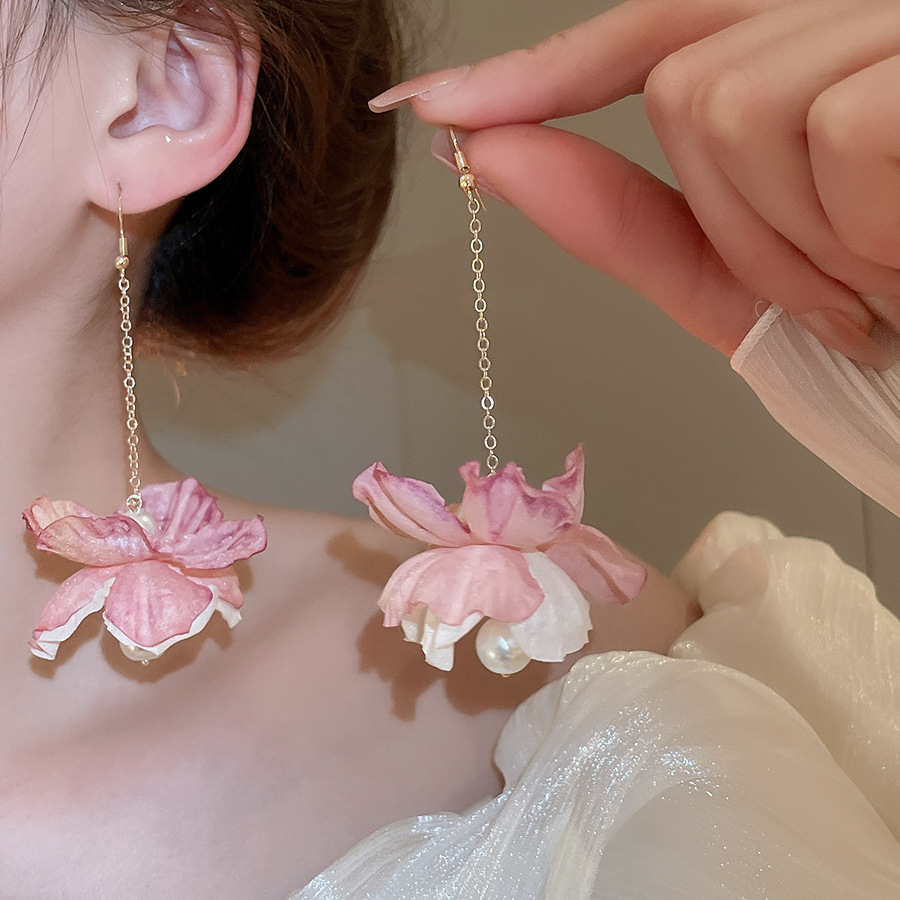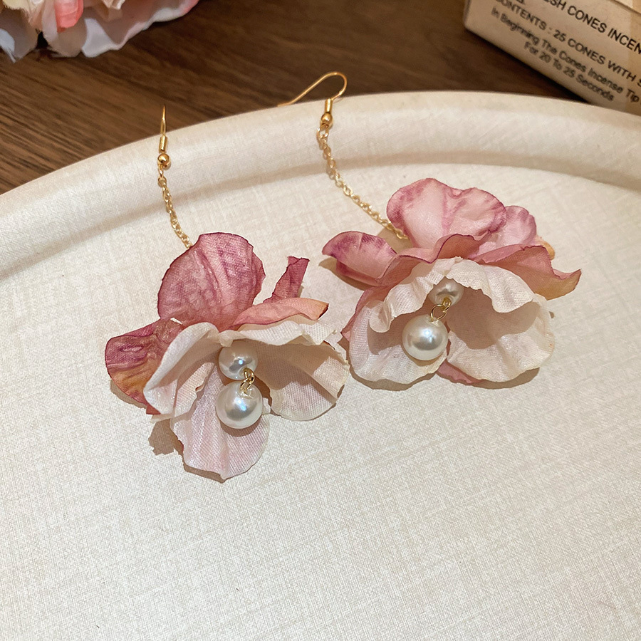 Pendientes de borla de perlas de flores de tela, lujo ligero, estilo de vacaciones junto al mar, diseño único, pendiente de gancho para la oreja, mujer