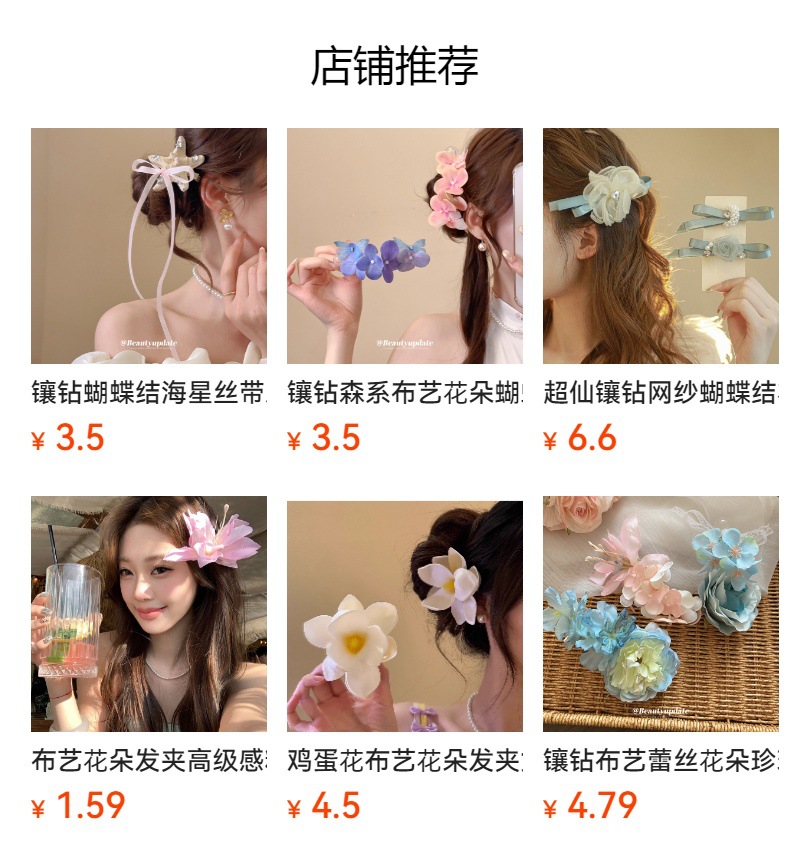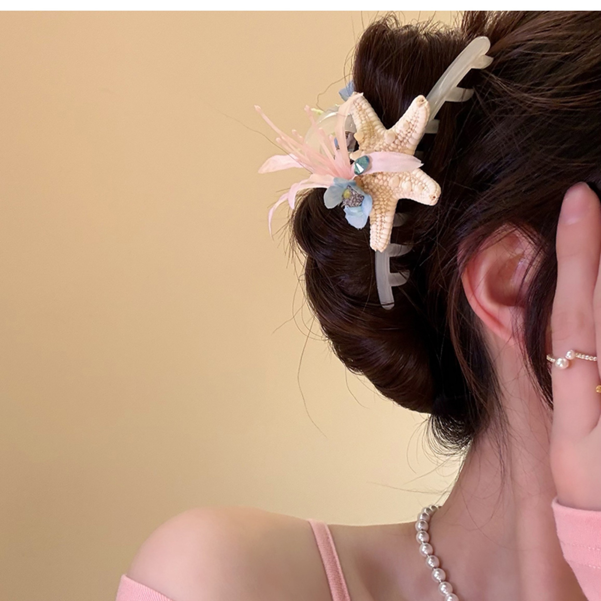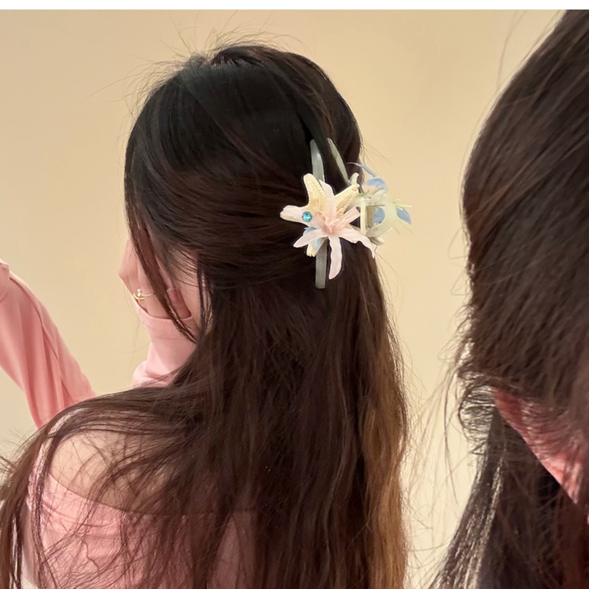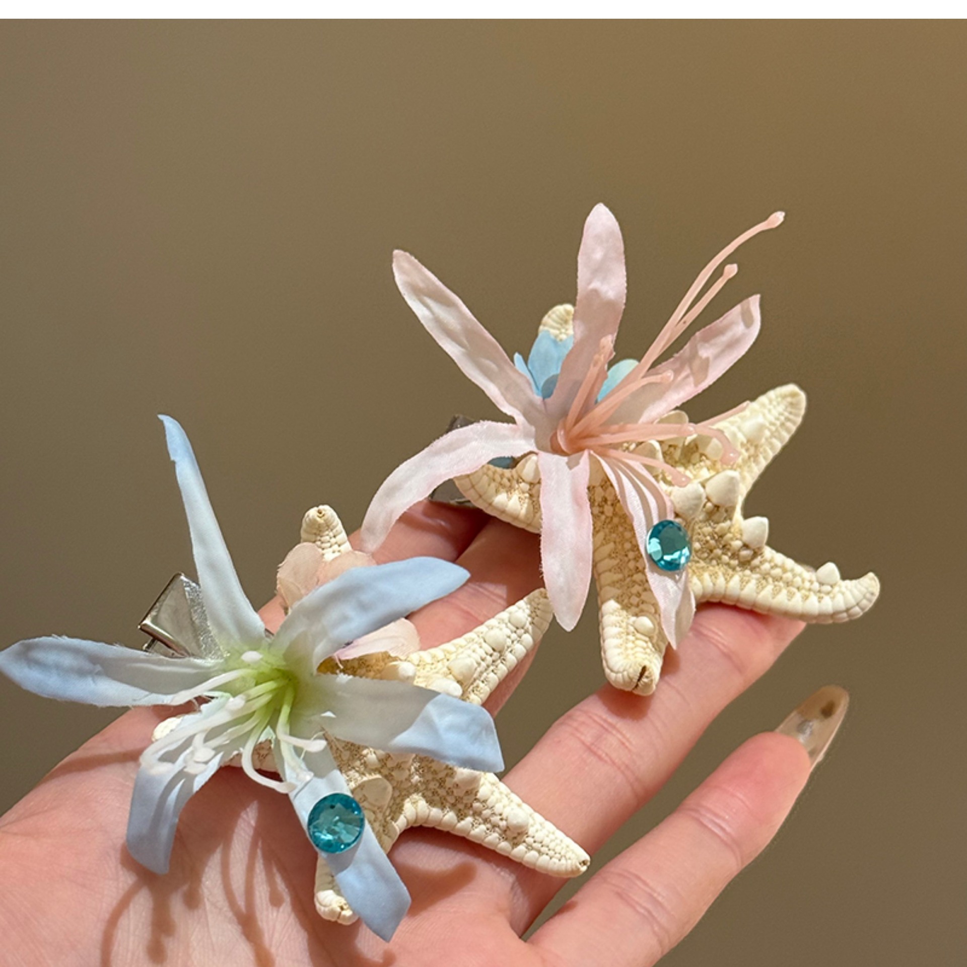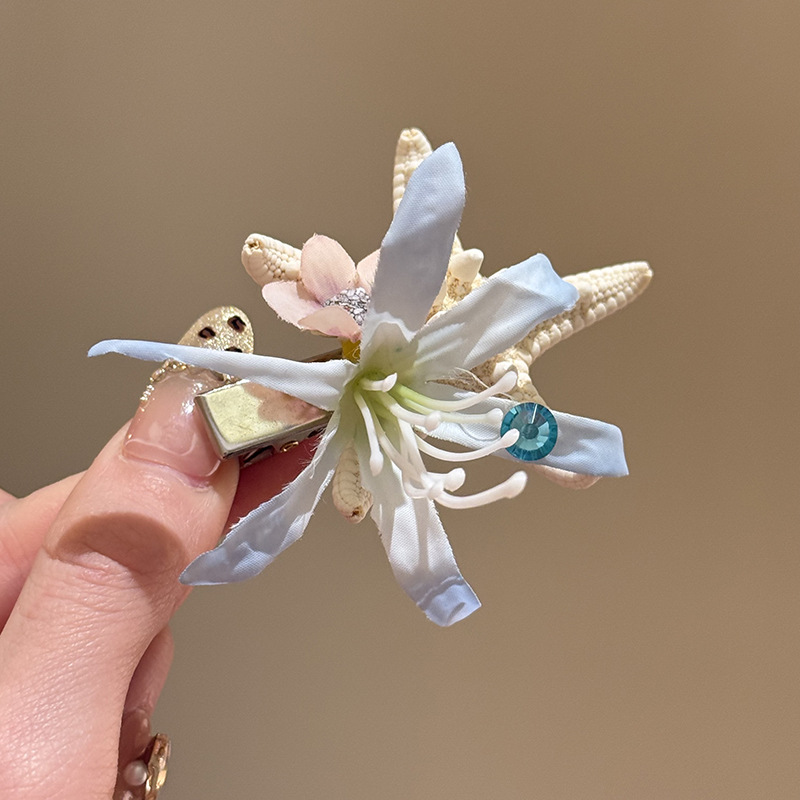 Flor de tela con incrustaciones de diamantes Horquilla de estrella de mar Estilo de vacaciones junto al mar Clip de pico de pato lateral Viajes Fotografía Moda Accesorios para el cabello de todo fósforo
