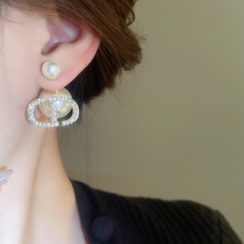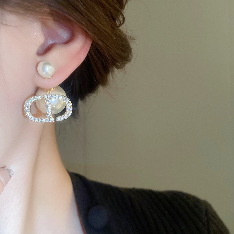 Pendientes de perlas con letras de aguja plateada de oro real Pendientes de dos accesorios para mujer Pendientes de temperamento de moda Lujo ligero Sentido de alta gama