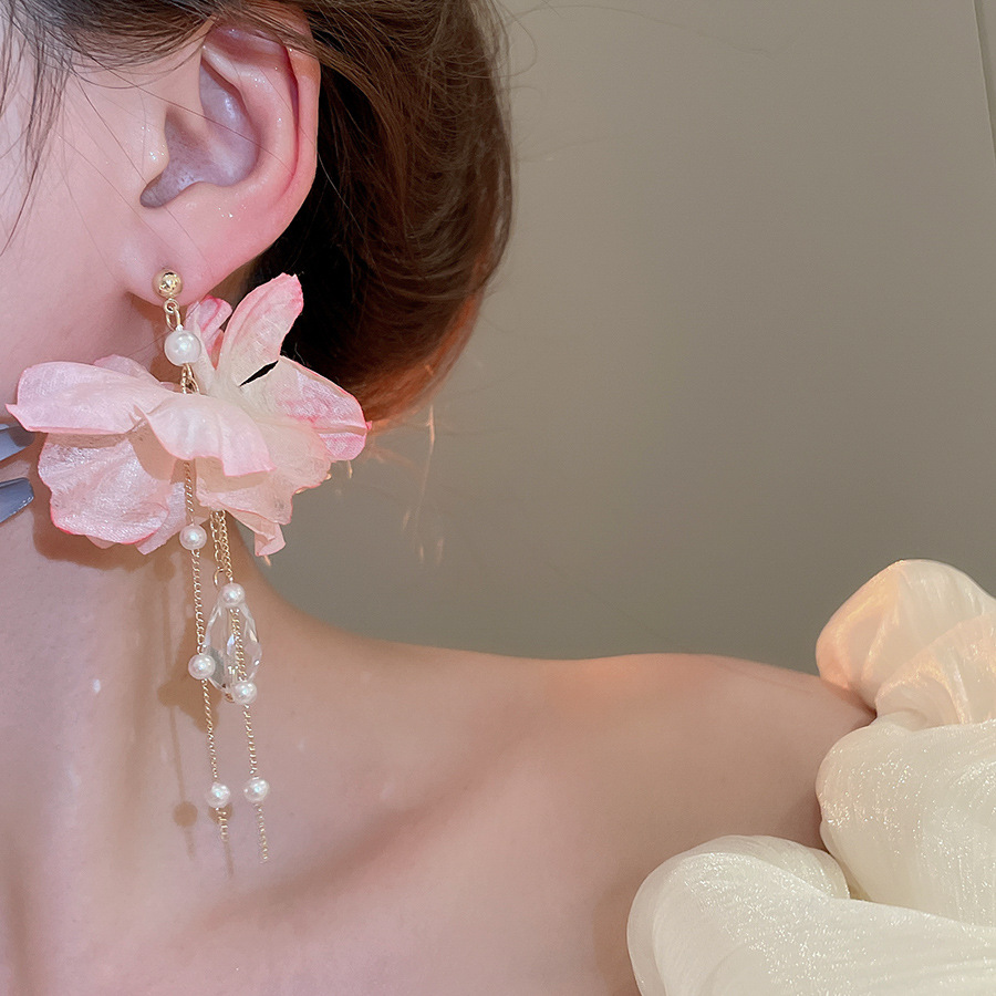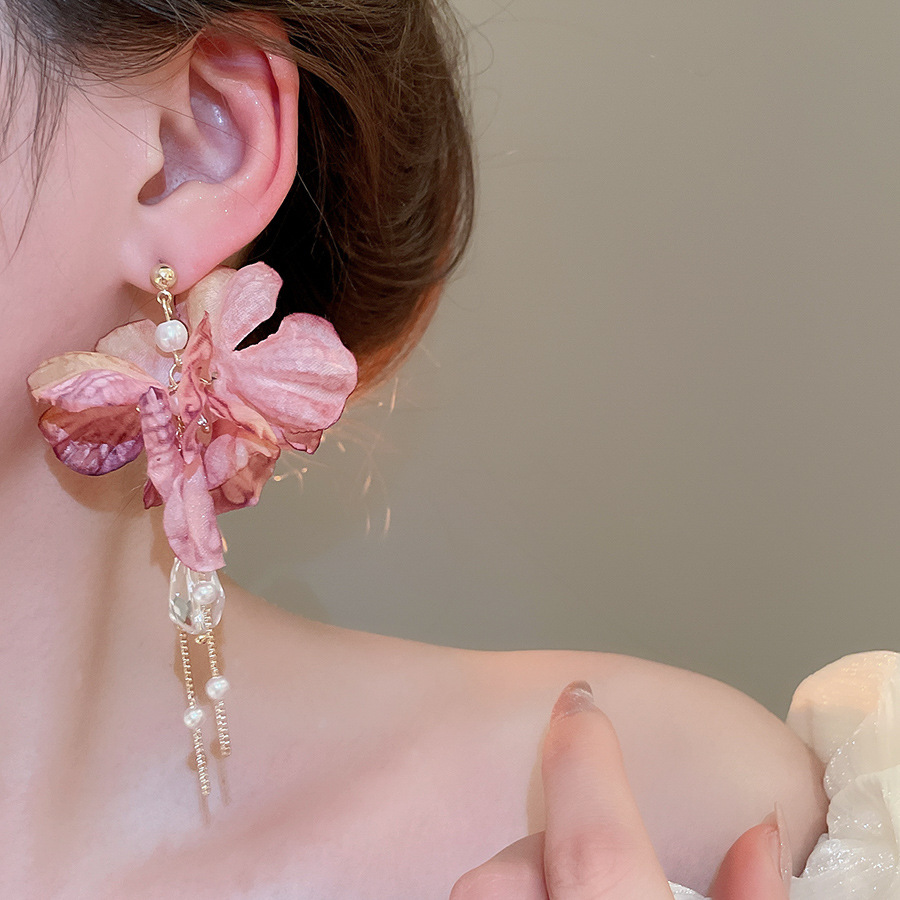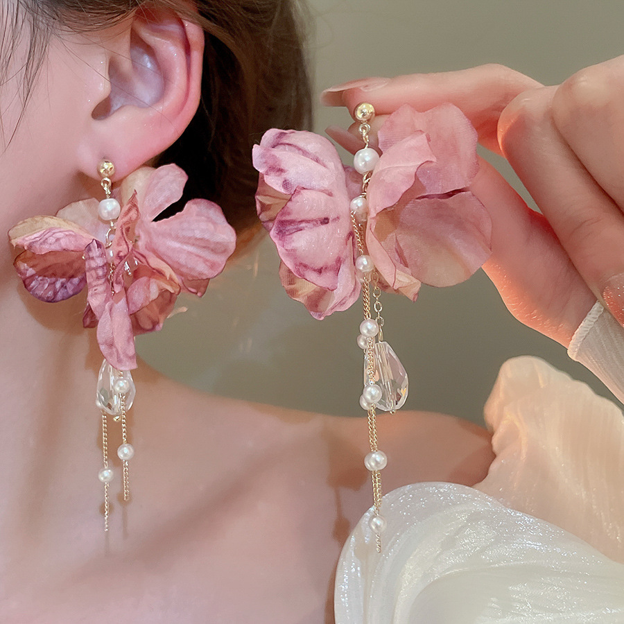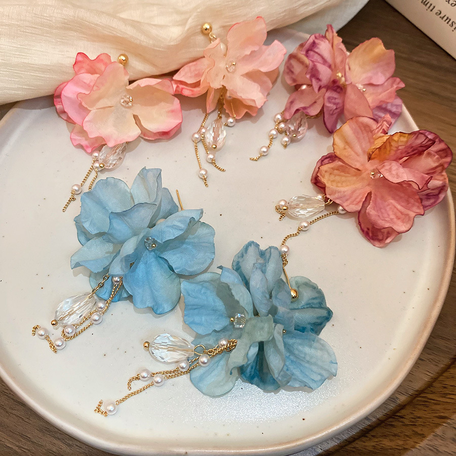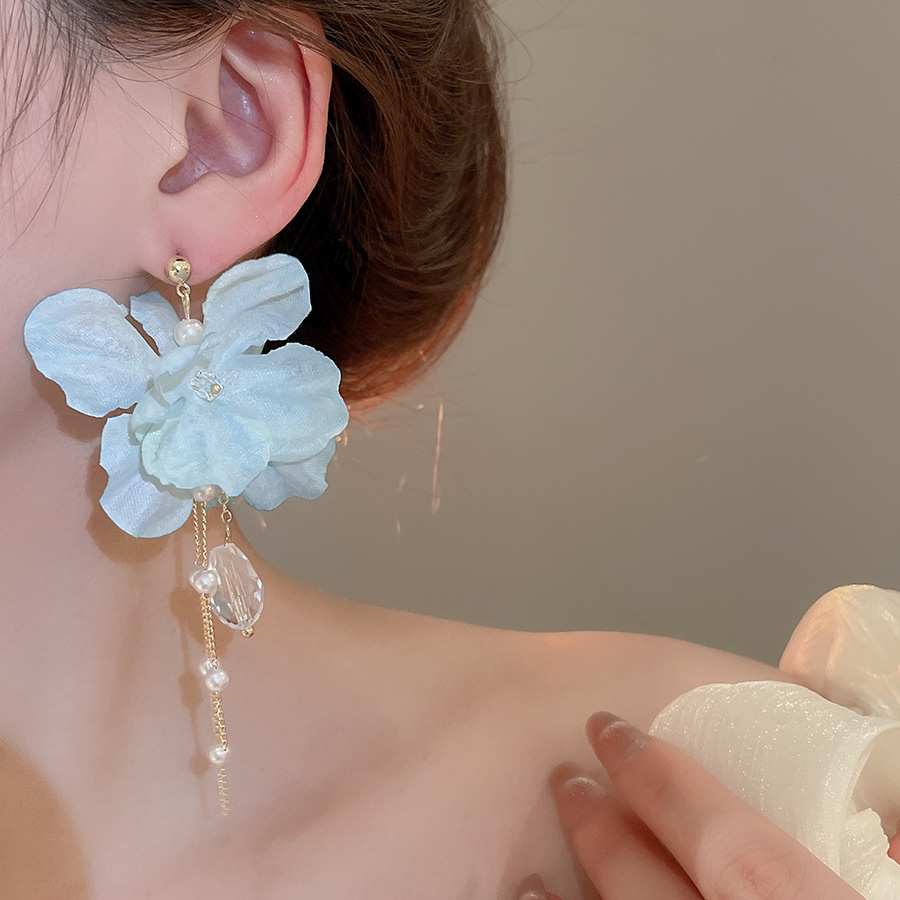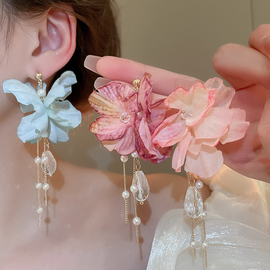 Pendientes de perla de cristal de cristal de flor de tela de aguja de plata Pendientes de todo fósforo de temperamento suave Pendientes de lujo ligero de alta gama