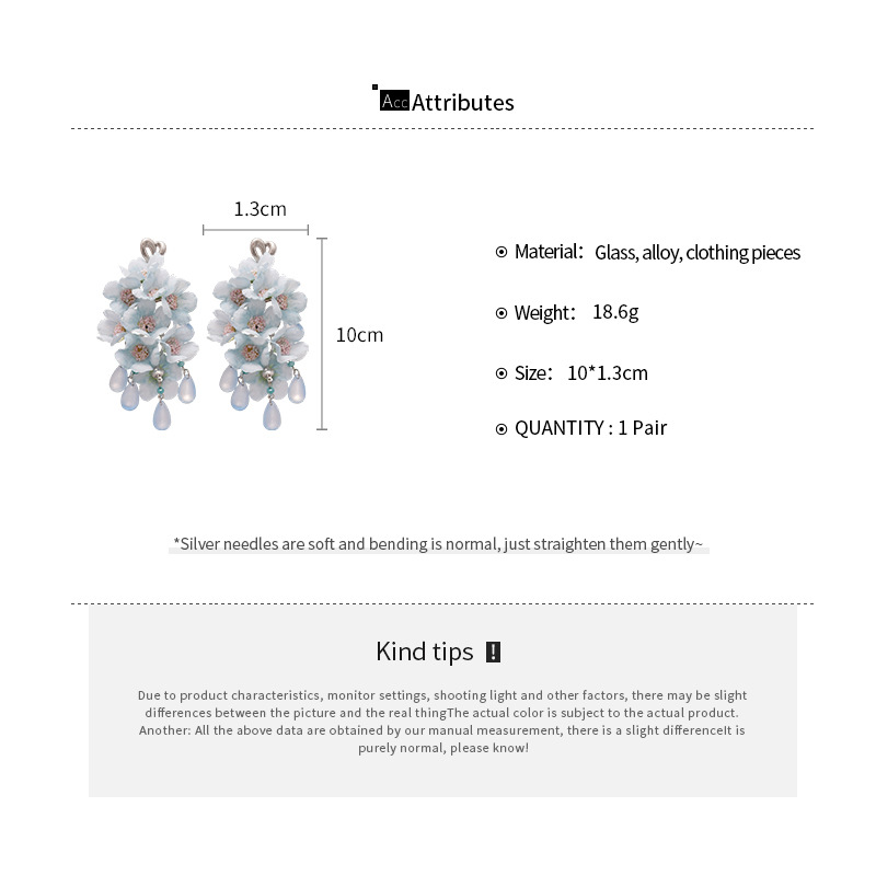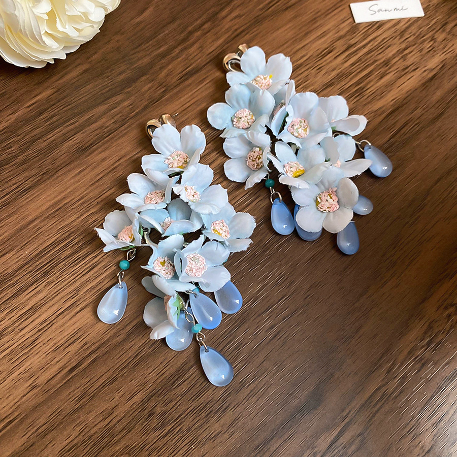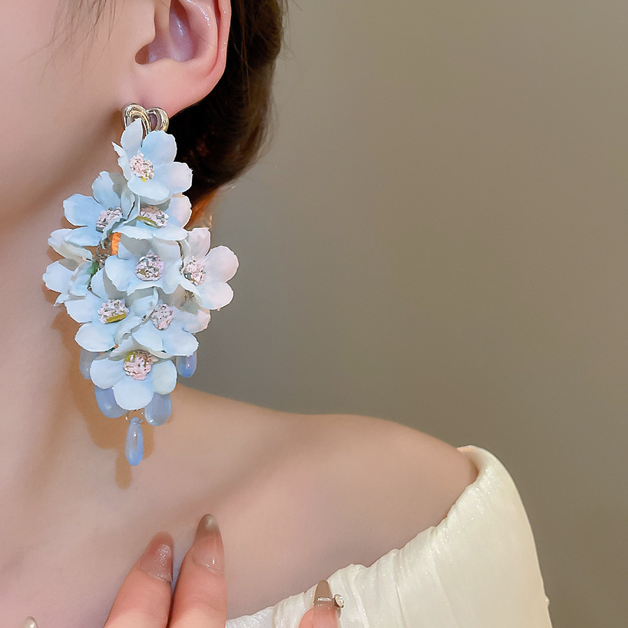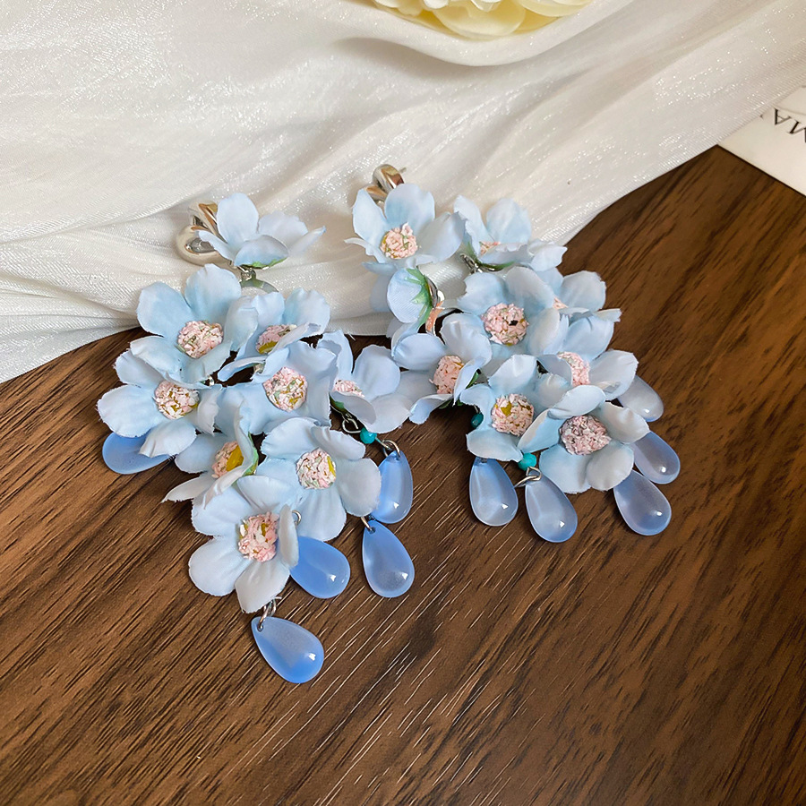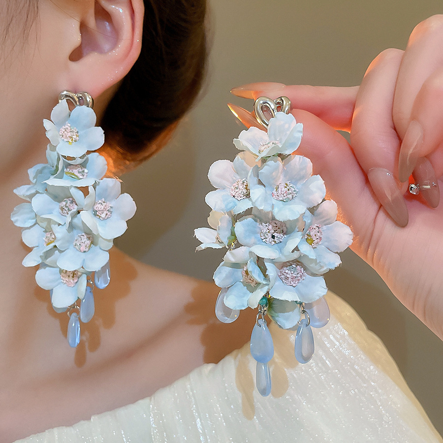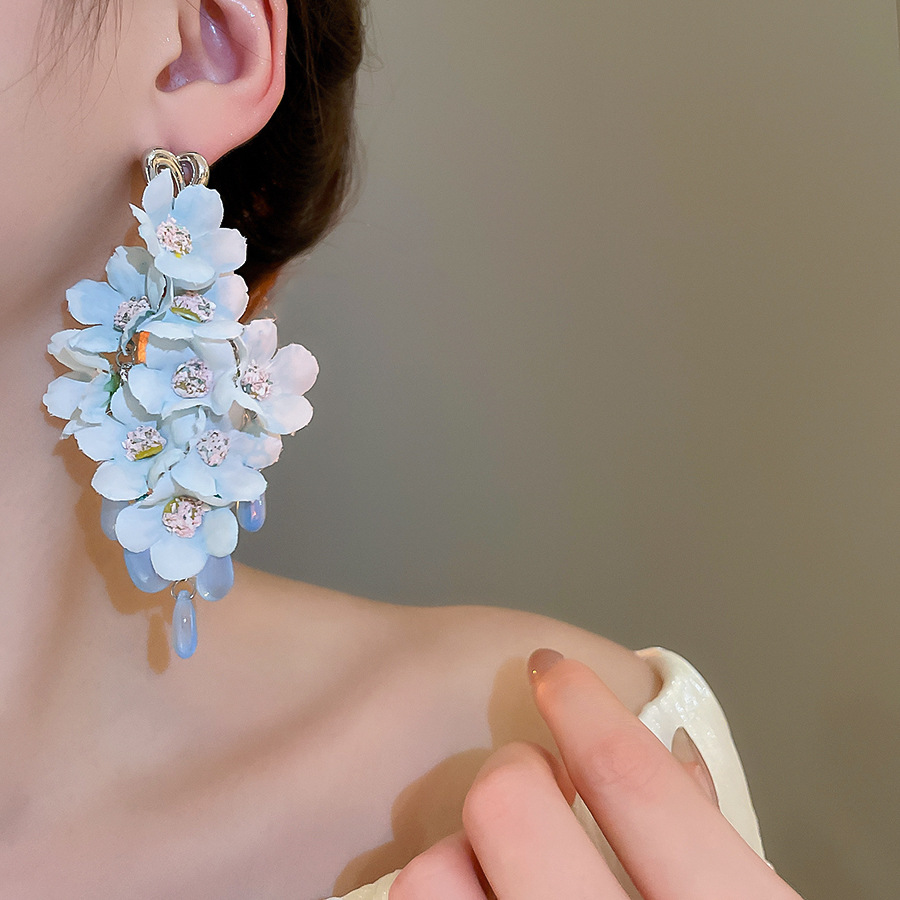 Pendientes de perla de flor azul de tela de aguja de plata Pendientes de ambiente fresco Pendientes de alta calidad de lujo ligero súper hada