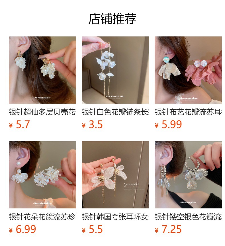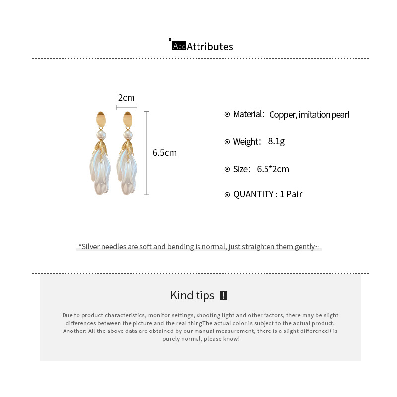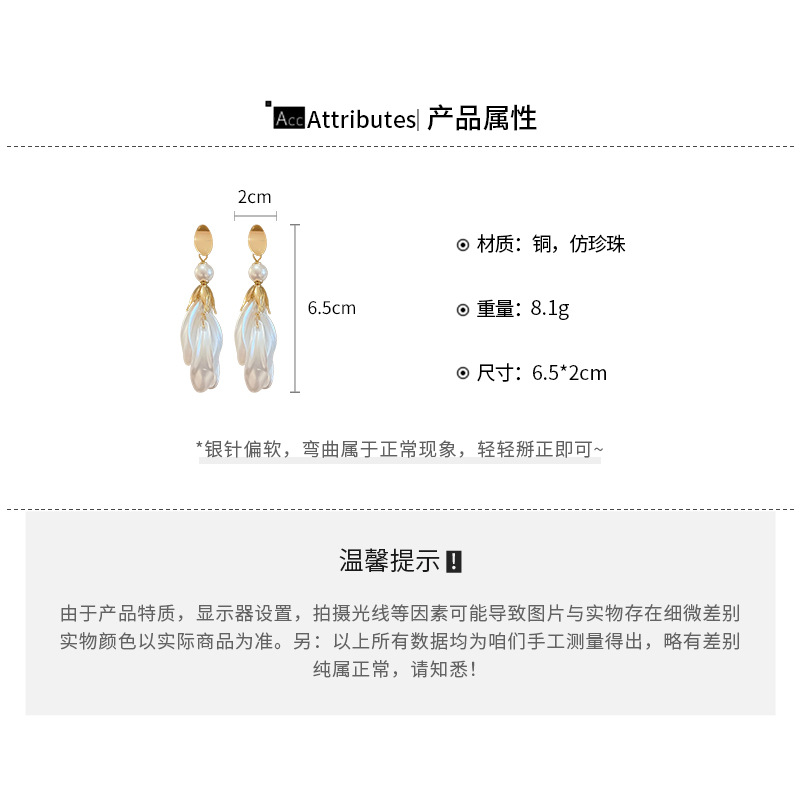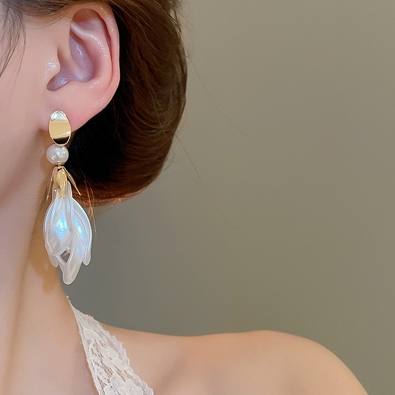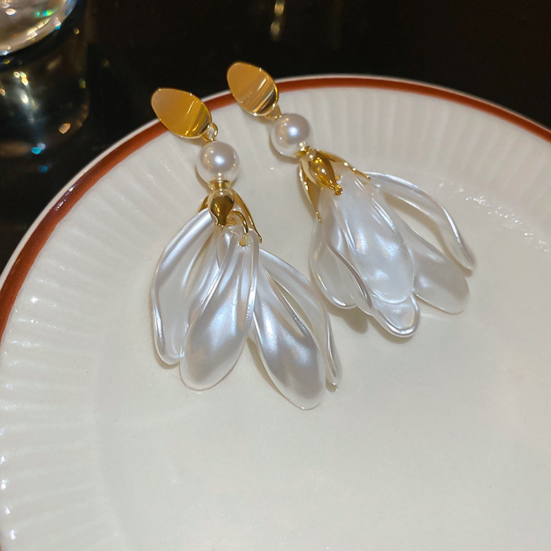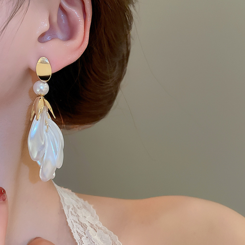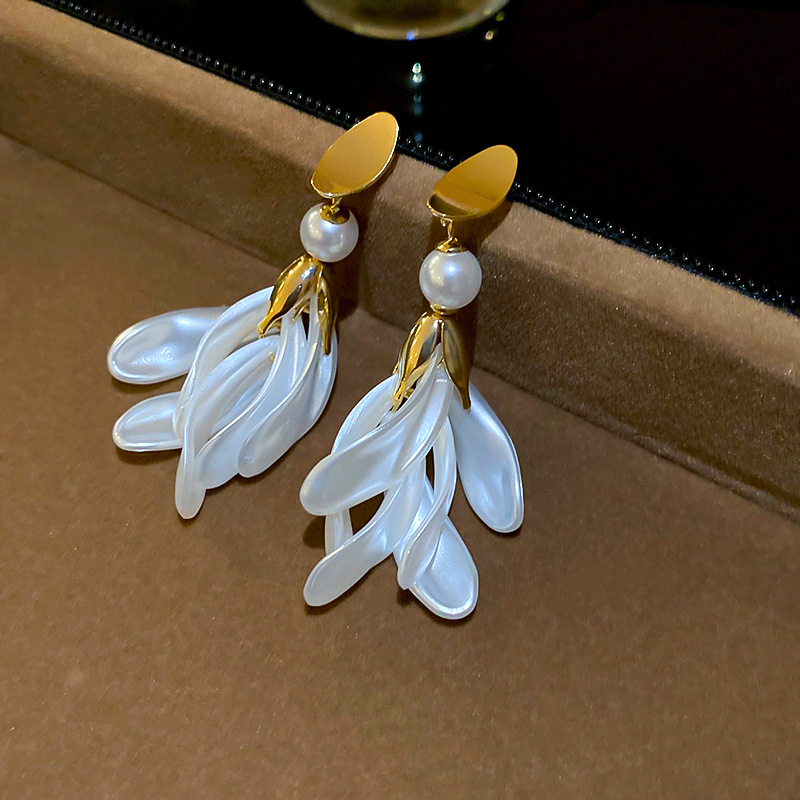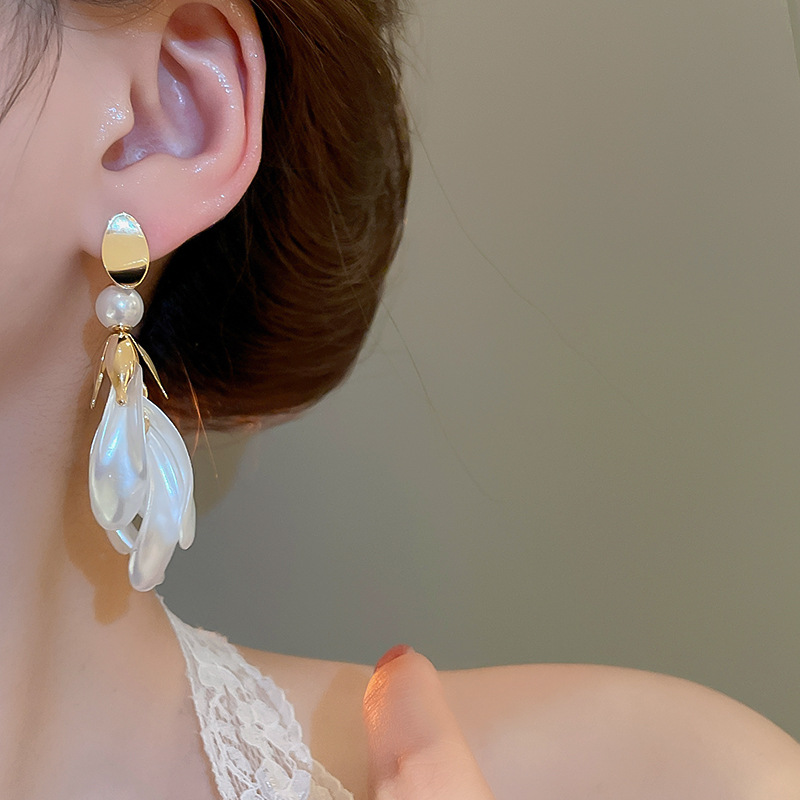 Pendientes de borla de pétalo blanco perla de plata Pendientes largos de moda francesa Pendientes de todo fósforo de alta gama de lujo ligero Mujeres