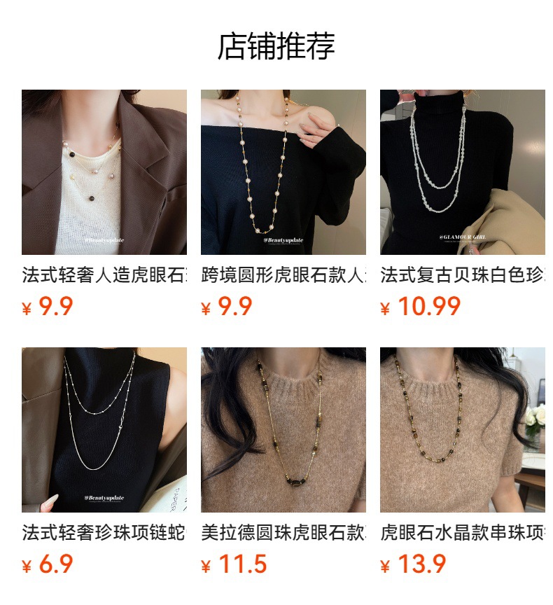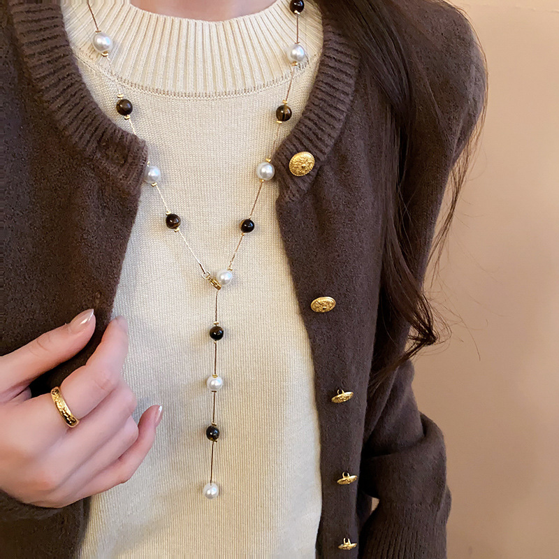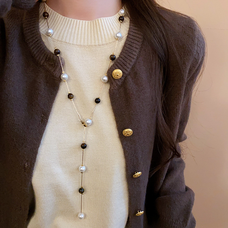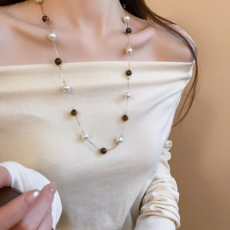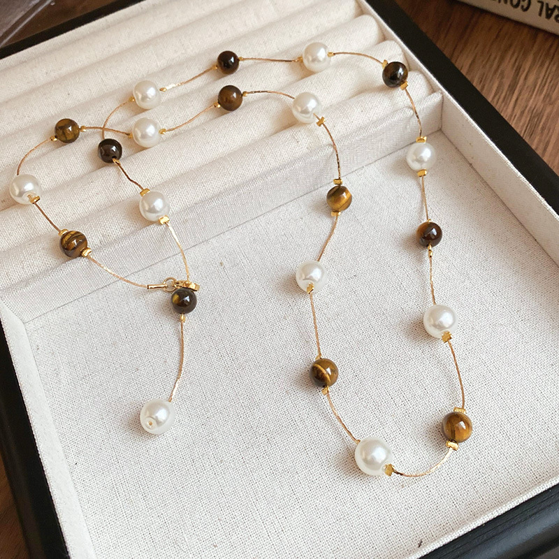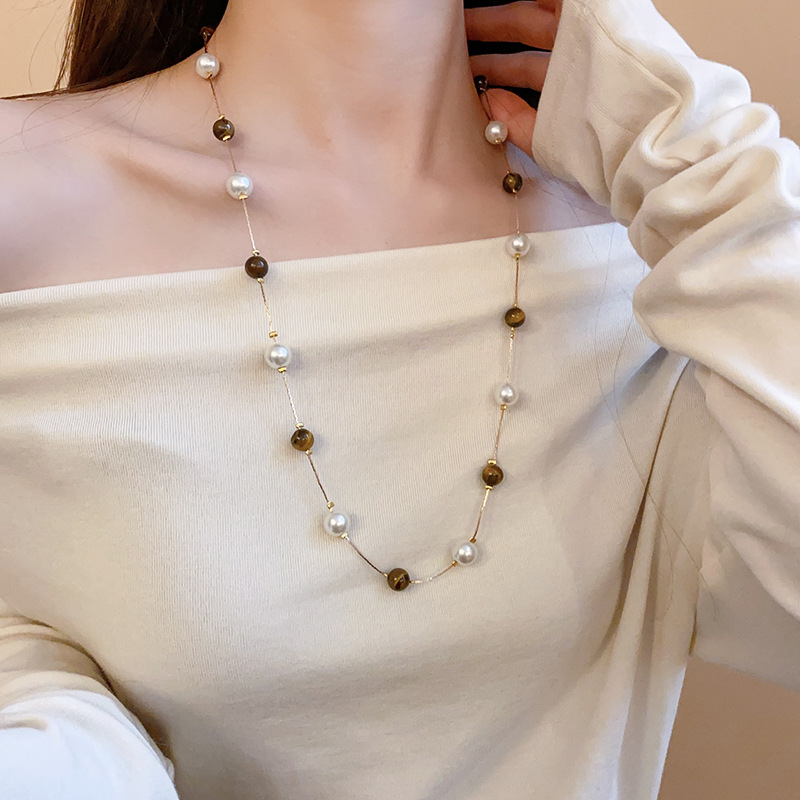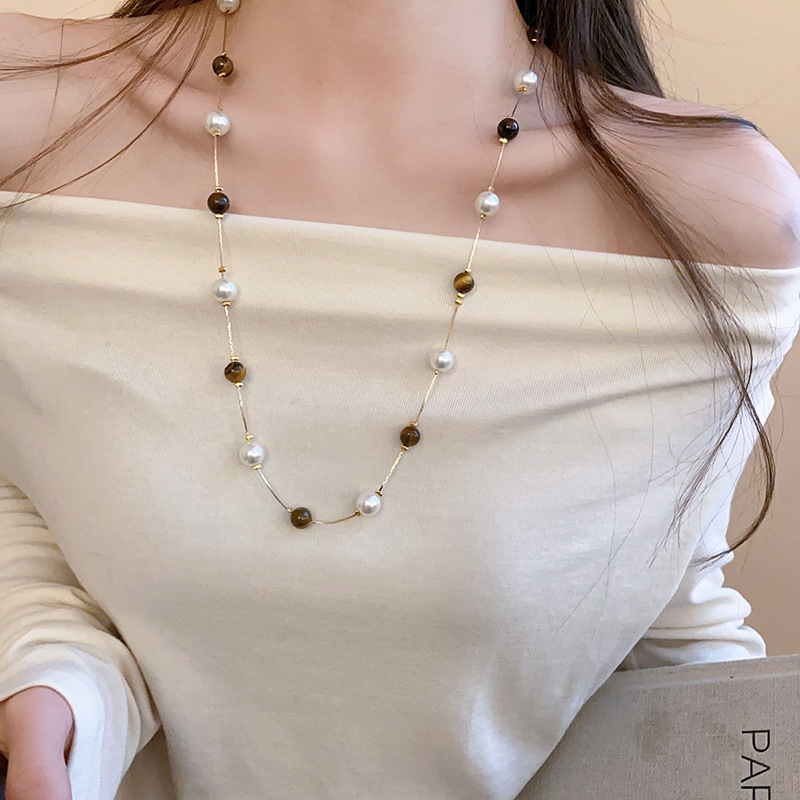 Collar de perlas de piedra de ojo de tigre artificial transfronterizo otoño e invierno cadena de suéter de todo fósforo de nicho accesorios de joyería de moda de alta gama