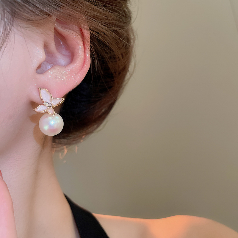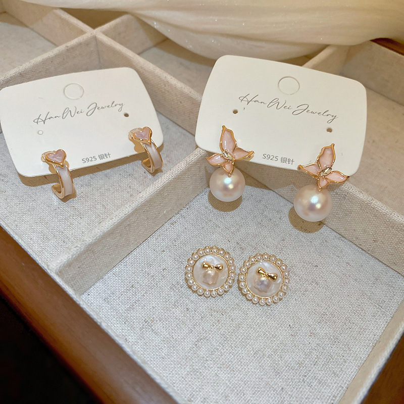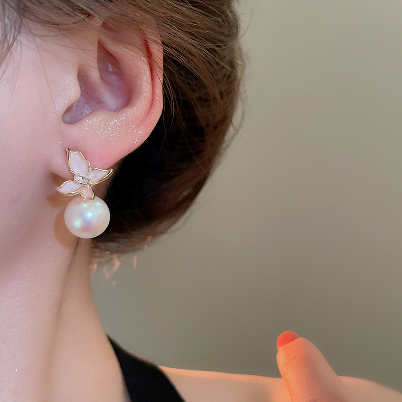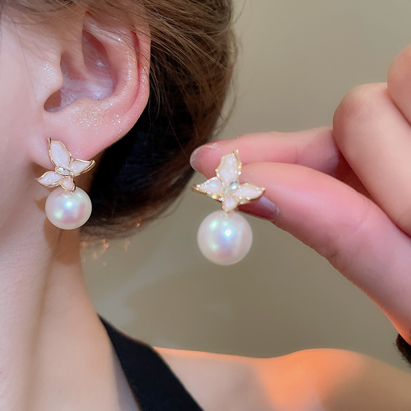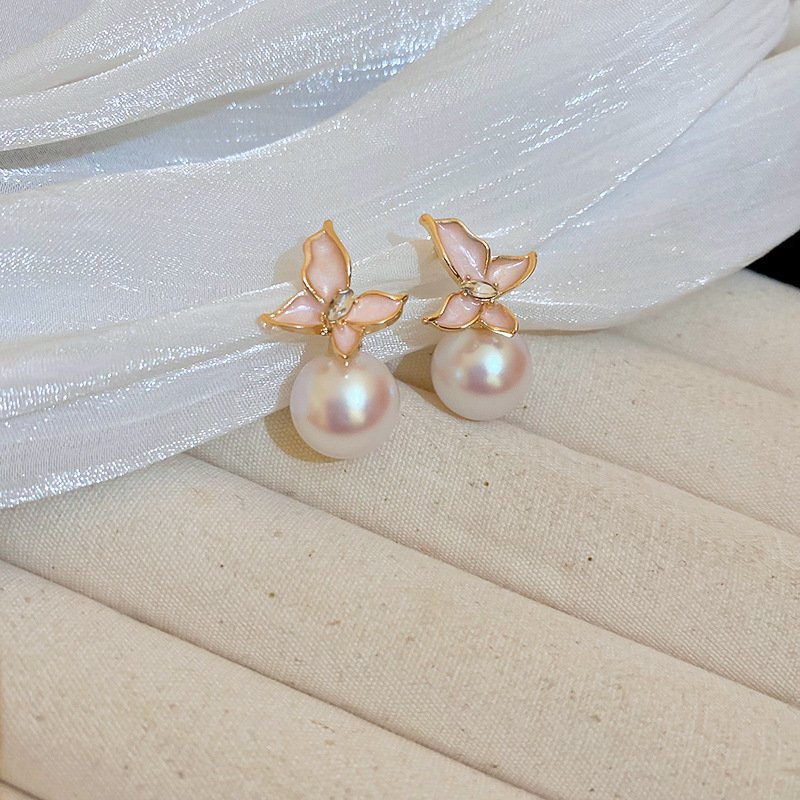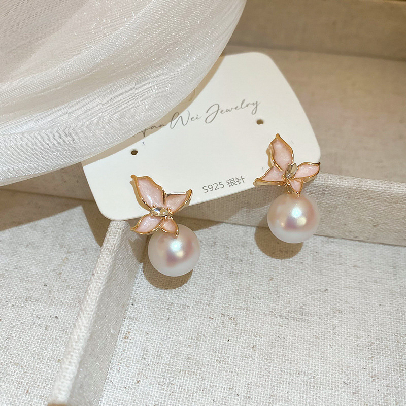 Aguja de plata Pendientes de perlas de flores de aceite que gotea rosa Pendientes de moda retro francesa súper hada Pendientes de lujo ligero de alta gama Mujeres