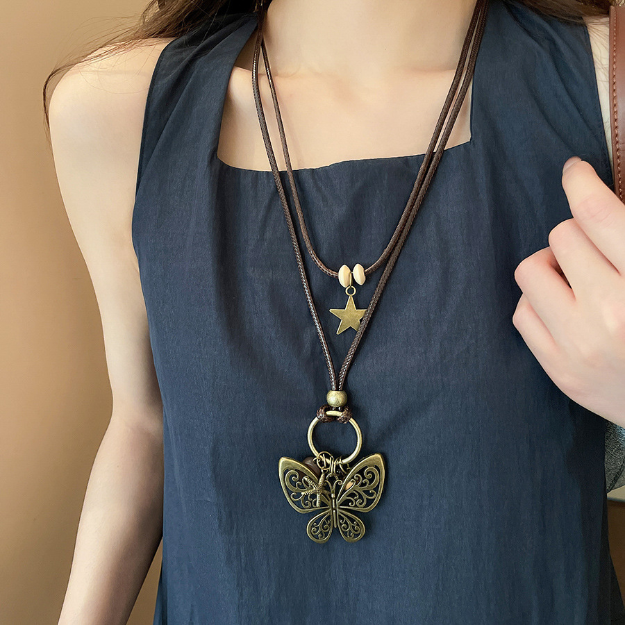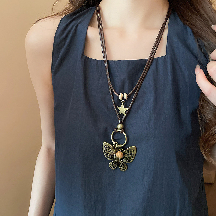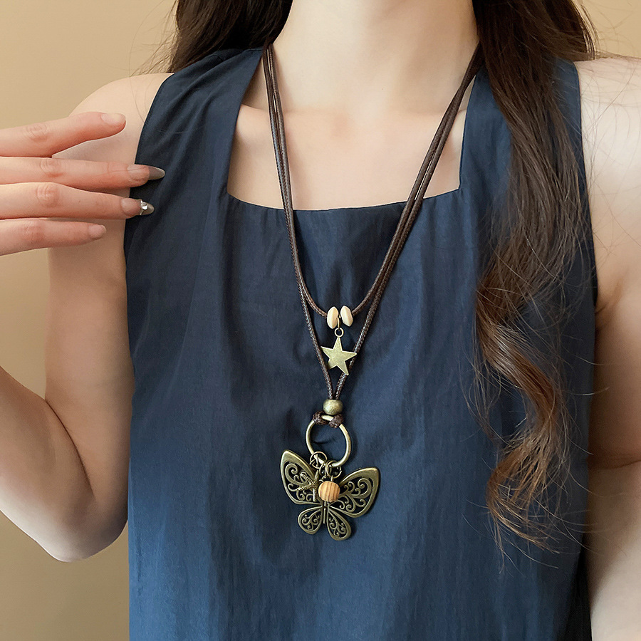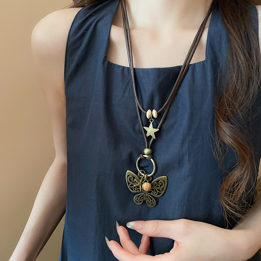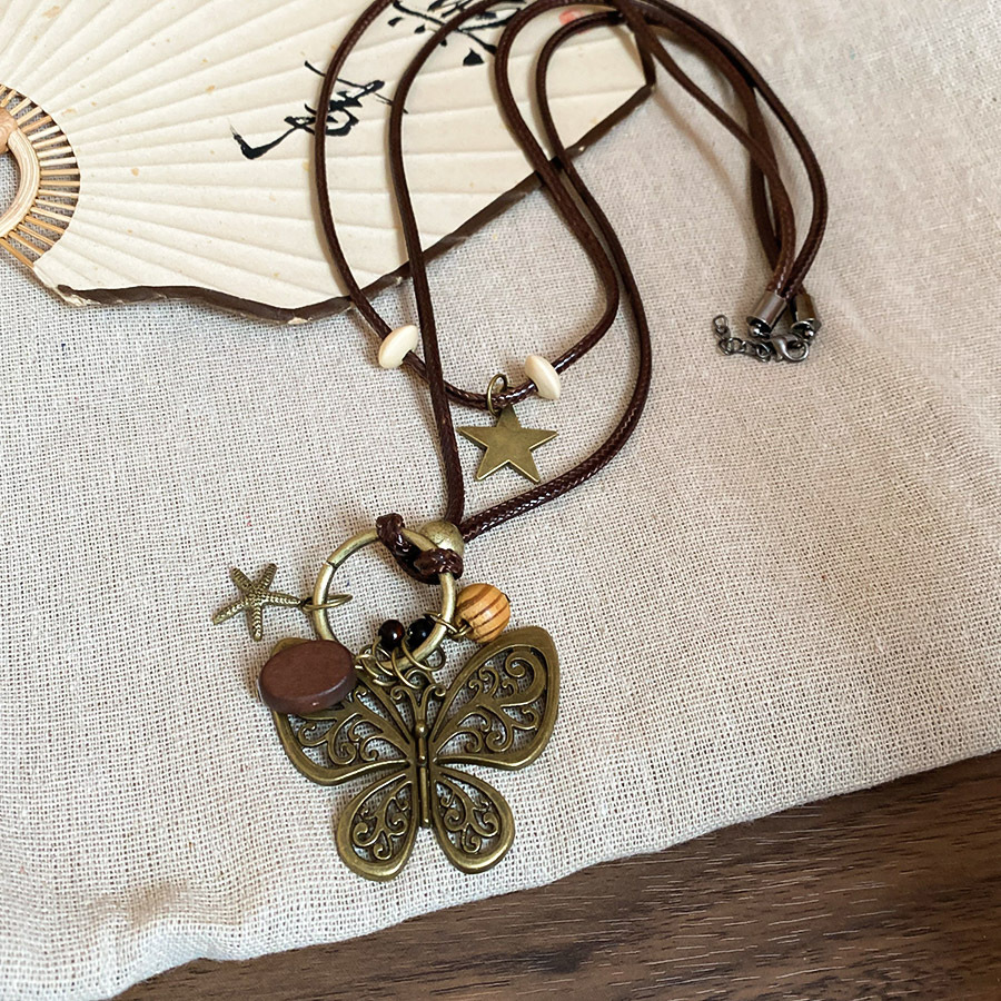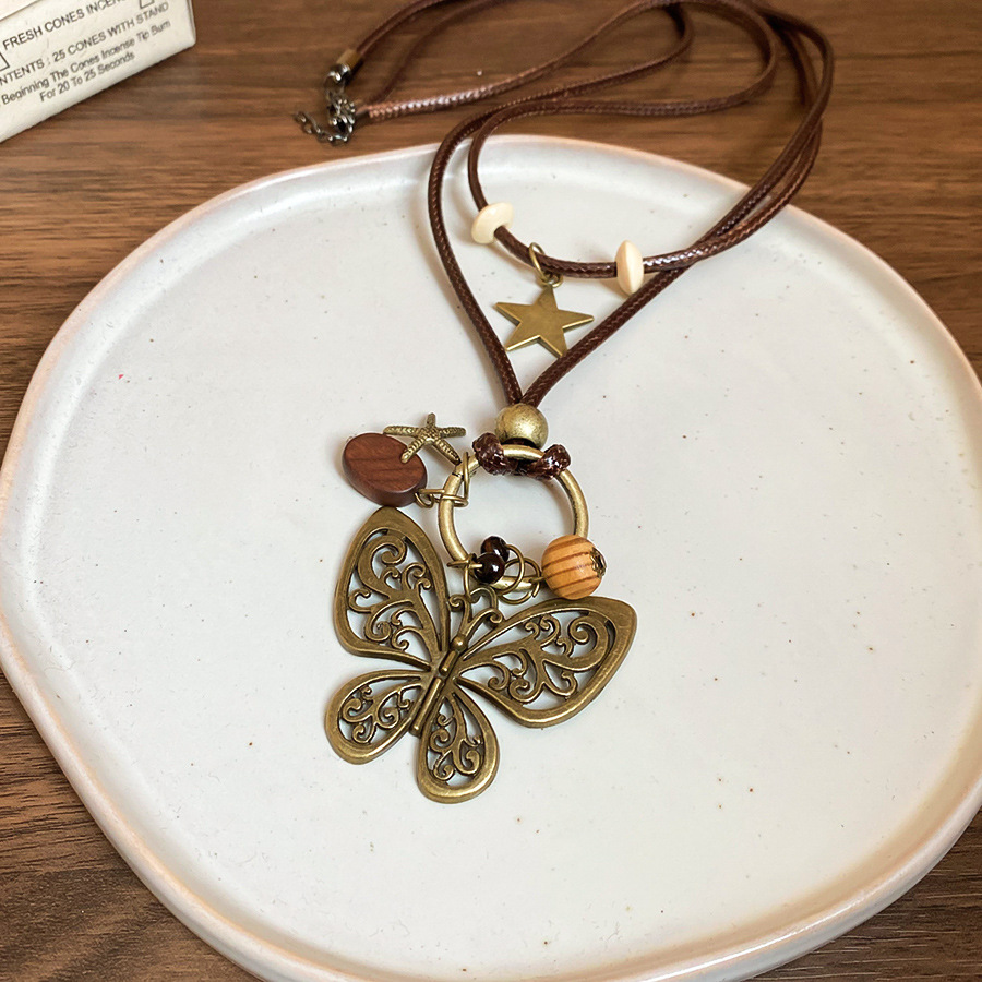 Cuerda de cera, cuentas de madera, colgante de mariposa con cuentas, nuevo estilo chino, temperamento retro, cadena de clavícula, lujo ligero, decoración de estilo de alta gama, mujer