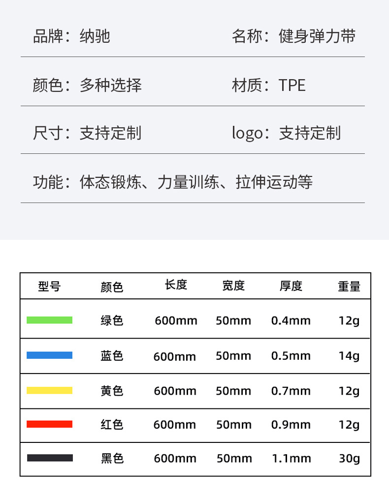 | Colores | 10LB 600*50*0.4mm verde,20LB 600*50*0,5mm azul,30LB 600*50*0.7mm amarillo,40LB 600*50*0,9mm rojo,50LB 600*50*1.1mm negro,Juego de 5 piezas,Juego de 7 piezas (manual de una bolsa de tela de 5 colores),Juego de 5 piezas con marca de fuerza,Juego de 7 piezas con marca de fuerza (manual de una bolsa de tela de 5 colores),Bolsa de tela de 5 piezas,Versión en inglés del manual |