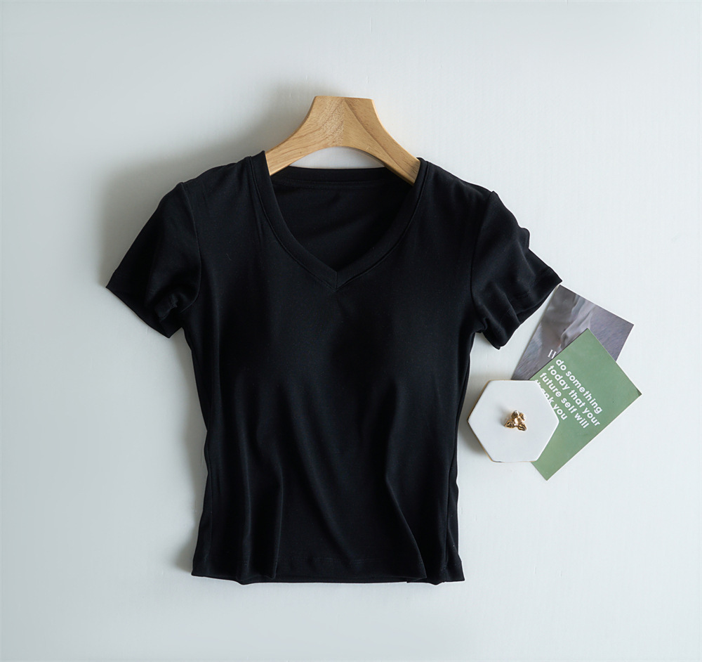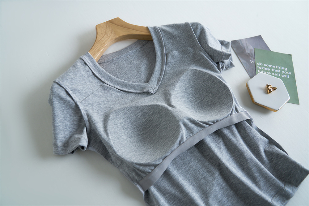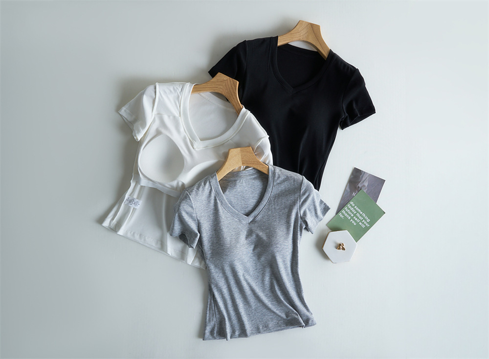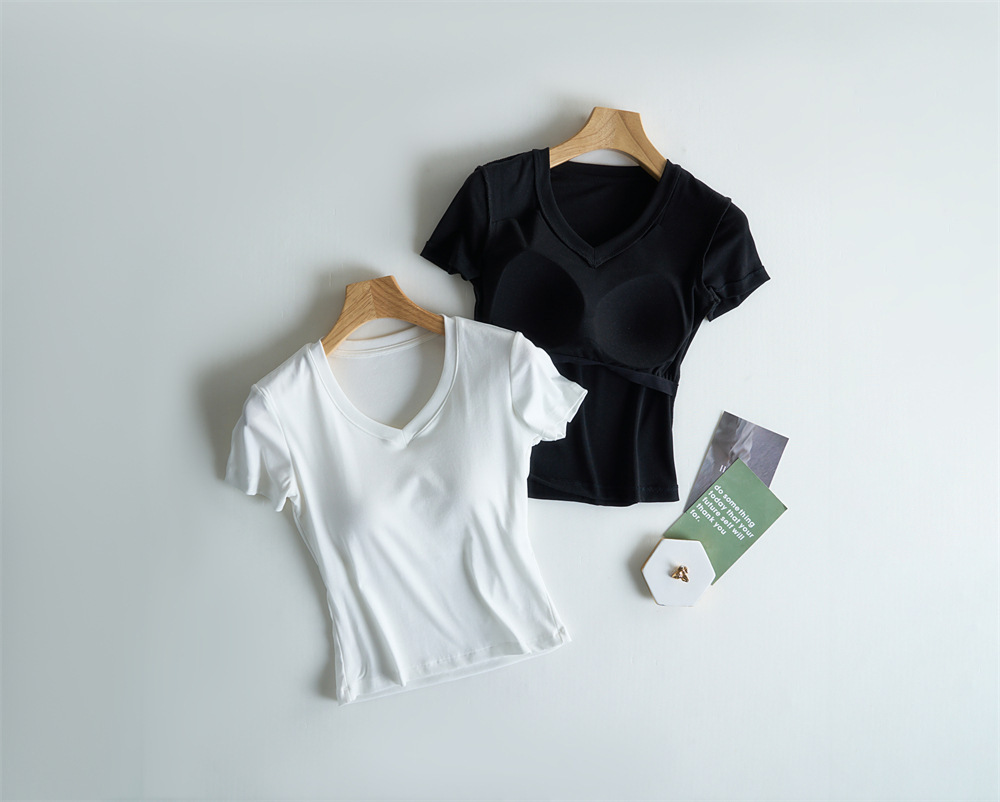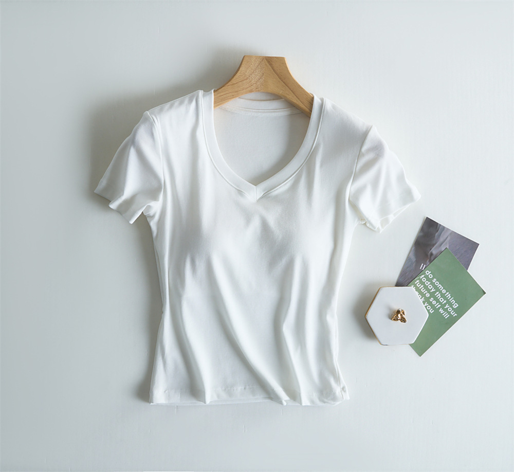 Tensei Lesser Almohadilla para el pecho con cinturón de algodón para mujer Camiseta blanca de manga corta con cuello en V para mujer Verano nuevo top casual de nicho de hombro
