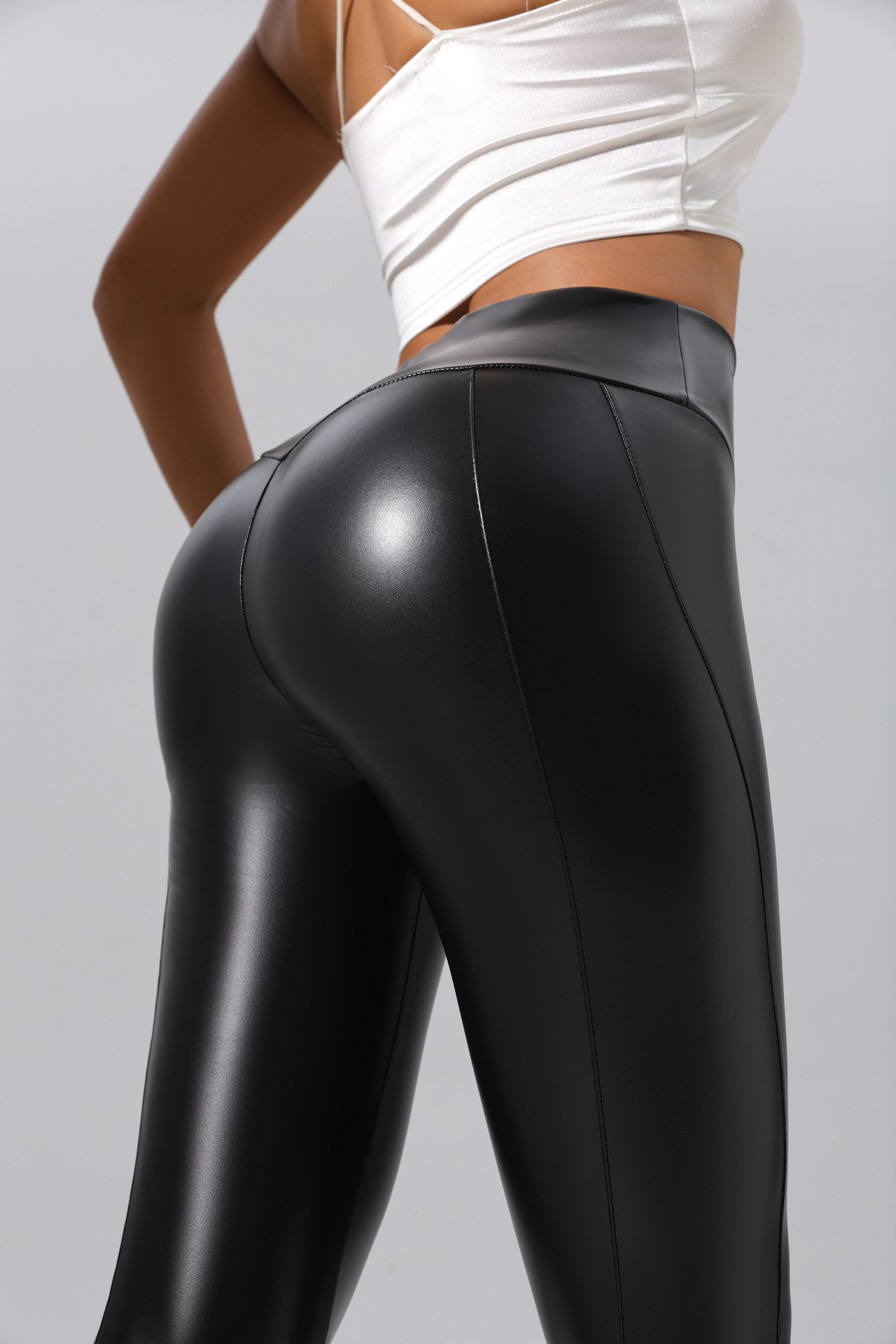 Spot nuevos pantalones de cuero de PU transfronterizos europeos y americanos de alta elasticidad, pantalones ajustados negros brillantes de color sólido, pantalones de yoga de fitness para correr