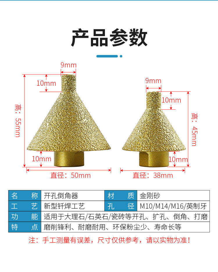 | Especificaciones | [M10] Φ38mm chaflán convencional,[M10] biseladora convencional de Φ50mm,[M10] biseladora de apertura de orificios de Φ38mm,[M10] biseladora de abertura de Φ50mm,[M14] biseladora de apertura de orificios de Φ38mm,[M14] biseladora de abertura de 50mm |