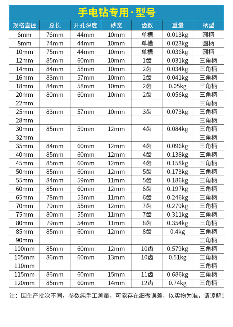 | Modelo | 6MM (amoladora angular),(Amoladora angular) 8MM,10MM (amoladora angular),(Amoladora angular) 12MM,(Amoladora angular) 14MM,16MM (amoladora angular),18MM (amoladora angular),20MM (amoladora angular),(Amoladora angular) 22MM,25MM (amoladora angular),30MM (amoladora angular),(Amoladora angular) 32MM,35MM (amoladora angular),40MM (amoladora angular),(Amoladora angular) 45MM,50MM (amoladora angular),(Amoladora angular) 55MM,60MM (amoladora angular),65MM (amoladora angular),(Amoladora angular) 70MM,(Amoladora angular) 75MM,(Amoladora angular) 80MM,(Amoladora angular) 85MM,(Taladro de mano) 6MM,(Taladro de mano) 8MM,(Taladro de mano) 10MM,(Taladro de mano) 12MM,(Taladro de mano) 14MM,(Taladro de mano) 16MM,(Taladro de mano) 18MM,(Taladro de mano) 20MM,(Taladro de mano) 22MM,(Taladro de mano) 25MM,(Taladro de mano) 28MM,(Taladro de mano) 30MM,(Taladro de mano) 32MM,(Taladro de mano) 35MM,(Taladro de mano) 40MM,(Taladro de mano) 45MM,(Taladro de mano) 50MM,(Taladro de mano) 55MM,(Taladro de mano) 60MM,(Taladro de mano) 65MM,(Taladro de mano) 70MM,(Taladro de mano) 75MM,(Taladro de mano) 80MM,(Taladro de mano) 85MM,(Taladro de mano) 100MM,(Taladro de mano) 110MM,(Taladro de mano) 120MM |