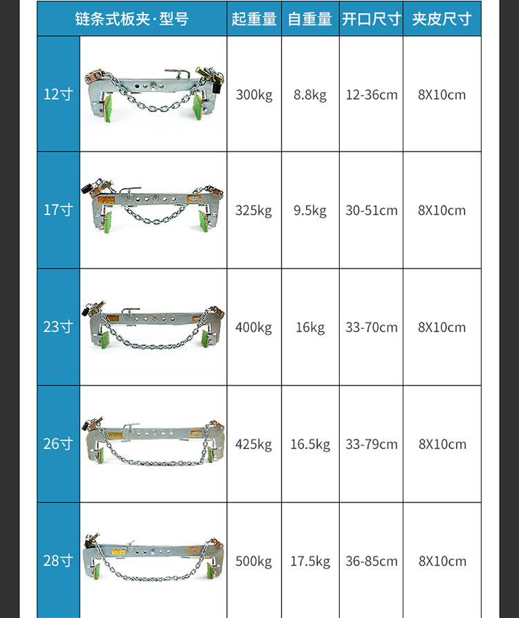 | Especificación | Abrazadera para placa pequeña 285KG,Clip de tablero grande 325kg,Abrazadera de placa de alta resistencia 625KG,Abrazadera de placa de alta resistencia 680KG,Abrazadera de placa de alta resistencia 800KG,Abrazadera de placa súper pesada 1000KG,Tipo colgante 4 pulgadas [apertura 6-12 cm],Tipo de tirante 6 pulgadas [apertura 12-18 cm],Tipo de tirante 8 pulgadas [apertura 16-24 cm],Tipo de tirante 10 pulgadas [apertura 24-30 cm],Tipo de cadena 12 pulgadas [apertura 12-36 cm],Tipo de cadena 17 pulgadas [apertura 30-51 cm],Tipo de cadena 23 pulgadas [apertura 33-70 cm],Tipo de cadena 26 pulgadas [apertura 33-79 cm],Tipo de cadena 28 pulgadas [apertura 36-85 cm],Tipo de cadena de 32 pulgadas [abertura 42-98cm],Tipo de cadena 36 pulgadas [apertura 42-109 cm],Tipo de cadena 42 pulgadas [apertura 66-127 cm],Tipo de cadena 47 pulgadas [apertura 69-141 cm],Clip de cuero universal de 4-50 pulgadas (1 pieza) |