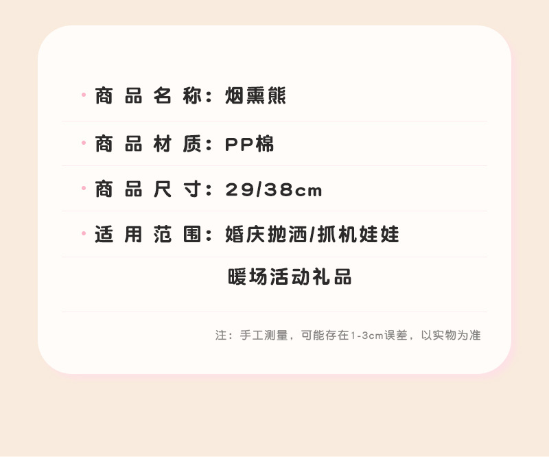 | Color | Osos ahumados 29 cm (sentados), osos ahumados 38 cm (sentados) |