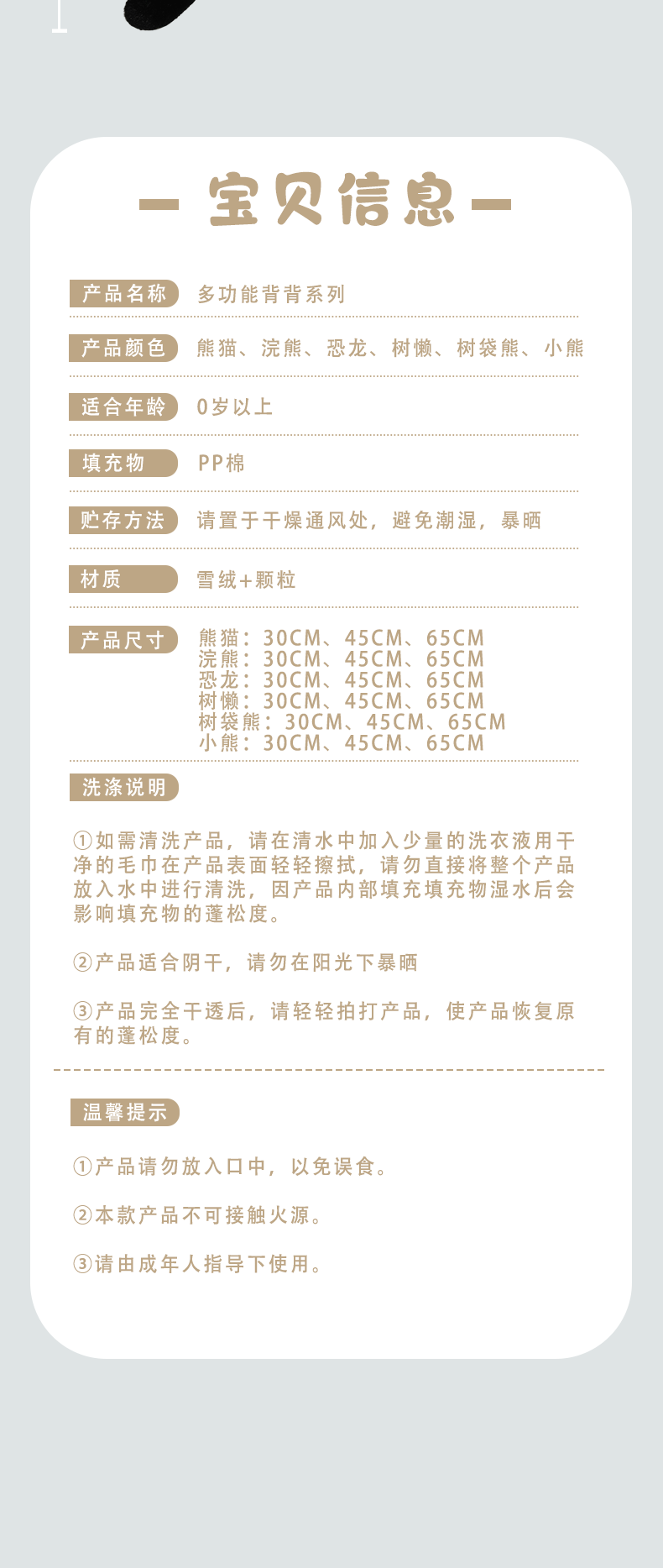 | Colores | Bolso de hombro portátil Koala (25*20*15 cm),Bolso de hombro de mano perezoso (25*20*15 cm),Mochila perezosa (38*20*15 cm),Mochila koala (38*20*15 cm) |