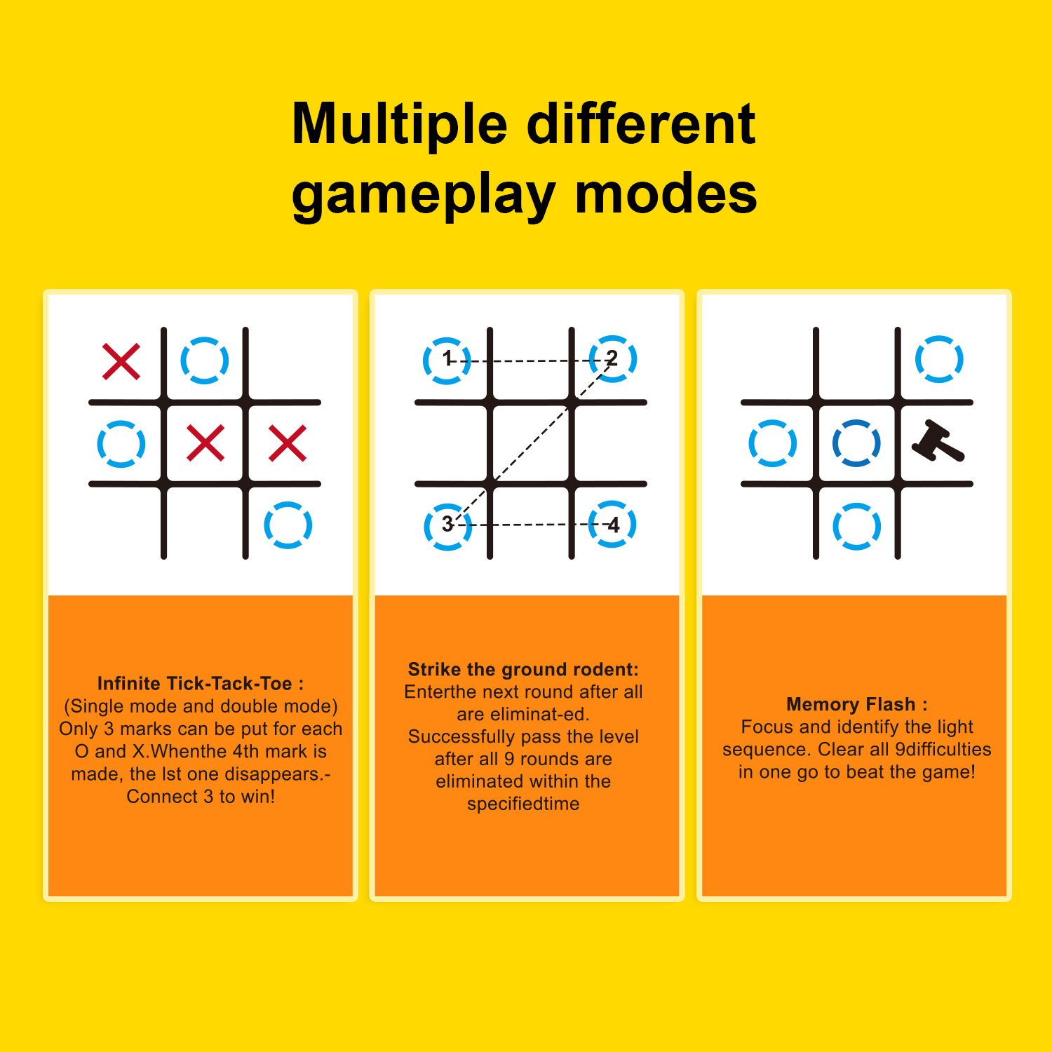 | Colores | Tic Toe (cuadrado amarillo),Tic Toe (cuadrado naranja),Tic Toe (cuadrado verde),Tic Toe (cuadrado rosa),Tic Toe (cuadrado azul),Tic Toe (amarillo hexagrama),Tic-Tac-Tac-Tac (naranja de seis cuadrados),Tic-Tac-Tac-Tac (verde hexa cuadrado),Tic-Tac-Tac-Tac (rosa hexa cuadrado),Tic-Tac-Tac-Tac (azul hexa cuadrado) |