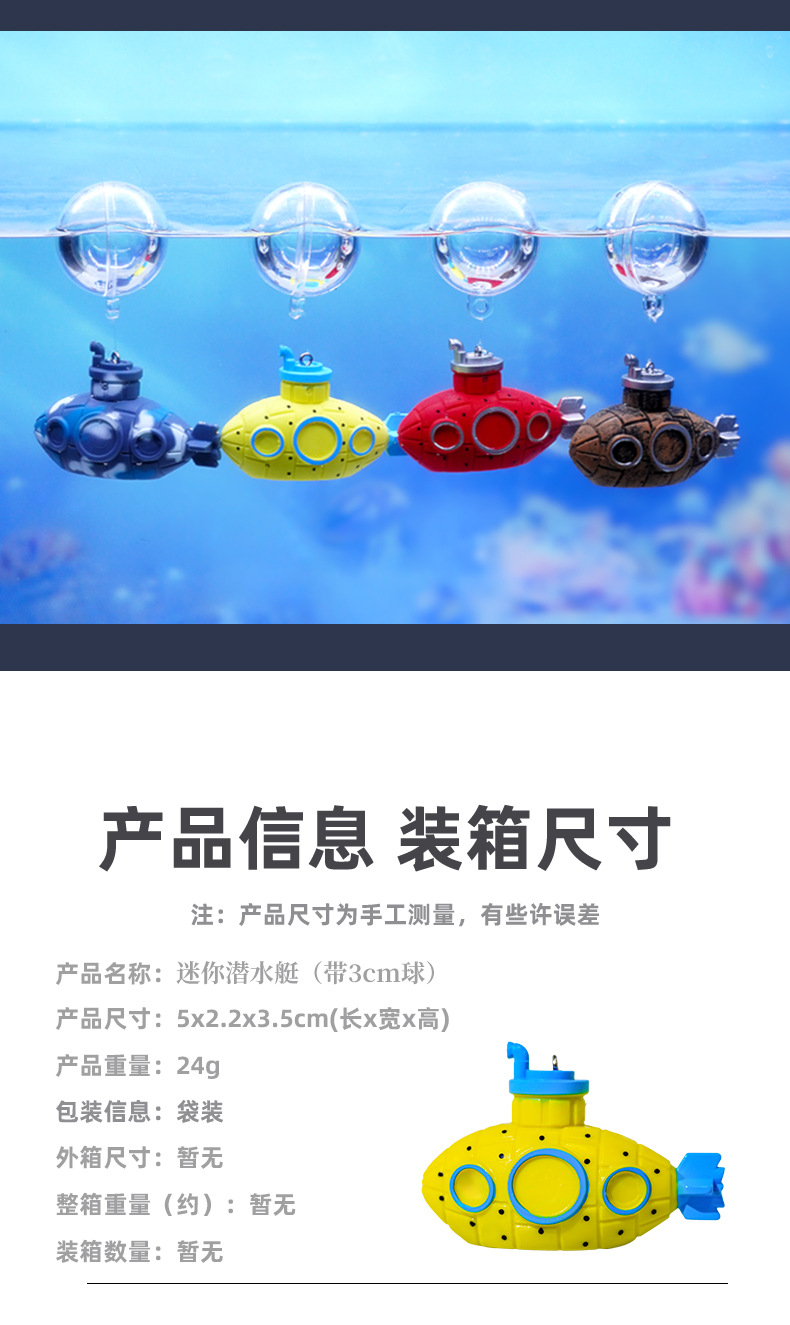 | Especificaciones | Mini submarino de bronce (con línea de bola de 3cm),Mini submarino rojo (con línea de bola de 3cm),Mini submarino amarillo (con línea de bola de 3cm),Mini submarino de camuflaje (con línea de bola de 3cm) |