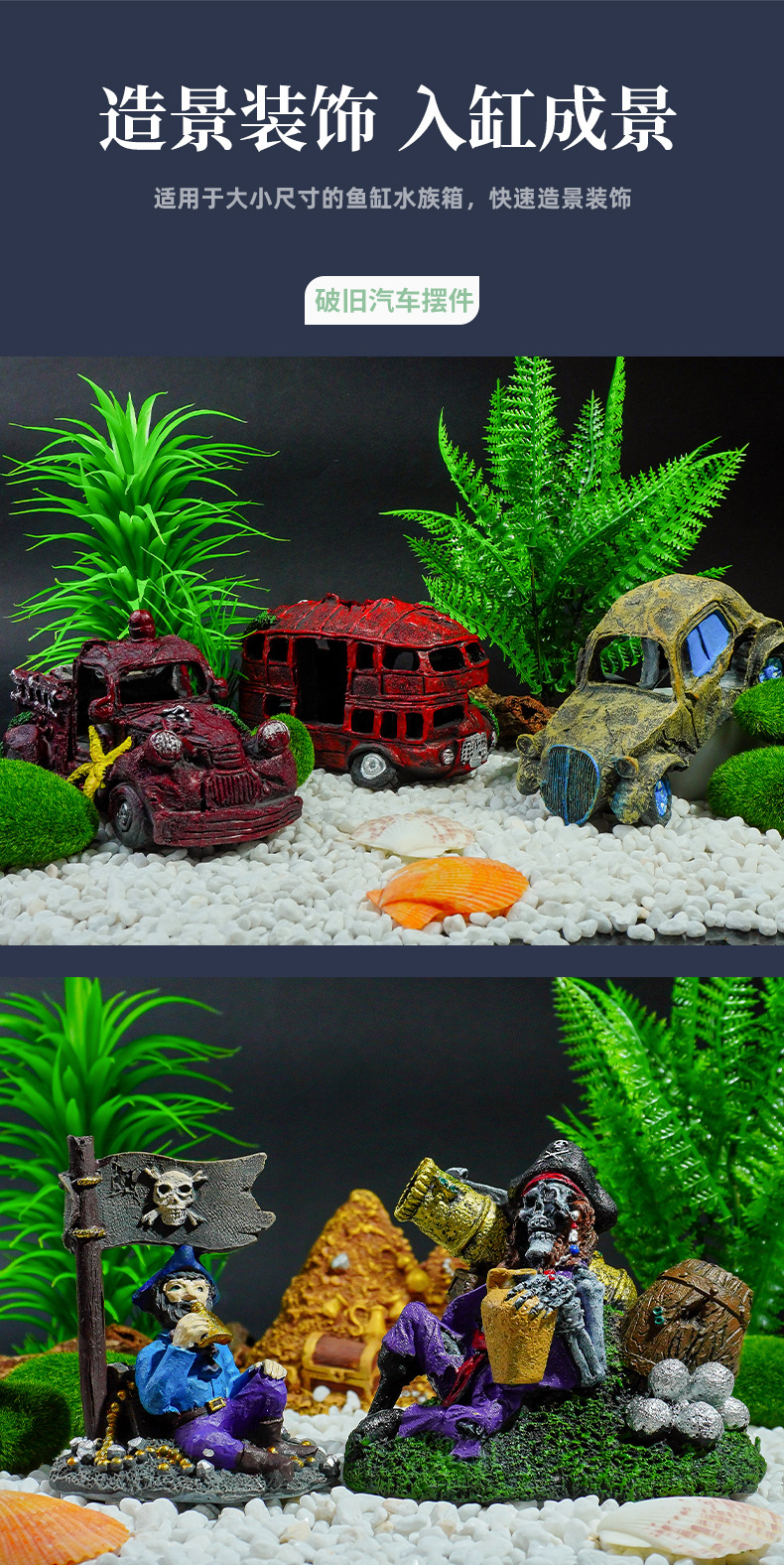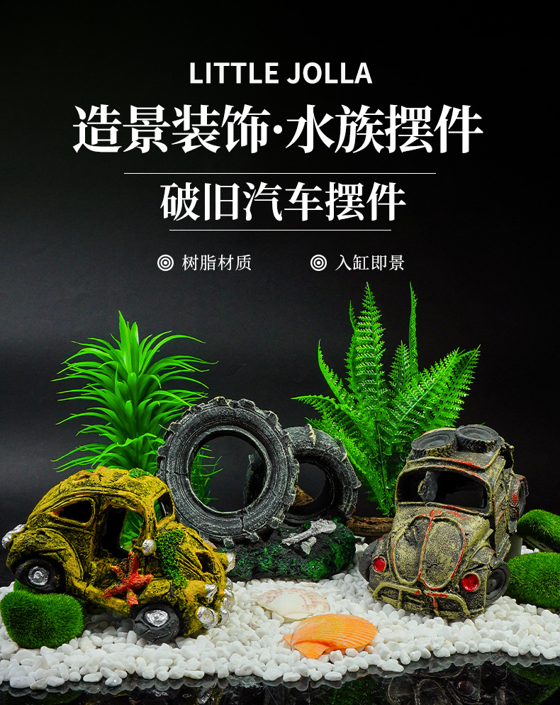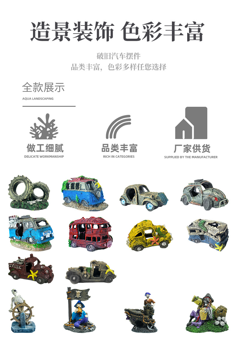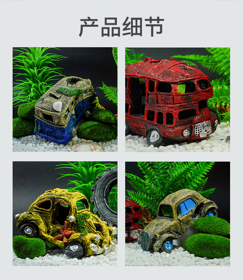 Decoración de acuarios restos de automóviles, paisajismo de peceras, artesanías de resina, nuevas decoraciones evasivas, autobuses viejos