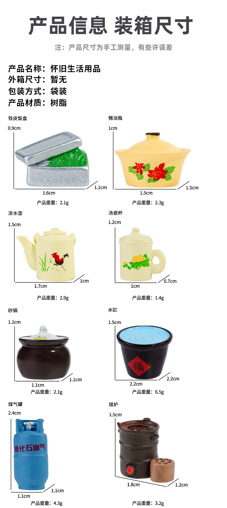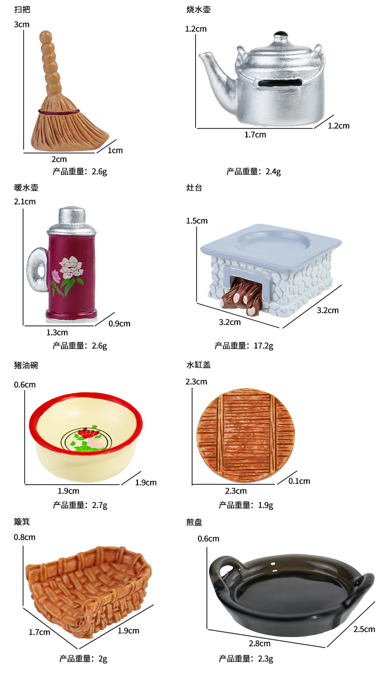 | Colores | Fiambrera de hojalata,Botella de aceite de cerdo,Botella de agua fría,Taza de sopa de porcelana,Cazuela,Tanque de agua,Tanque de gas,Estufa de carbón,Escoba,Hervidor de agua,Hervidor de agua caliente,Estufa,Tazón de manteca de cerdo,Culata de agua,Recogedor,Placa para freír |