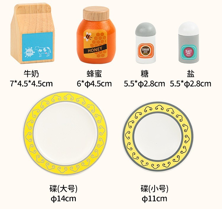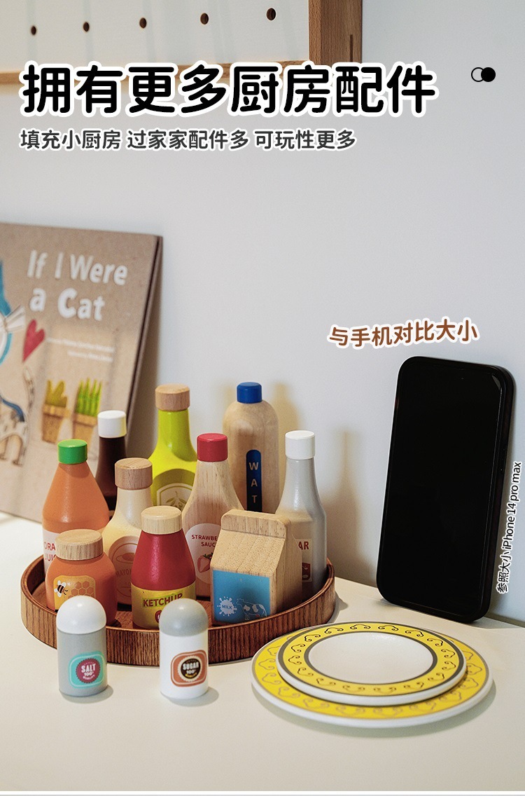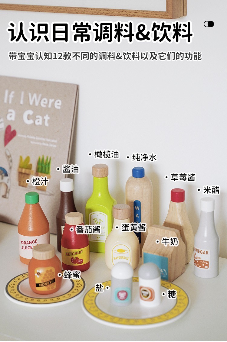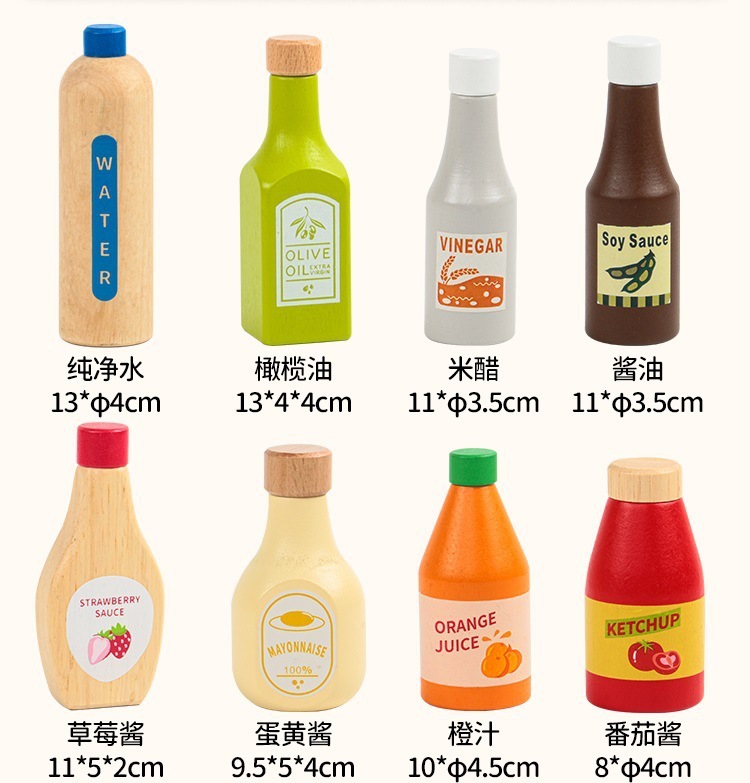 Botella de condimento de juego, juguetes, accesorios de cocina, platos de madera, juegos de niños, botellas de bebidas, botellas de leche con salsa