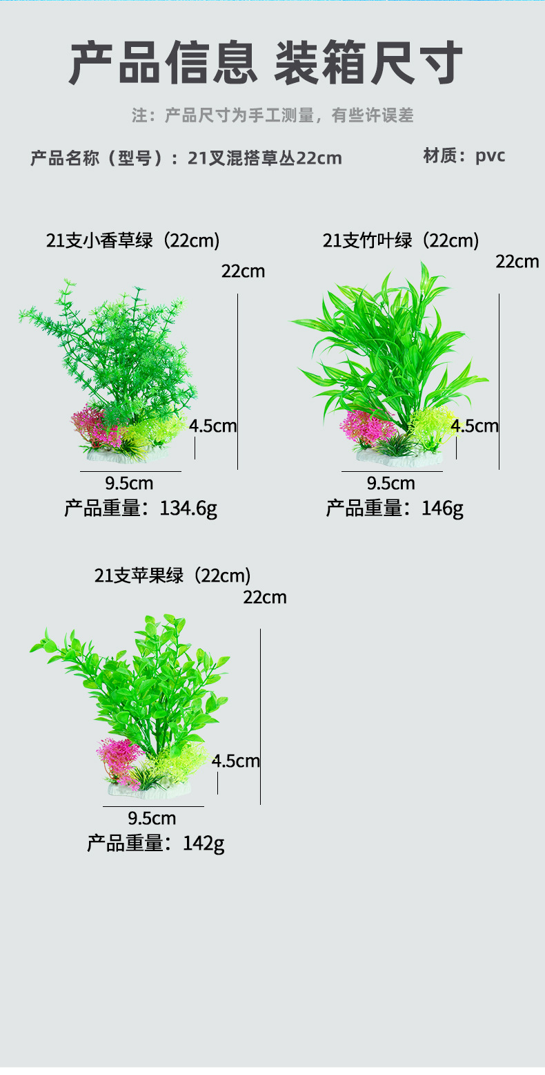 | Especificaciones | 21 pequeñas hierbas verdes (22cm),21 hojas de bambú verde (22cm),21 manzanas verdes (22cm) |