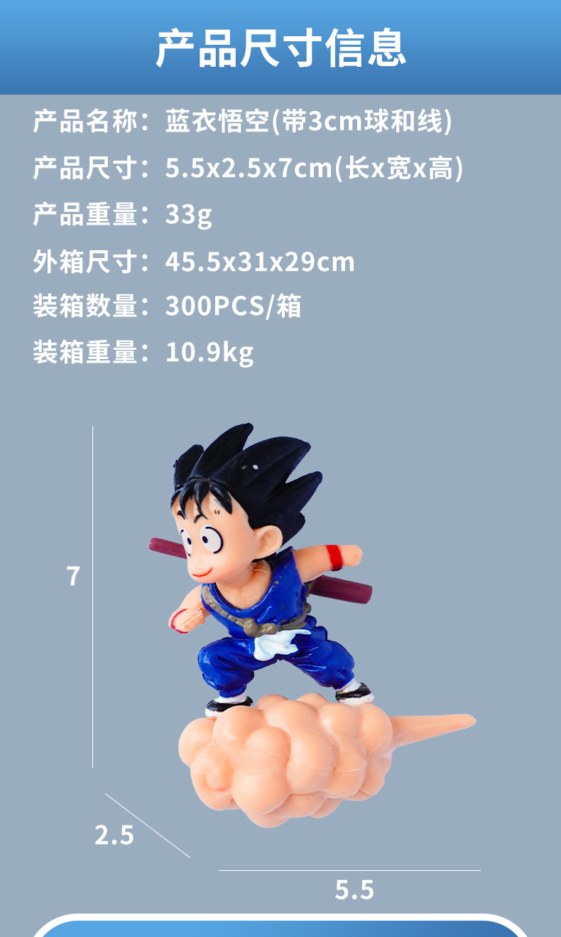 | Especificación | Goku rojo (con hilo de pescar y pelota),Goku en azul (con hilo de pescar y pelota),Patrón de tigre Goku (con hilo de pescar y pelota),Goku con ropa verde y pelo morado (con hilo de pescar y pelota),Tao Baibai (con hilo de pescar y pelota) |
