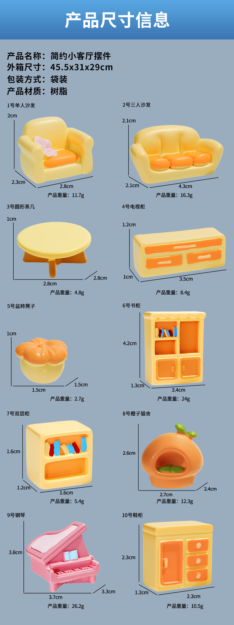 | Colores | Sofá individual No. 1,Sofá triple n ° 2,Mesa de centro redonda No. 3,Mueble de TV No. 4,Taburete de caqui n. ° 5,Librería No. 6,Gabinete doble No. 7,Cata naranja No. 8,Piano No. 9,Zapatero No. 10 |