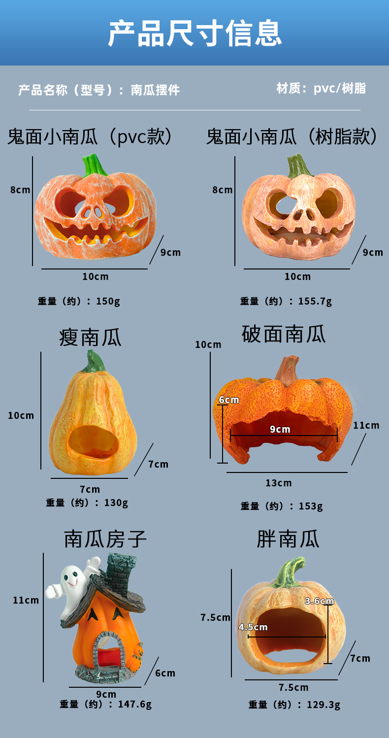 | Especificación | Calabaza gorda/PVC,Calabaza fina/PVC,Calabaza mediana rota/Resina,Casa de calabaza (Casa embrujada)/Resina,Pequeña calabaza con cara fantasma/pvc |
