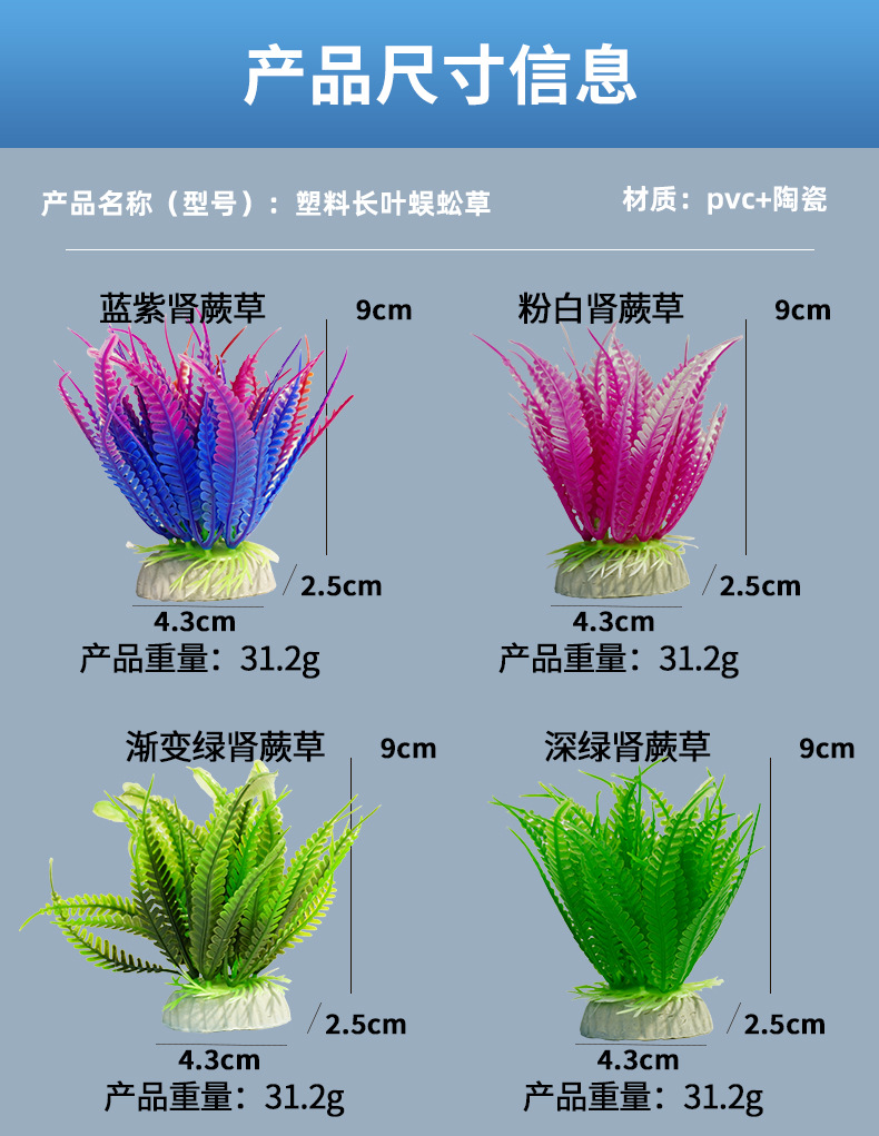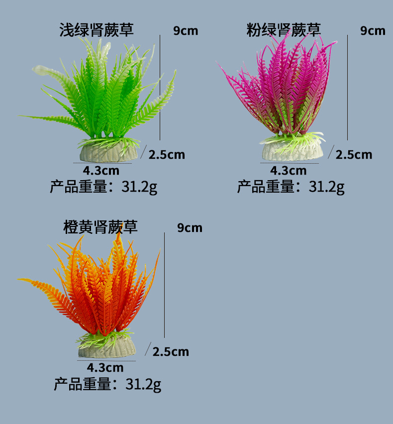 | Especificaciones | Helecho de riñón azul violeta,Helecho de riñón blanco en polvo,Hierba de helecho de riñón verde degradado,Hierba de helecho de riñón verde oscuro,Hierba de helecho de riñón verde claro,Helecho de riñón verde rosa,Hierba de riñón amarillo anaranjado |